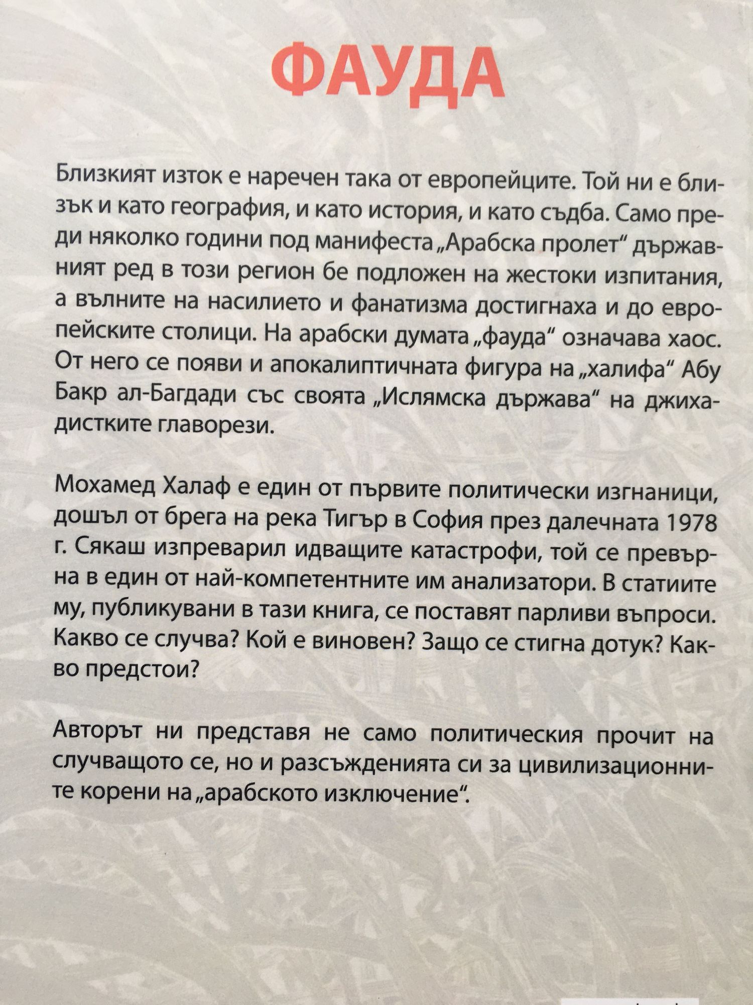 Близкият изток е наречен така от европейците. Той ни е близък и като география, и като история, и като съдба. Само преди няколко години под манифеста „Арабска пролет“ държавният ред в този регион бе подложен на жестоки изпитания, а вълните на насилието и фанатизма достигнаха и до европейските столици. На арабски думата „фауда“ означава хаос. От него се появи и апокалиптичната фигура на „халифа“ Абу Бакр ал-Багдади със своята „Ислямска държава“ на джихадистките главорези. Мохамед Халаф е един от първите политически изгнаници, дошъл от брега на река Тигър в София през далечната 1978 г. Сякаш изпреварил идващите катастрофи, той се превърна в един от най-компетентните им анализатори. В статиите му, публикувани в тази книга, се поставят парливи въпроси. Какво се случва? Кой е виновен? Защо се стигна дотук? Какво предстои? Авторът ни представя не само политическия прочит на случващото се, но и разсъжденията си за цивилизационните корени на „арабското изключение“.