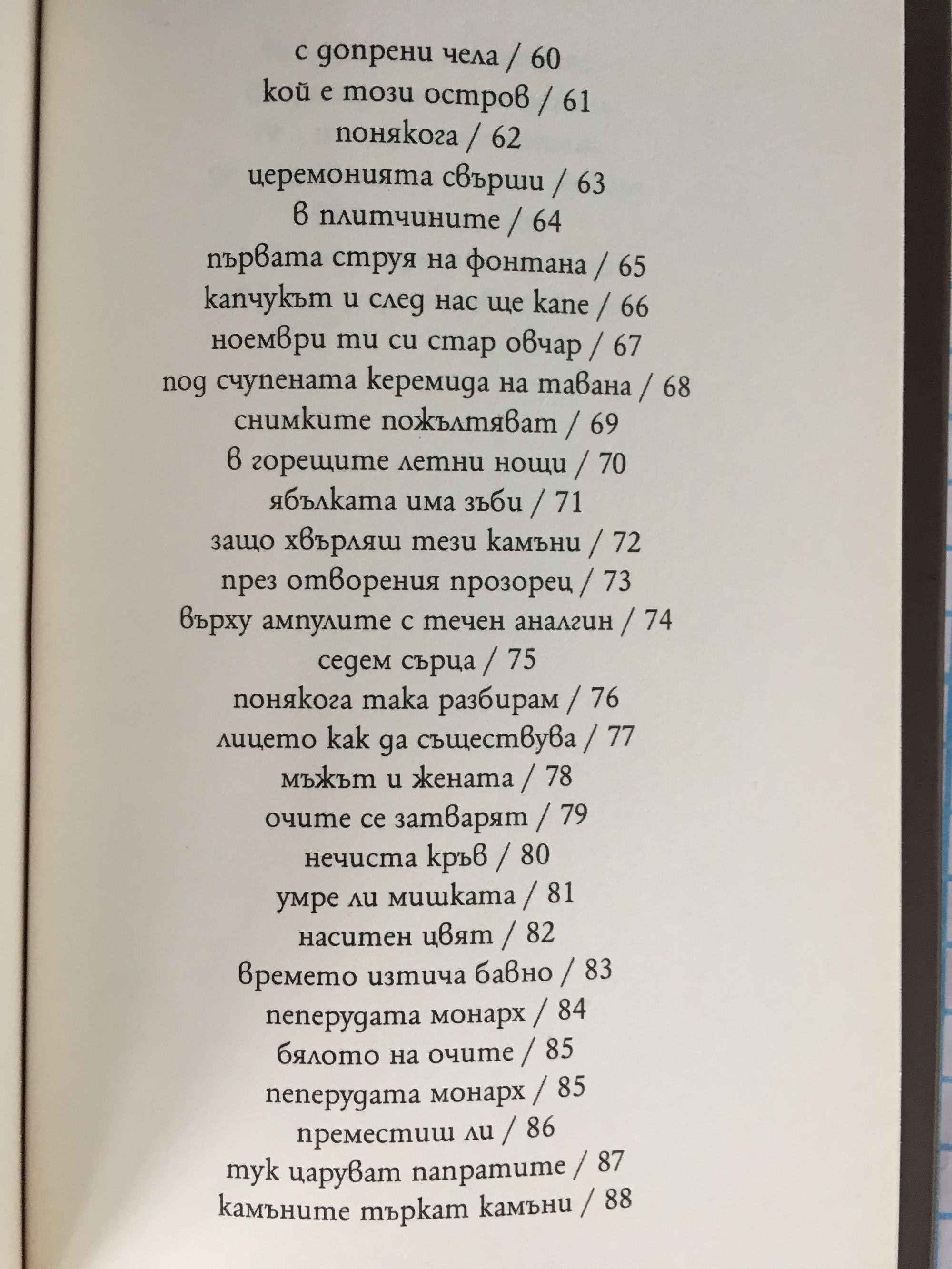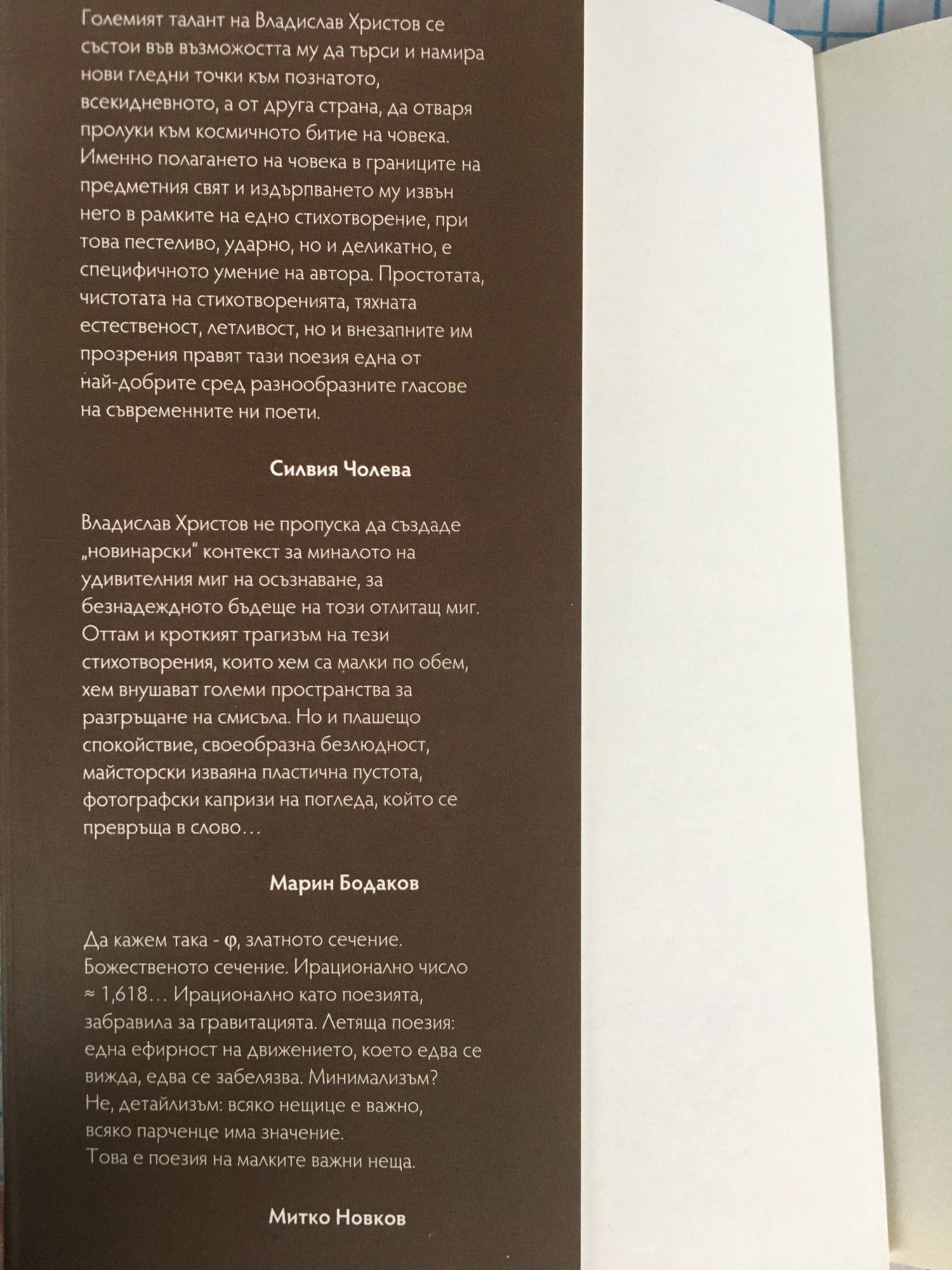 Големият талант на Владислав Христов се състои във възможността му да търси и намира нови гледни точки към познатото, всекидневното, а от друга страна, да отваря пролуки към космичното битие на човека. Именно полагането на човека в границите на предметния свят и издърпването му извън него в рамките на едно стихотворение, при това пестеливо, ударно, но и деликатно, е специфичното умение на автора. Простотата, чистотата на стихотворенията, тяхната естественост, летливост, но и внезапните им прозрения правят тази поезия една от най-добрите сред разнообразните гласове на съвременните ни поети. Силвия Чолева Владислав Христов не пропуска да създаде „новинарски” контекст за миналото на удивителния миг на осъзнаване, за безнадеждното бъдеще на този отлитащ миг. Оттам и кроткият трагизъм на тези стихотворения, които хем са малки по обем, хем внушават големи пространства за разгръщане на смисъла. Но и плашещо спокойствие, своеобразна безлюдност, майсторски изваяна пластична пустота, фотографски капризи на погледа, който се превръща в слово... Марин Бодаков Да кажем така - ?, златното сечение. Божественото сечение. Ирационално число ? 1,618… Ирационално като поезията, забравила за гравитацията. Летяща поезия: една ефирност на движението, което едва се вижда, едва се забелязва. Минимализъм? Не, детайлизъм: всяко нещице е важно, всяко парченце има значение. Това е поезия на малките важни неща. Митко Новков Владислав Христов е роден през 1976 г. в гр. Шумен. Живее и работи като журналист в София. Има многобройни публикации в периодичния литературен печат – „Granta”, „Литературен вестник”, „Съвременник”, „Страница”, „Факел”, „ЛИК” и др. Три поредни години е в класацията на 100-те най-креативни хайку автори в Европа. Негови хайку са публикувани в изданията на Американската хайку асоциация „Frogpond”, Световния хайку клуб „World Haiku Review”, както и в мн. др., част са от международни антологии и сборници. Текстове му са издавани на английски, немски, френски, испански, италиански, японски, руски, хърватски, арабски и унгарски езици. Организатор е на много инициативи, свързани с популяризирането на хайку в България.