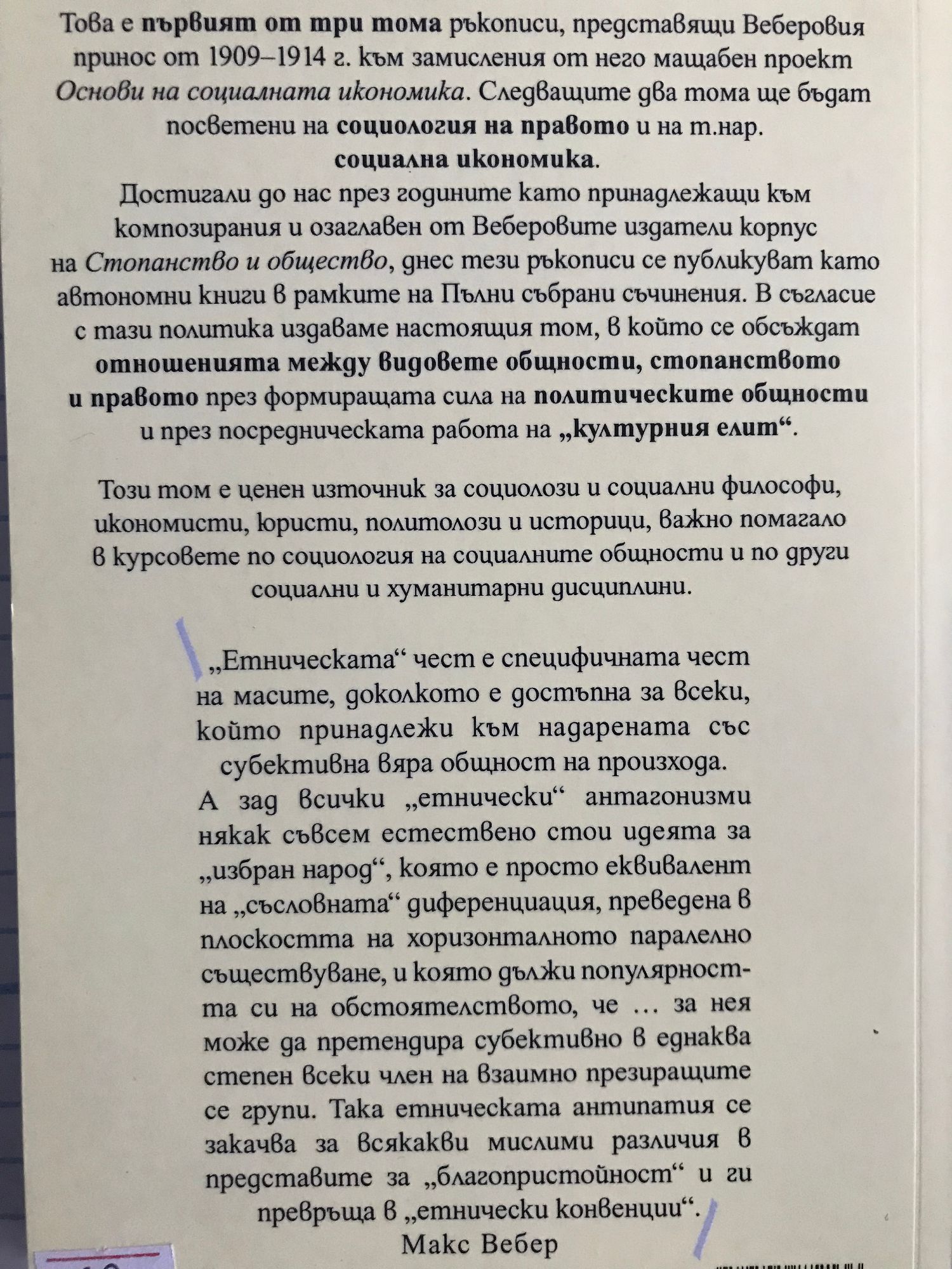 Това е първият от три тома ръкописи, представящи Веберовия принос от 1909-1914 г. към замисления от него мащабен проект "Основи на социалната икономика". Следващите два тома ще бъдат посветени на социология на правото и на т.нар. социална икономика. Достигали до нас през годините като принадлежащи към композирания и озаглавен от Веберовите издатели корпус на "Стопанство и общество", днес тези ръкописи се публикуват като автономни книги в рамките на Пълни събрани съчинения. В съгласие с тази политика издаваме настоящия том, в който се обсъждат отношенията между видовете общности, стопанството и правото през формиращата сила на политическите общности и през посредническата работа на „културния елит". Този том е ценен източник за социолози и социални философи, икономисти, юристи, политолози и историци, важно помагало в курсовете по социология на социалните общности и по други социални и хуманитарни дисциплини. „Етническата" чест е специфичната чест на масите, доколкото е достъпна за всеки, който принадлежи към надарената със субективна вяра общност на произхода. А зад всички „етнически" антагонизми някак съвсем естествено стои идеята за „избран народ", която е просто еквивалент на „съсловната" диференциация, преведена в плоскостта на хоризонталното паралелно съществуване, и която дължи популярността си на обстоятелството, че ... за нея може да претендира субективно в еднаква степен всеки член на взаимно презиращите се групи. Така етническата антипатия се закачва за всякакви мислими различия в представите за „благопристойност" и ги превръща в „етнически конвенции".
