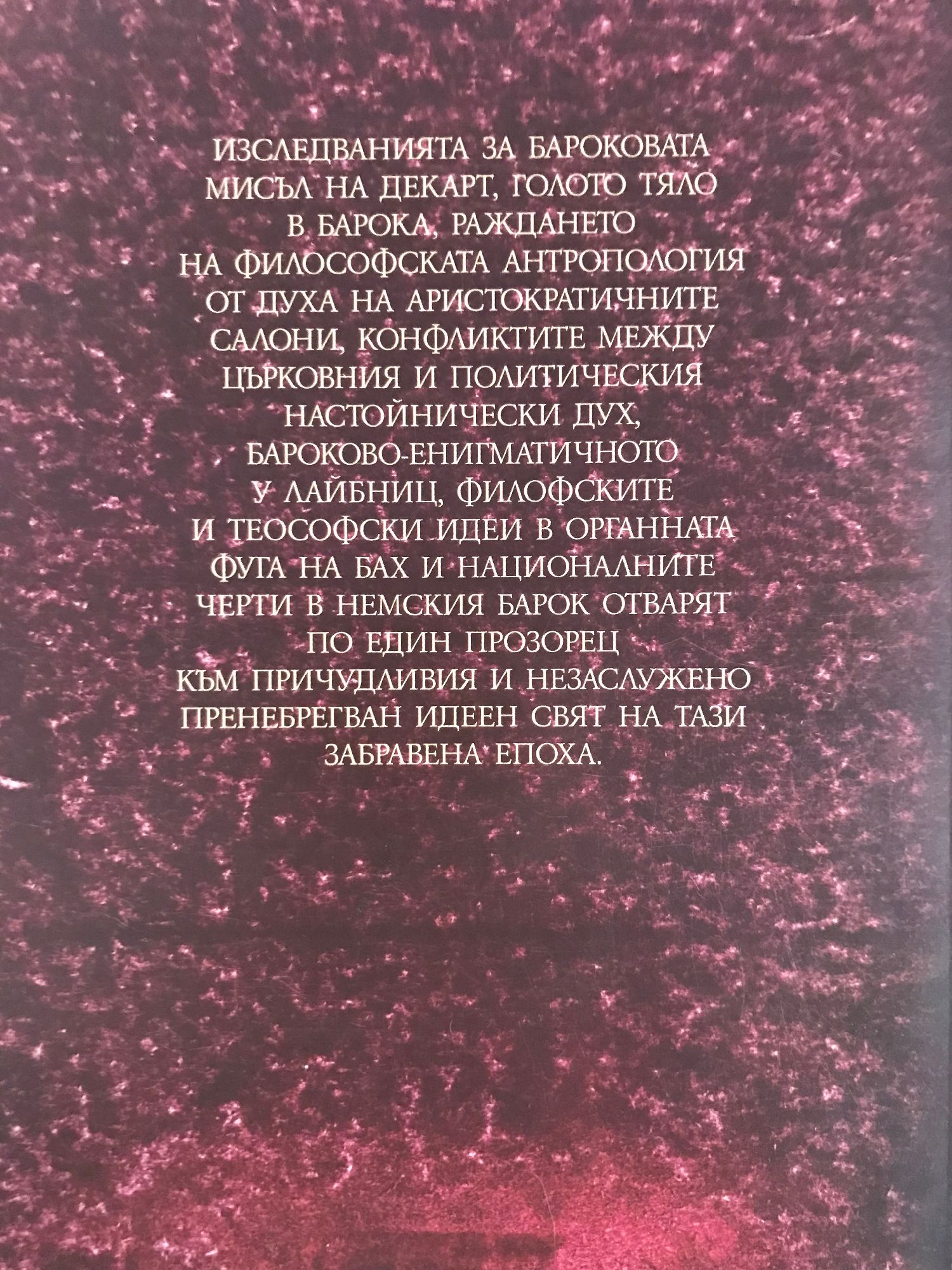 Книгата обхваща серия от философски студии и есета за взаимопреплитанията между изкуство, литература, живопис, архитектура, музика, религия и философия през епохата на Барока. Очертават се и отликите между италианския, френския, немския, испанския и холандския Барок. Авторът се позовава на съвременни проучвания по темата.
