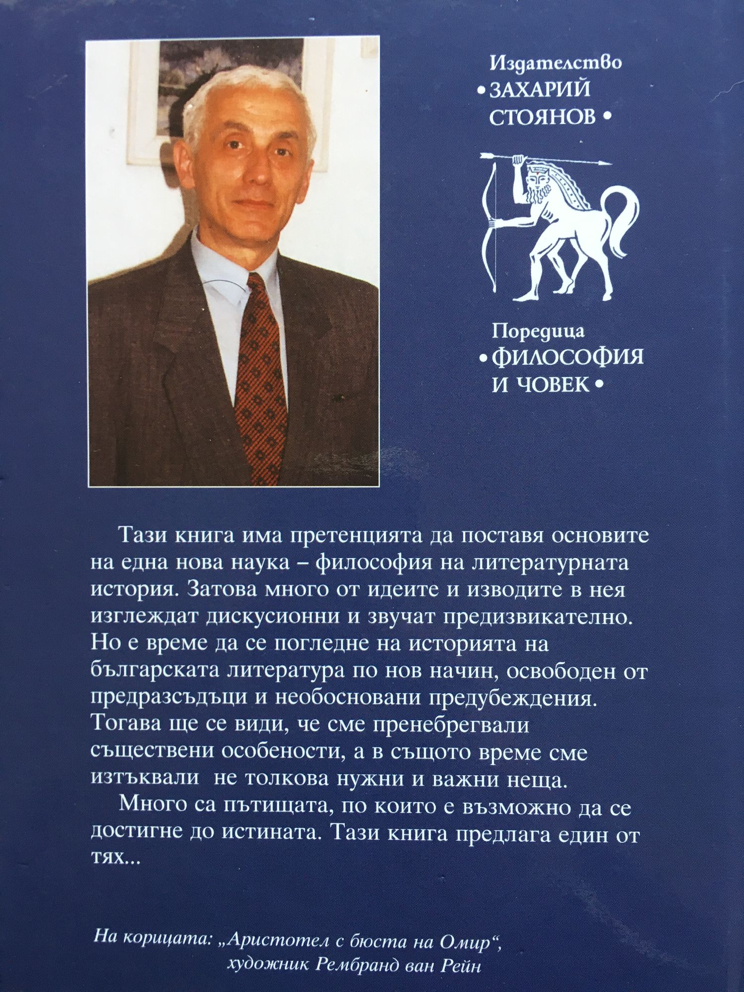Тази книга има претенцията да поставя основите на една нова наука - философия на литературната история. Затова много от идеите и изводите в нея изглеждат дискусионни и звучат предизвикателно. Но е време да се погледне на историята на българската литература по нов начин, освободен от предразсъдъци и необосновани предубеждения. Тогава ще се види, че сме пренебрегвали съществени особености, а в същото време сме изтъквали не толкова нужни и важни неща. Много са пътищата, по които е възможно да се достигне до истината. Тази книга предлага един от тях... На корицата: “Аристотел с бюста на Омир”, художник Рембранд ван Рейн