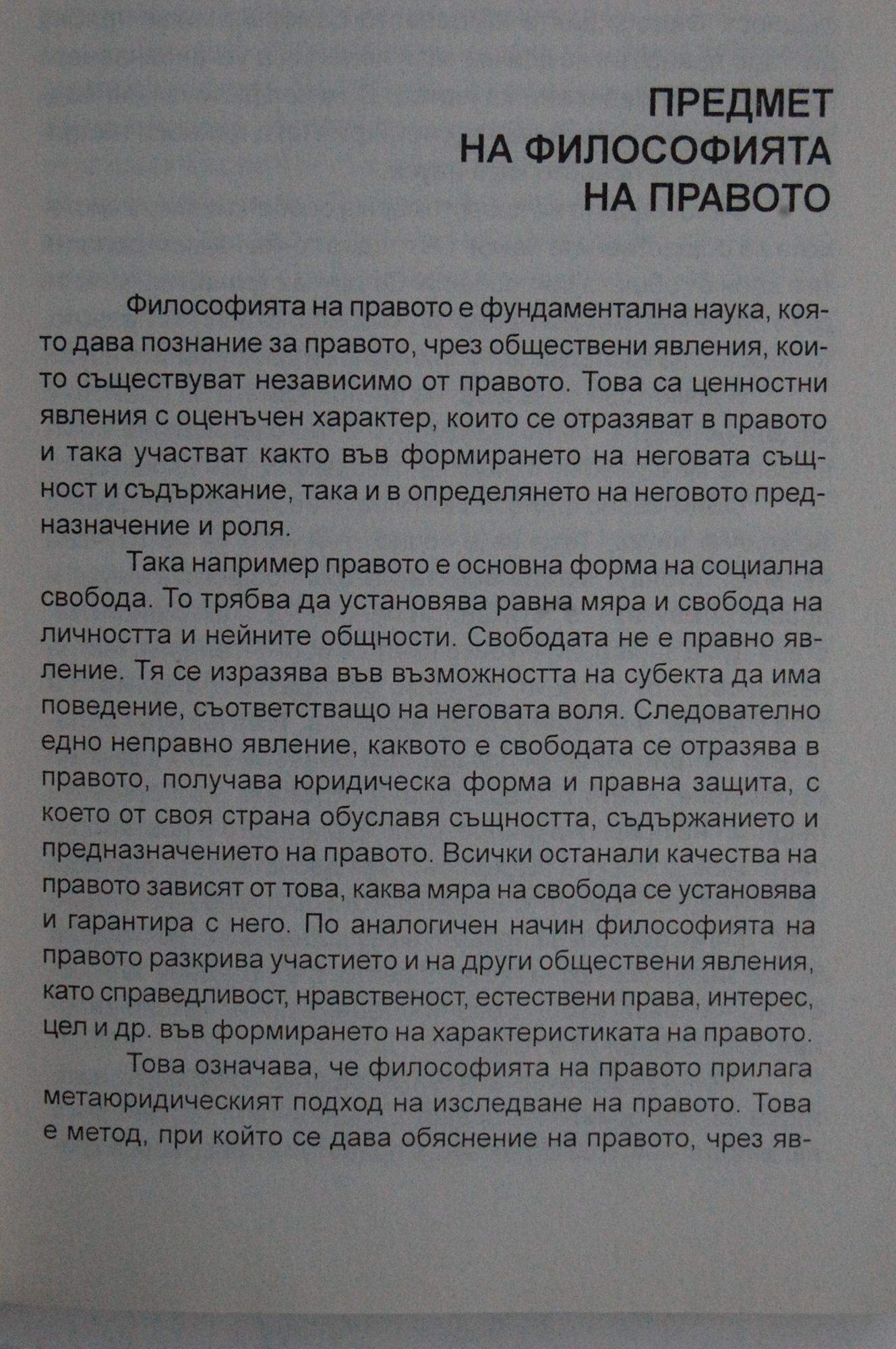Философията на правото е фундаментална наука, която дава познание за правото, чрез обществени явления, които съществуват независимо от правото. Това са ценностни явления с оценъчен характер, които се отразяват в правото и така участват както във формирането на неговата същност и съдържание, така и в определяноето на неговото предназначение и роля.