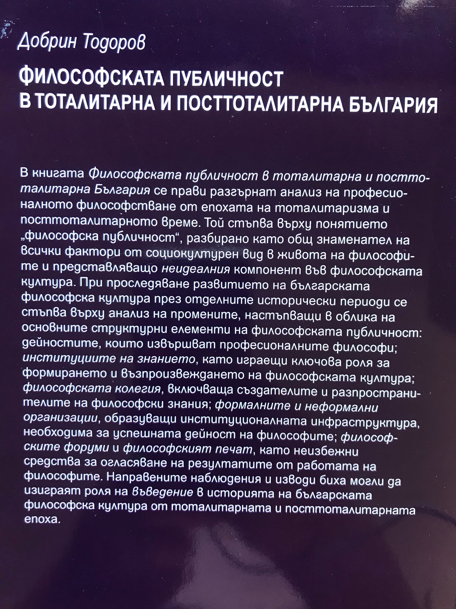 В книгата се прави разгърнат анализ на професионалното философстване от епохата на тоталитаризма и посттоталитарното време. Той стъпва върху понятието „философска публичност”, разбирано като общ знаменател на всички фактори от социокултурен вид в живота на философите и представляващо не идеалния компонент във философската култура. Направените наблюдения и изводи биха могли да изиграят роля на въведение в историята на българската философска култура от тоталитарната и посттоталитарната епоха. Книгата може да представлява интерес за всички, които се интересуват от развитието на българската философска култура през втората половина на ХХ и началото на ХХI век.