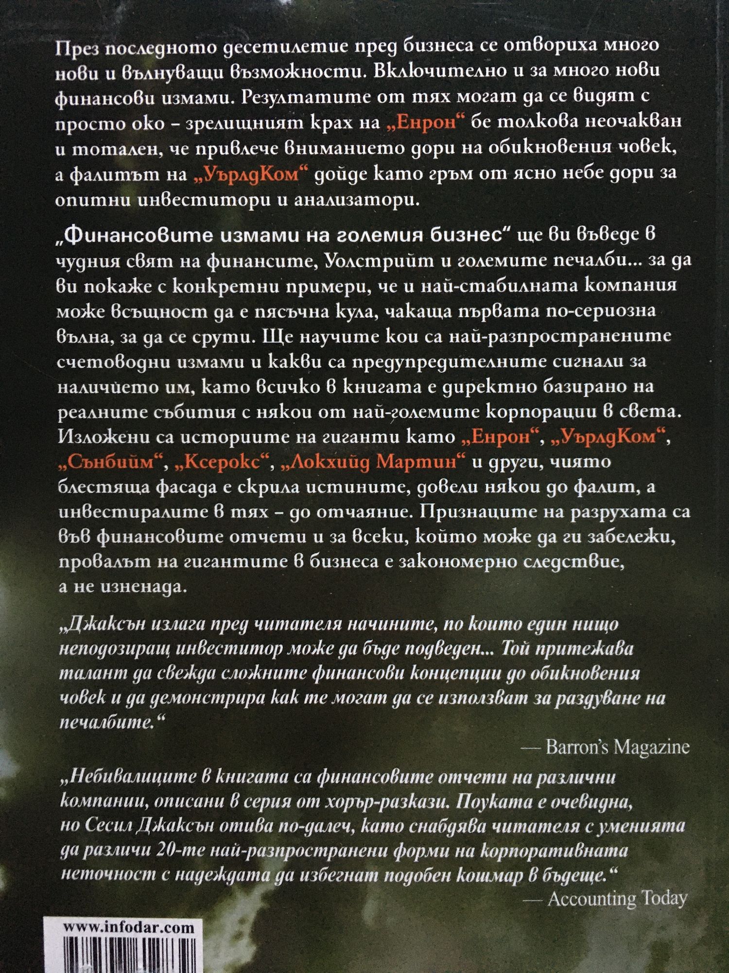 През последното десетилетие пред бизнеса се отвориха много нови и вълнуващи възможности. Включително и за много нови финансови измами. Резултатите от тях могат да се видят с просто око – зрелищният крах на „Енрон” бе толкова неочакван и тотален, че привлече вниманието дори на обикновения човек, а фалитът на „УърлдКом” дойде като гръм от ясно небе дори за опитни инвеститори и анализатори. „Финансовите измами на големия бизнес” ще ви въведе в чудния свят на финансите, Уолстрийт и големите печалби... за да ви покаже с конкретни примери, че и най-стабилната компания може всъщност да е пясъчна кула, чакаща първата по-сериозна вълна, за да се срути. Ще научите кои са най-разпространените счетоводни измами и какви са предупредителните сигнали за наличието им, като всичко в книгата е директно базирано на реалните събития с някои от най-големите корпорации в света. Изложени са историите на гиганти като „Енрон”, „УърлдКом”, „Сънбийм”, „Ксерокс”, „Локхийд Мартин” и други, чиято блестяща фасада е скрила истините, довели някои до фалит, а инвестиралите в тях – до отчаяние. Признаците на разрухата са във финансовите отчети и за всеки, който може да ги забележи, провалът на гигантите в бизнеса е закономерно следствие, а не изненада.