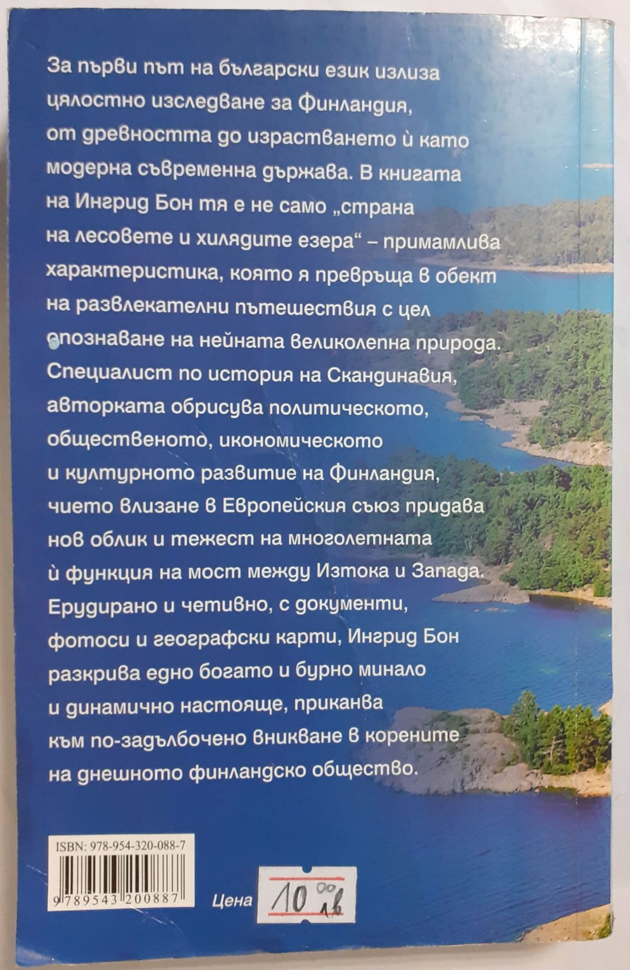 За първи път на български език излиза цялостно изследване за Финландия, от древността до израстването й като модерна съвременна държава. В книгата на Ингрид Бон тя е не само “страна на лесовете и хилядите езера” - примамлива характеристика, която я превръща в обект на развлекателни пътешествия с цел опознаване на нейната великолепна природа. Специалист по история на Скандинавия, авторката обрисува политическото, общественото, икономическото и културното развитие на Финландия, чието влизане в Европейския съюз придава нов облик и тежест на многолетната й функция на мост между Изтока и Запада. Ерудирано и четивно, с документи, фотоси и географски карти, Ингрид Бон разкрива едно богато и бурно минало и динамично настояще, приканва към по-задълбочено вникване в корените на днешното финландско общество.