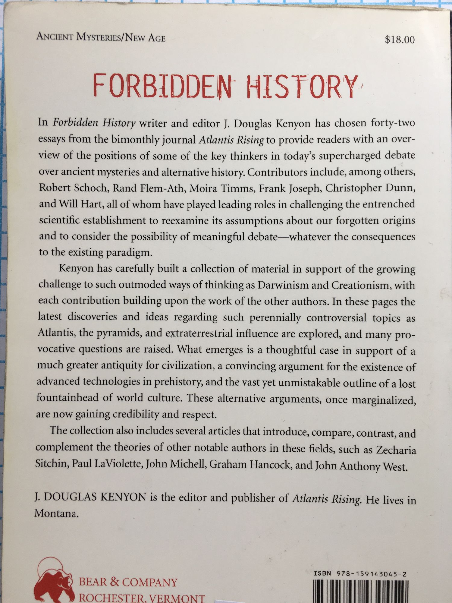 ANCIENT MYSTERIES / NEW AGE In Forbidden History writer and editor J. Douglas Kenyon has chosen forty-two essays from the bimonthly journal Atlantis Rising to provide readers with an overview of the positions of some of the key thinkers in today’s supercharged debate over ancient mysteries and alternative history. Contributors include, among others, Robert Schoch, Rand Flem-Ath, Moira Timms, Frank Joseph, Christopher Dunn, and Will Hart, all of whom have played leading roles in challenging the entrenched scientific establishment to reexamine its assumptions about our forgotten origins and to consider the possibility of meaningful debate--whatever the consequences to the existing paradigm. Kenyon has carefully built a collection of material in support of the growing challenge to such outmoded ways of thinking as Darwinism and Creationism, with each contribution building upon the work of the other authors. In these pages the latest discoveries and ideas regarding such perennially controversial topics as Atlantis, the pyramids, and extraterrestrial influence are explored, and many provocative questions are raised. What emerges is a thoughtful case in support of a much greater antiquity for civilization, a convincing argument for the existence of advanced technologies in prehistory, and the vast yet unmistakable outline of a lost fountainhead of world culture. These alternative arguments, once marginalized, are now gaining credibility and respect. The collection also includes several articles that introduce, compare, contrast, and complement the theories of other notable authors in these fields, such as Zecharia Sitchin, Paul LaViolette, John Michell, Graham Hancock, and John Anthony West. J. DOUGLAS KENYON is the editor and publisher of Atlantis Rising. He lives in Montana.