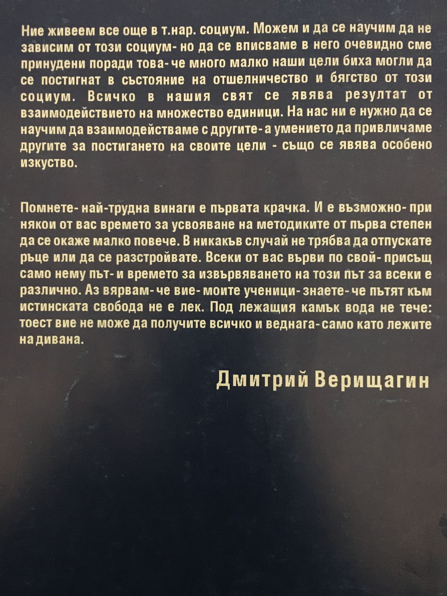 Ние живеем все още в т.нар. социум. Можем и да се научим да не зависим от този социум - но да се вписваме в него очевидно сме принудени поради това -че много малко наши цели биха могли да се постигнат в състояние на отшелничество и бягство от този социум. Всичко в нашия свят се явява резултат от взаимодействието на множество единици. На нас ни е нужно да се научим да взаимодействаме с другите - а умението да привличаме другите за постигането на своите цели - също се явява особено изкуство. Помнете - най-трудна винаги е първата крачка. И е възможно - при някои от вас времето за усвояване на методиките от първа степен да се окаже малко повече. В никакъв случай не трябва да отпускате ръце или да се разстройвате. Всеки от вас върви по свой - присъщ само нему път - и времето за извървяването на този път за всеки е различно. Аз вярвам - че вие - моите ученици - знаете - че пътят към истинската свобода не е лек. Под лежащия камък вода не тече: тоест вие не може да получите всичко и веднага - само като лежите на дивана.