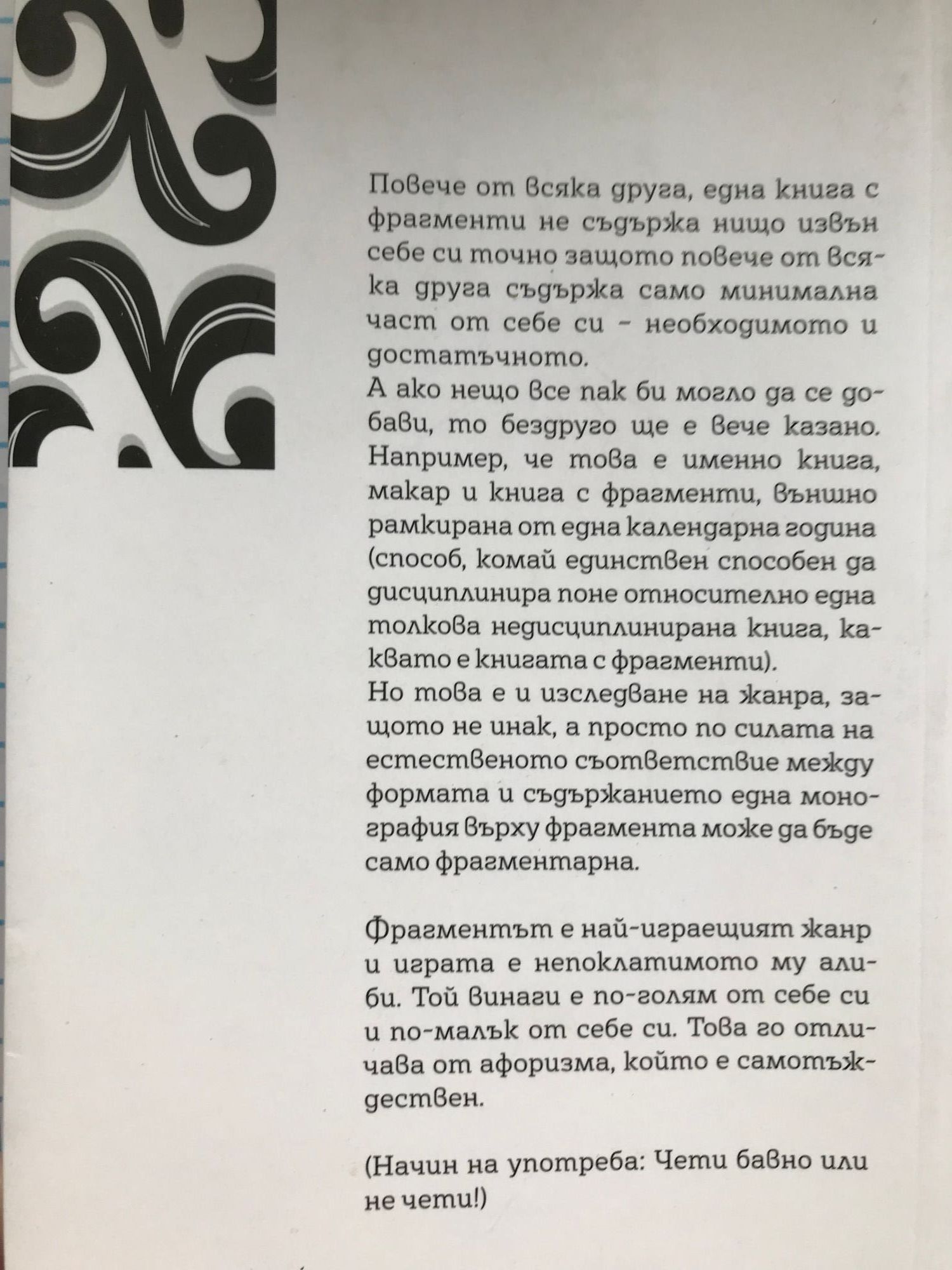 Повече от всяка друга, една книга с фрагменти не съдържа нищо извън себе си точно защото повече от всяка друга съдържа само минимална част от себе си - необходимото и достатъчното. А ако нещо все пак би могло да се добави, то бездруго ще е вече казано. Например, че това е именно книга, макар и книга с фрагменти, външно рамкирана от една календарна година (способ, комай единствен способен да дисциплинира поне относително една толкова недисциплинирана книга, каквато е книгата с фрагменти). Но това е и изследване на жанра, защото не инак, а просто по силата на естественото съответствие между формата и съдържанието една монография върху фрагмента може да бъде само фрагментарна. Фрагментът е най-играещият жанр и играта е непоклатимото му алиби. Той винаги е по-голям от себе си и по-малък от себе си. Това го отличава от афоризма, който е самотъждествен. Начин на употреба: Чети бавно или не чети! "Книгата си поставя двояка задача: от една страна, да дефинира тъй наречената форма "фрагмент" като литературно-философски жанр. А от друга, да ни предложи широк набор от текстове като илюстрация на този жанров тип. Но както се оказва - и като интересно само по себе си четиво. По силата на самия си обем и на своето калейдоскопично разнообразие този сякаш мислен като втори аспект на книгата надделява над първия и властно привлича читателското внимание." проф. Александър Шурбанов "...едно широко, трудно разграничимо поле между теоретично-аналитичното, белетристично-есеистичното и лирическото, от трета. Непременно трябва да се забележи езикът - български език от много високо качество." проф. Георги Каприев