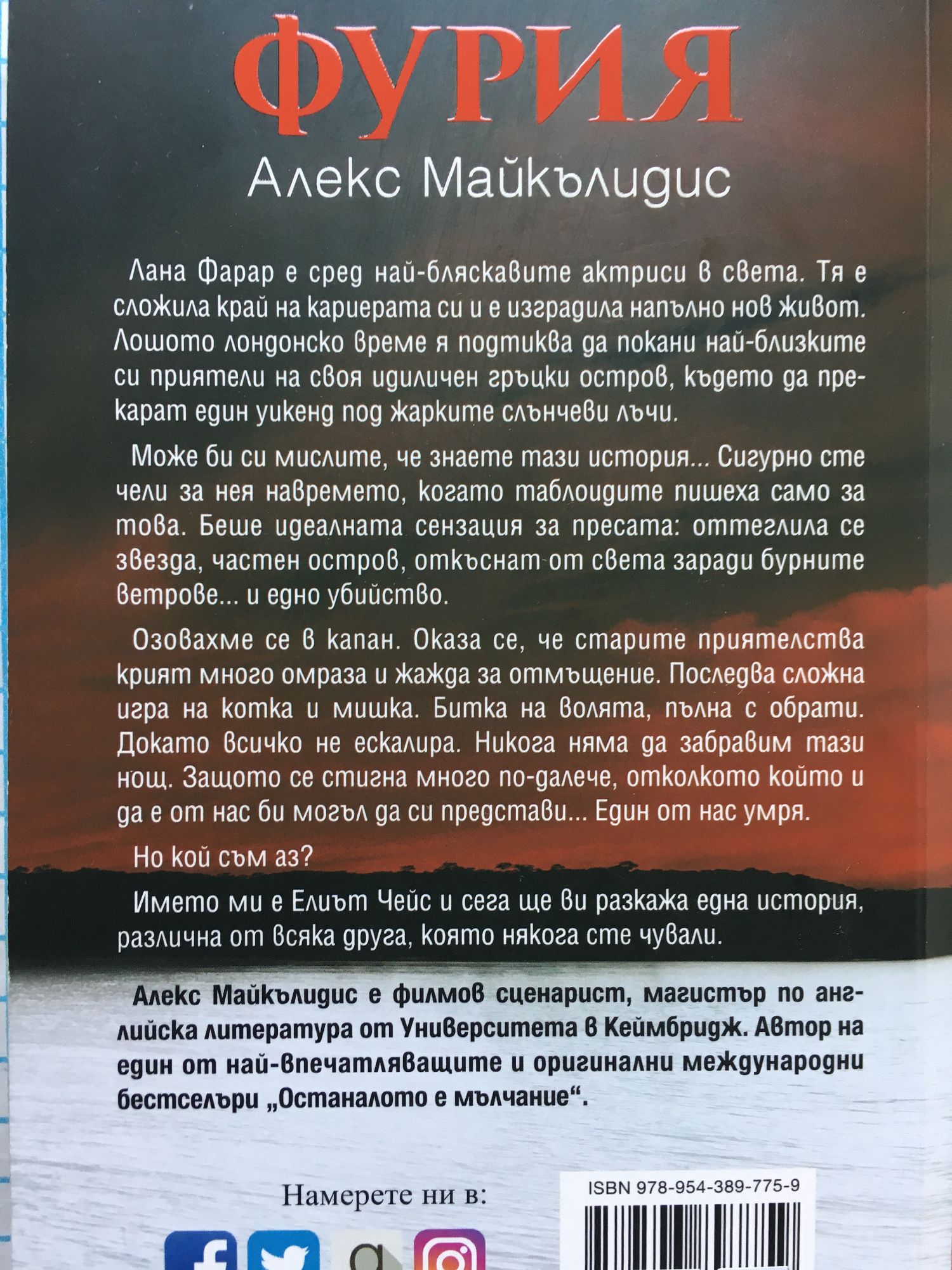 Лана Фарар е сред най-бляскавите актриси в света. Тя е сложила край на кариерата си и е изградила напълно нов живот. Лошото лондонско време я подтиква да покани най-близките си приятели на своя идиличен гръцки остров, където да прекарат един уикенд под жарките слънчеви лъчи. "Може би си мислите, че знаете тази история... Сигурно сте чели за нея навремето, когато таблоидите пишеха само за това. Беше идеалната сензация за пресата: оттеглила се звезда, частен остров, откъснат от света заради бурните ветрове... и едно убийство. Озовахме се в капан. Оказа се, че старите приятелства крият много омраза и жажда за отмъщение. Последва сложна игра на котка и мишка. Битка на волята, пълна с обрати. Докато всичко не ескалира. Никога няма да забравим тази нощ. Защото се стигна много по-далече, отколкото който и да е от нас би могъл да си представи... Един от нас умря. Но кой съм аз? Името ми е Елиът Чейс и сега ще ви разкажа една история, различна от всяка друга, която някога сте чували." Из книгата Алекс Майкълидис е филмов сценарист, магистър по английска литература от Университета в Кеймбридж. Автор на един от най-впечатляващите и оригинални международни бестселъри Останалото е мълчание.