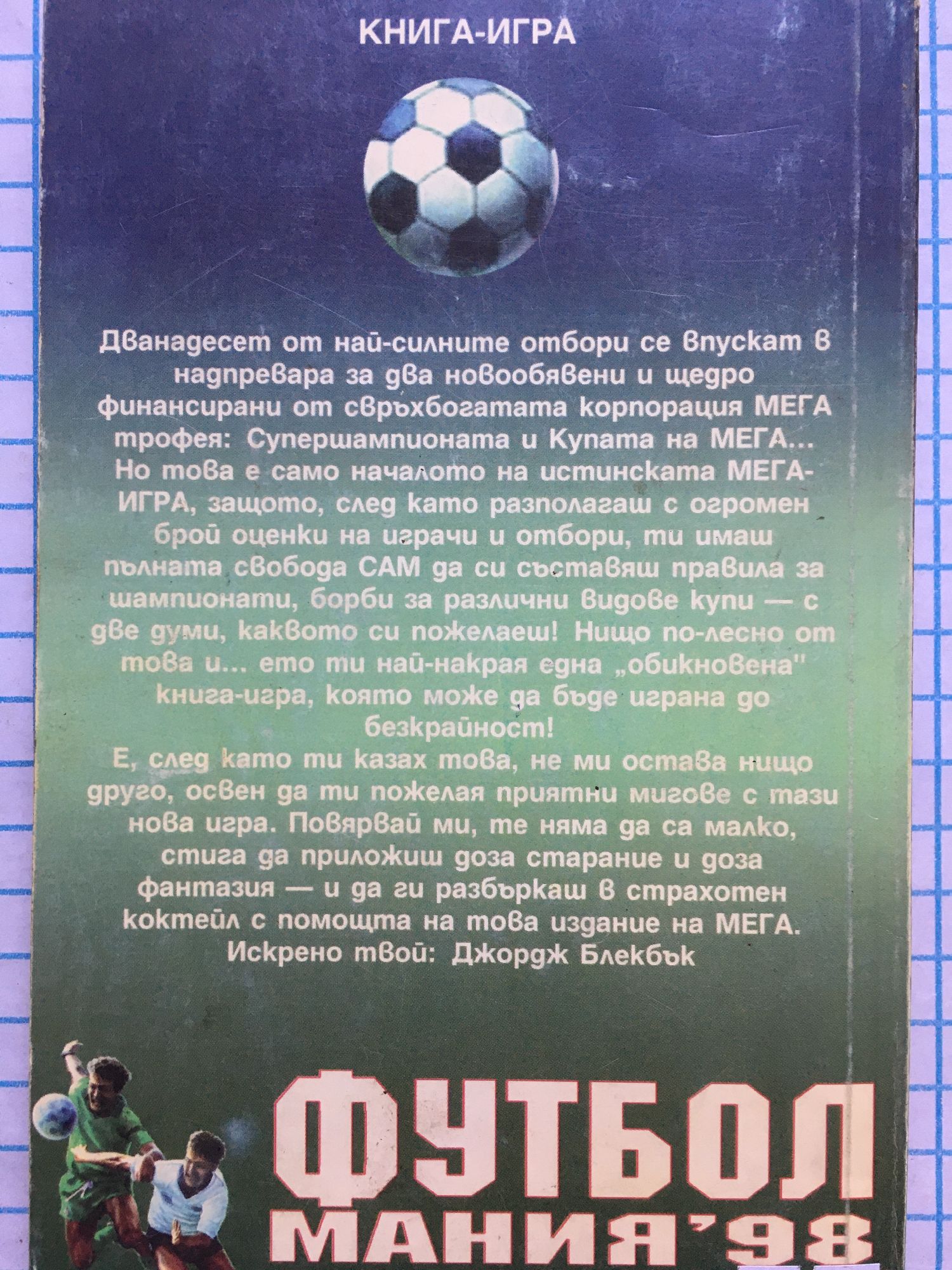 Дванадесет от най-силните отбори се впускат в надпревара за два новообявени и щедро финансирани от свръхбогатата корпорация МЕГА трофея: Супершампионата и Купата на МЕГА… Но това е само началото на истинската МЕГА-ИГРА, защото, след като разполагаш с огромен брой оценки на играчи и отбори, ти имаш пълната свобода САМ да си съставяш правила за шампионати, борби за различни видове купи – с две думи, каквото си пожелаеш! Нищо по-лесно от това и.. ето ти най-накрая една „обикновена“ книга-игра, която може да бъде играна до безкрайност! Е, след като ти казах това, не ми остава нищо друго, освен да ти пожелая приятни мигове с тази нова игра. Повярвай ми, те няма да са малко, стига да приложиш доза старание и доза фантазия – и да ги разбъркаш в страхотен коктейл с помощта на това издание на МЕГА.