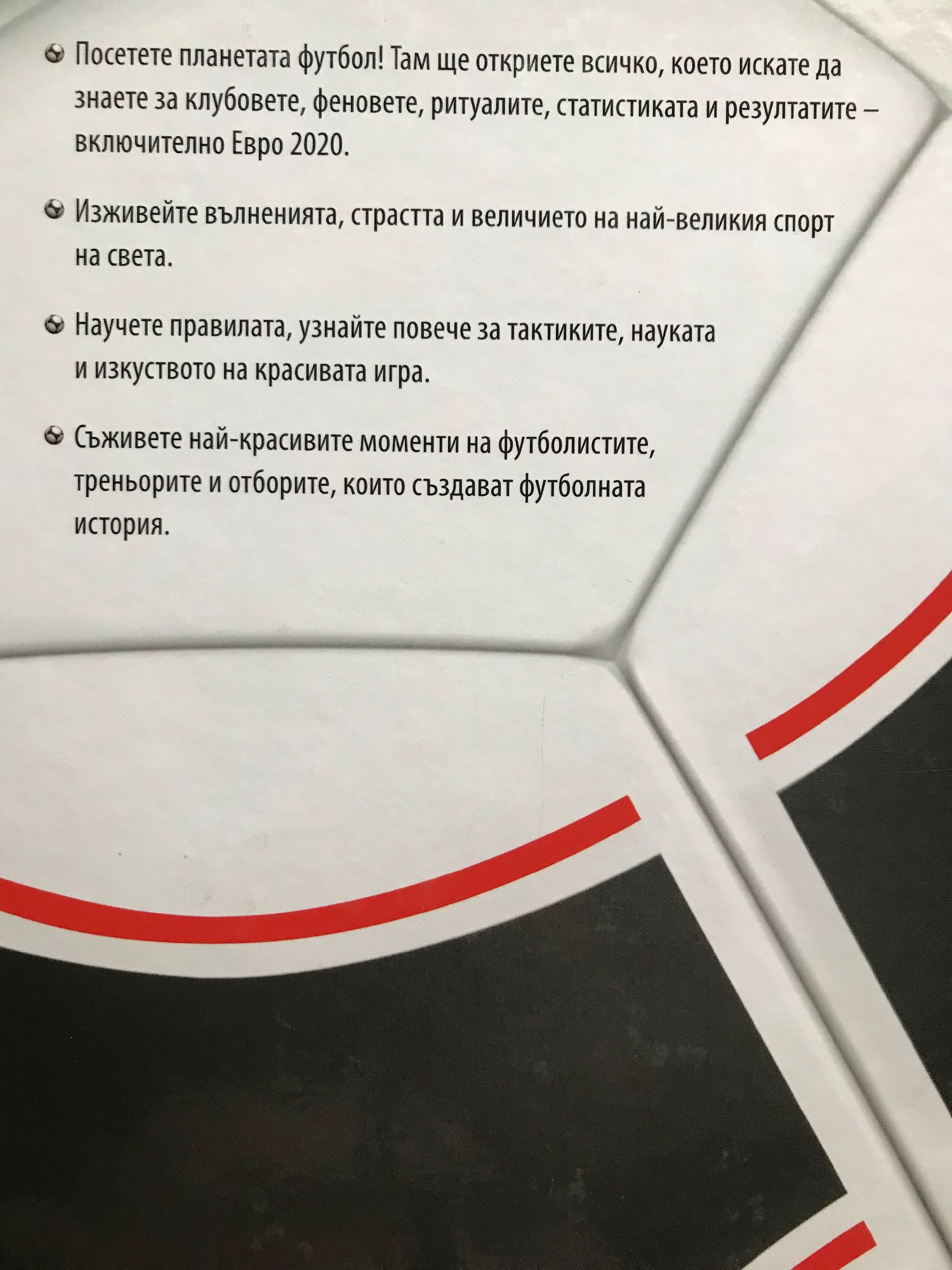 Футболът е най-популярният спорт на света. От Гренландия до Андите хората просто не могат да устоят да не ритат топка или да не гледат как други правят същото. Цифрите са смайващи. Около 250 милиона души играят редовно футбол. Ако футболистите се съберат в една нация, то тя ще бъде четвъртата по население в света. Междувременно телевизионната зрителска аудитория на Световното първенство през 2018 г. достига до 3,57 милиарда души – почти половината от цялото население на Земята. Би могло да се каже, че футболът е универсалният език. Ако се окажете във вътрешността на чужда страна и не говорите местния език, то бихте могли да завържете разговор, като използвате няколко жеста с ръце, придружени от имената на някои забележителни играчи. Сложете едната ръка на нивото на кръста, докато казвате „Пеле”, а след това я вдигнете нагоре, произнасяйки „Марадона”, и бързо ще започнете да печелите приятели. Футболът събира хората и им дава чувство за идентичност. Той е една безкрайна сапунена опера, която сякаш очертава времевата линия на живота ни; той е източник на безкрайни спорове; олицетворение на всички аспекти на човешкото битие – герои и подлеци, любов и ненавист, сила, политика и пари. Също като живота, играта е извор на върховна красота и на съкрушително разочарование. Тази книга отразява в пълна степен това удивително разнообразие – от различните достойнства на отделни райони и човешки качества до най-смешните песни от трибуните. От нейните страници ще научите: Как да боравите с топката като Бекъм. Ще се срещнете с кучето, което открива Световната купа, скрита в градска градина. Ще разберете как мач от лигата на Мадагаскар може да завърши с резултат 149:0. Единственото нещо, което няма да може да разберете от тази книга, е защо хората са толкова луди по футбола. Но пък нищо не ни пречи, да ви предоставим няколко теории, които биха могли до известна степен да обяснят неистовата любов на хората към тази игра.