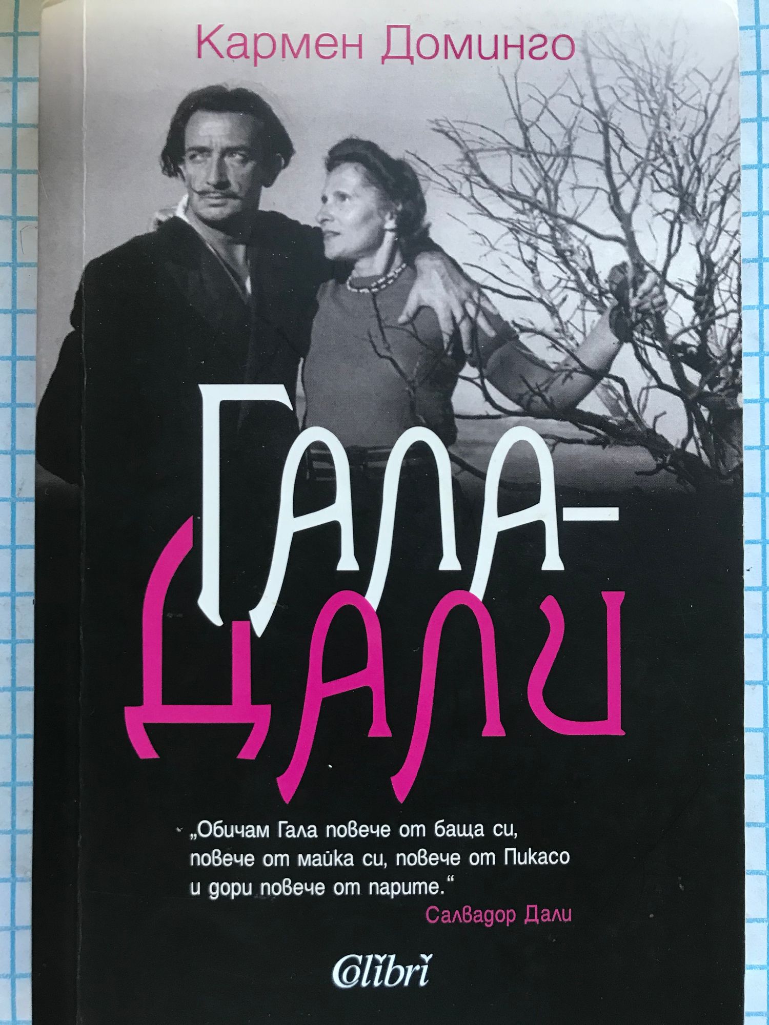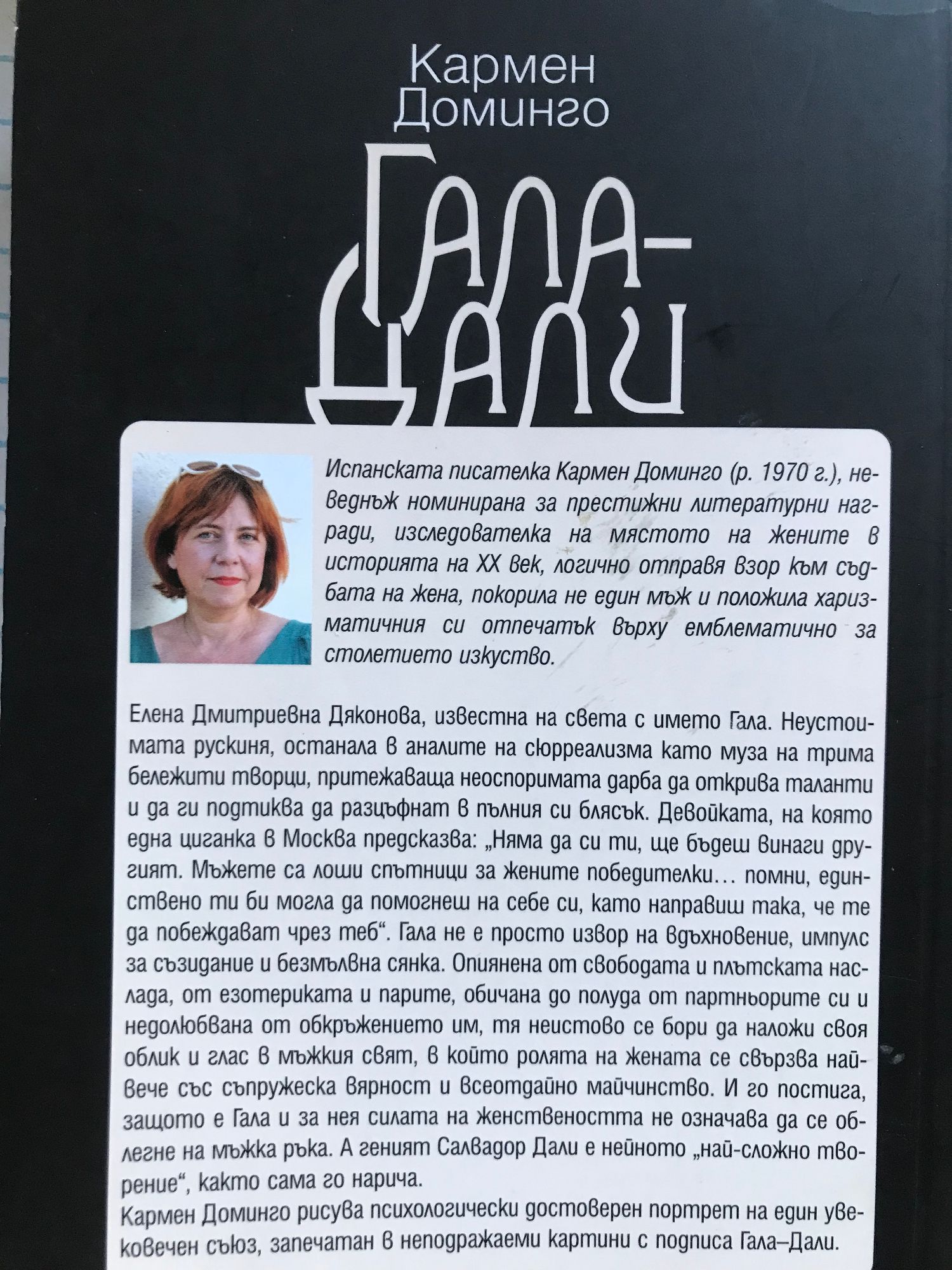 Елена Дмитриевна Дяконова, известна на света с името Гала. Неустоимата рускиня, останала в аналите на сюрреализма като муза на трима бележити творци, притежаваща неоспоримата дарба да открива таланти и да ги подтиква да разцъфнат в пълния си блясък. Девойката, на която една циганка в Москва предсказва: „Няма да си ти, ще бъдеш винаги другият. Мъжете са лоши спътници за жените победителки… помни, единствено ти би могла да помогнеш на себе си, като направиш така, че те да побеждават чрез теб“. Гала не е просто извор на вдъхновение, импулс за съзидание и безмълвна сянка. Опиянена от свободата и плътската наслада, от езотериката и парите, обичана до полуда от партньорите си и недолюбвана от обкръжението им, тя неистово се бори да наложи своя облик и глас в мъжкия свят, в който ролята на жената се свързва най-вече със съпружеска вярност и всеотдайно майчинство. И го постига, защото е Гала и за нея силата на женствеността не означава да се облегне на мъжка ръка. А геният Салвадор Дали е нейното „най-сложно творение“, както сама го нарича. Кармен Доминго рисува психологически достоверен портрет на един увековечен съюз, запечатан в неподражаеми картини с подписа Гала-Дали.