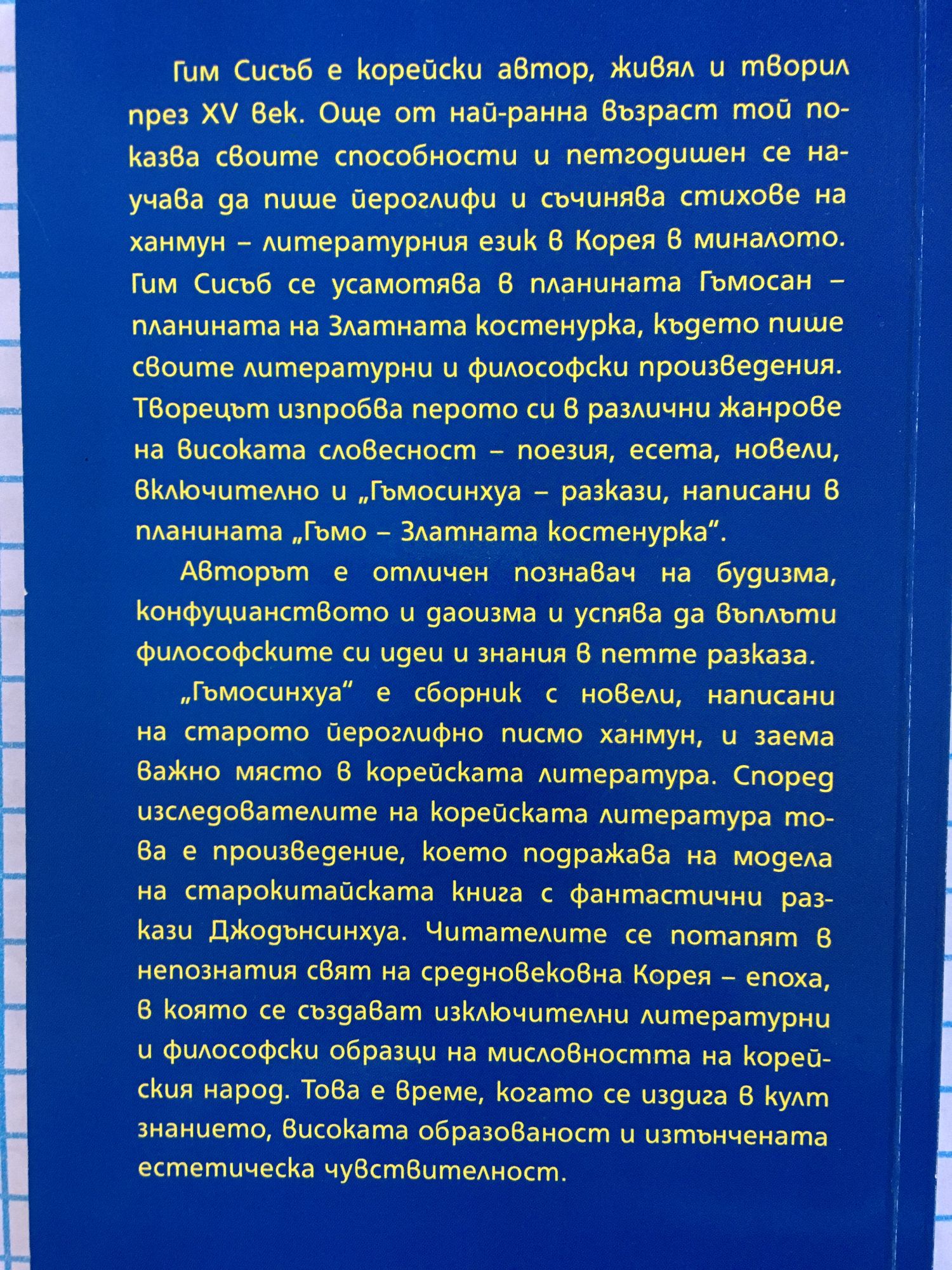"Гъмосинхуа" е сборник с новели, който заема важно място в корейската литература. Според изследователите на корейската литература това е произведение, което подражава на модела на старокитайската книга с фантастични разкази Джодънсинхуа. Но достойнството, литературната ценност и оригиналност на "Гъмосинхуа" на Гим Сисъб е в това, че в него се изразяват важни за времето и обществото на тогавашния Джосон идеи. Авторът е отличен познавач на будизма, конфуцианството и даоизма и успява да въплъти философските си знания в петте разказа. Новелите потапят читателите в непознатия свят на средновековна Корея, която е арена на вътрешни противоречия, социално напрежение и борба с множество чужди нашественици. Но в същото време това е и епоха, в която се създават изключителни литературни и философски образци на мисловността на корейския народ. Това е време, когато се издига в култ знанието, високата образованост и естетизъм. Композиционно разказите в Гъмосинхуа се организират около фигурата на младия, изключително високо образован млад мъж, който посвещава живота си и социалната си активност в постигането на повече знания, в разкриването на истината за живота и законите, управляващи човешкото поведение, за мястото на бог и божественото в човешкото всекидневие. Именно в стремежа към познание авторът изгражда устойчив модел за подражание за хората. Според Гим Сисъб само знанието може да даде силата на всеки човек, за да може той да се изправи като равен с бог. Тъжното сърце на твореца не остава безразлично към фалша на светския свят. Той се скита и не може да намери покой на неспокойния си и непримирим дух. Героят, който може да се идентифицира с мислите и настроенията на самия автор, непрекъснато пътува между реалността и отвъдното, за да постигне истината за света и същността на човешкото присъствие.