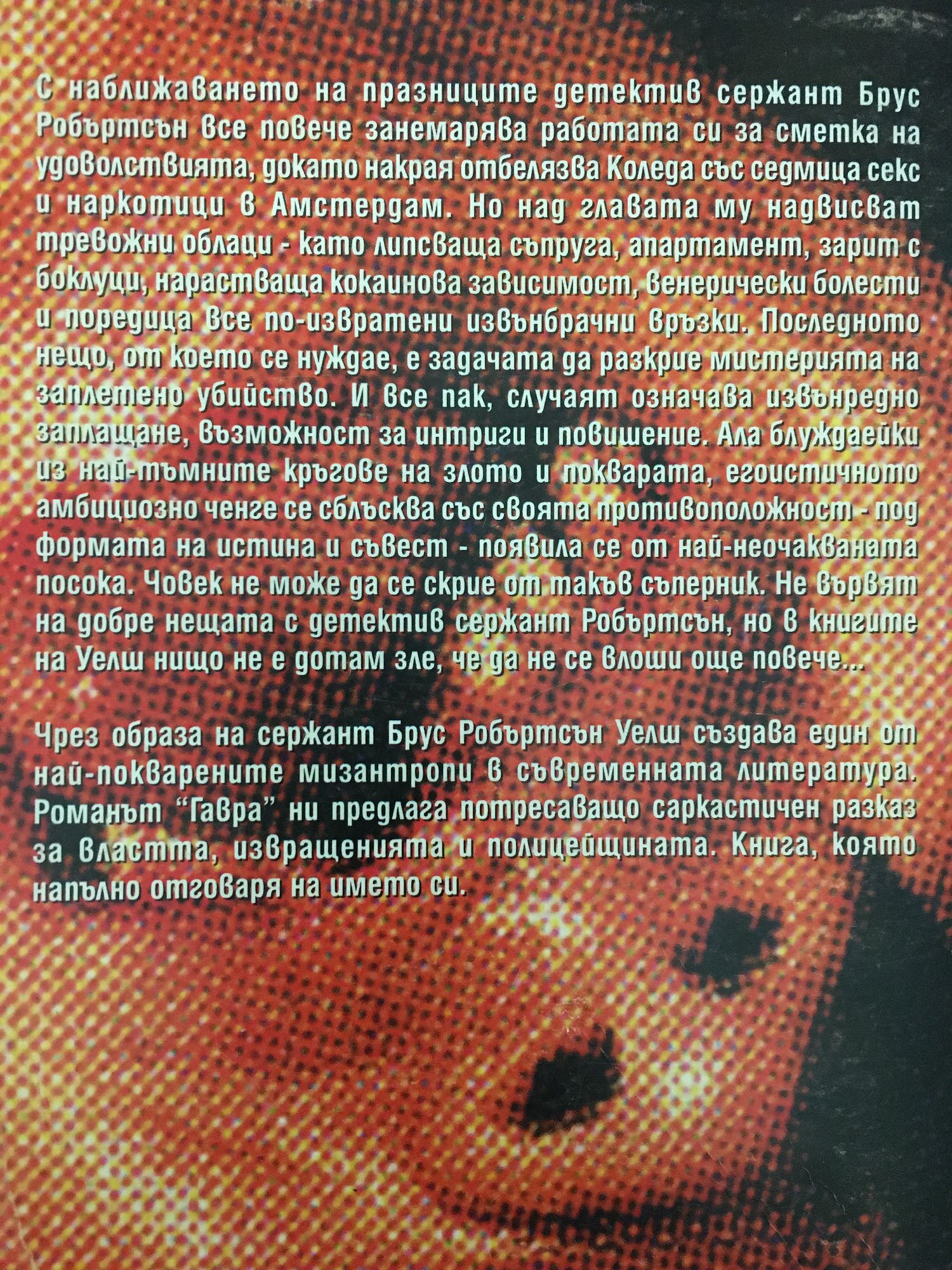 С наближаването на празниците детектив сержант Брус Робъртсън все повече занемарява работата си за сметка на удоволствията, докато накрая отбелязва Коледа с една седмица секс и наркотици в Амстердам. Но над главата му надвисват тревожни облаци - като липсваща съпруга, апартамент, зарит с боклуци, нарастваща кокаинова зависимост, венерически болести и поредица все по-извратени извънбрачни връзки. Последното нещо, от което се нуждае, е задачата да разкрие мистерията на заплетено убийство. И все пак, случаят означава извънреден труд, възможност за интриги и повишение. Ала блуждаейки из най-тъмните кръгове на злото и покварата, егоистичното амбициозно ченге се сблъсква със своята противоположност - под формата на истина и съвест - появила се от най-неочакваната посока. Човек не може да се скрие от такъв съперник. Не вървят на добре нещата с детектив сержант Робъртсън, но в книгите на Уелш нищо не е дотам зле, че да не се влоши още повече... Чрез образа на сержант Брус Робъртсън Уелш създава един от най-покварените мизантропи в съвременната литература. Романът "Гавра" ни предлага потресаващо саркастичен разказ за властта, извращенията и полицейщината. Книга, която напълно отговаря на името си.