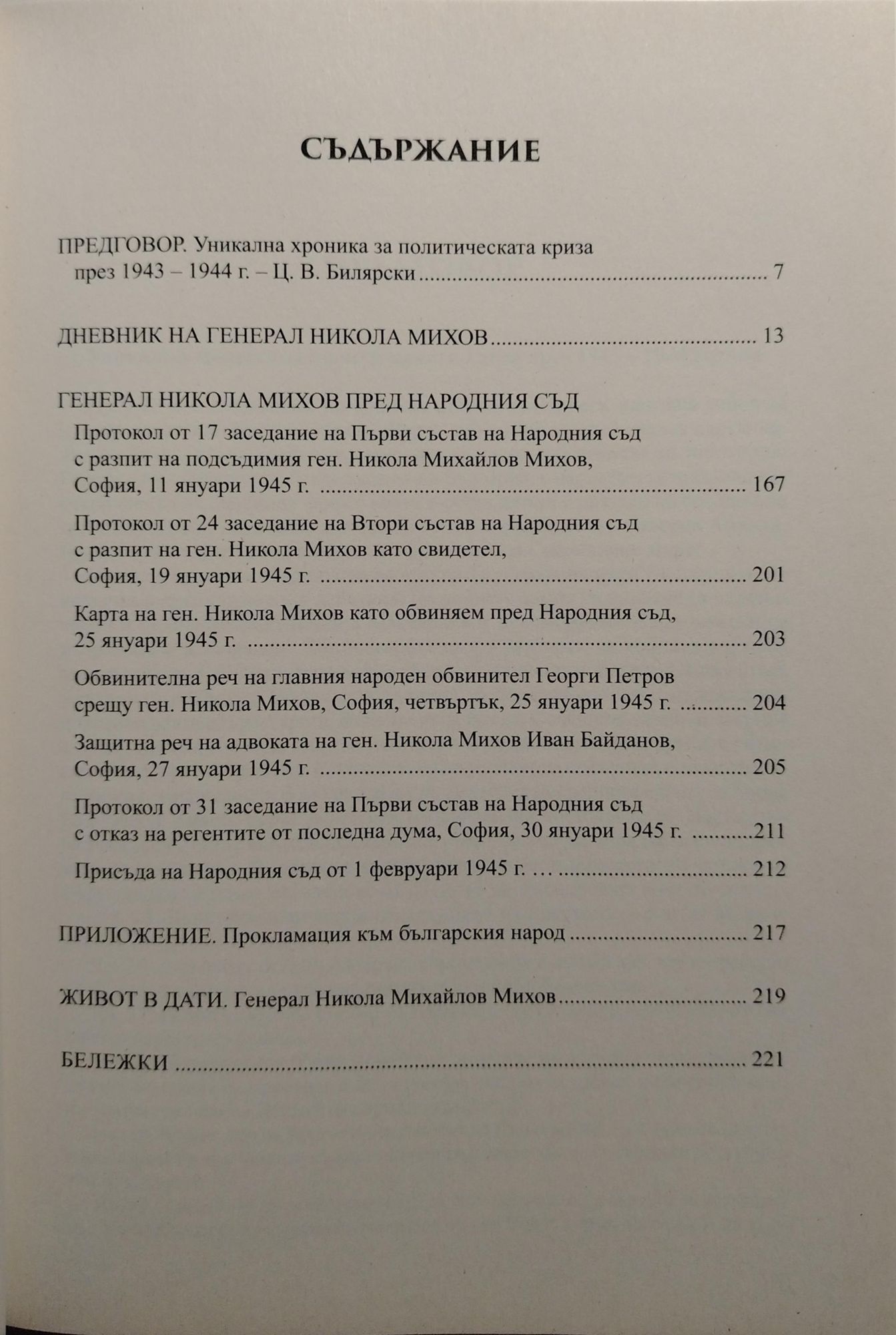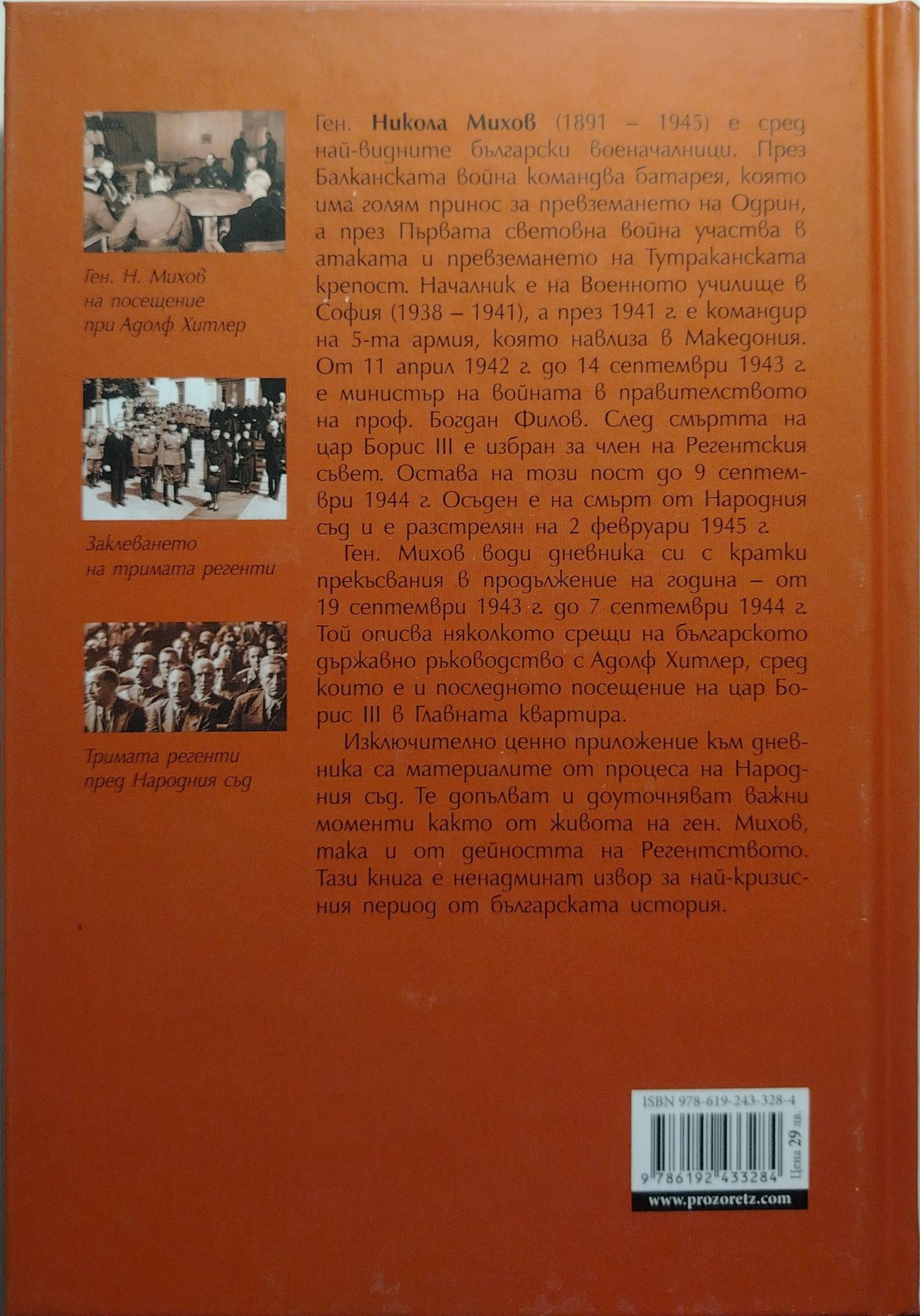 Ген. Никола Михов (1891 – 1945) е сред най-видните български военачалници. През Балканската война командва батарея, която има голям принос за превземането на Одрин, а през Първата световна война участва в атаката и превземането на Тутраканската крепост. Началник е на Военното училище в София (1938 – 1941), а през 1941 г. е командир на 5-та армия, която навлиза в Македония. От 11 април 1942 г. до 14 септември 1943 г. е министър на войната в правителството на проф. Богдан Филов. След смъртта на цар Борис III е избран за член на Регентския съвет. Остава на този пост до 9 септември 1944 г. Осъден е на смърт от Народния съд и е разстрелян на 2 февруари 1945 г. Ген. Михов води дневника си с кратки прекъсвания в продължение на година – от 19 септември 1943 г. до 7 септември 1944 г. Той описва няколкото срещи на българското държавно ръководство с Адолф Хитлер, сред които е и последното посещение на цар Борис III в Главната квартира. Изключително ценно приложение към дневника са материалите от процеса на Народния съд. Те допълват и доуточняват важни моменти както от живота на ген. Михов, така и от дейността на Регентството. Книгата „Генерал Никола Михов: Личен дневник и протоколи от Народния съд“ е ненадминат извор за най-кризисния период от българската история.