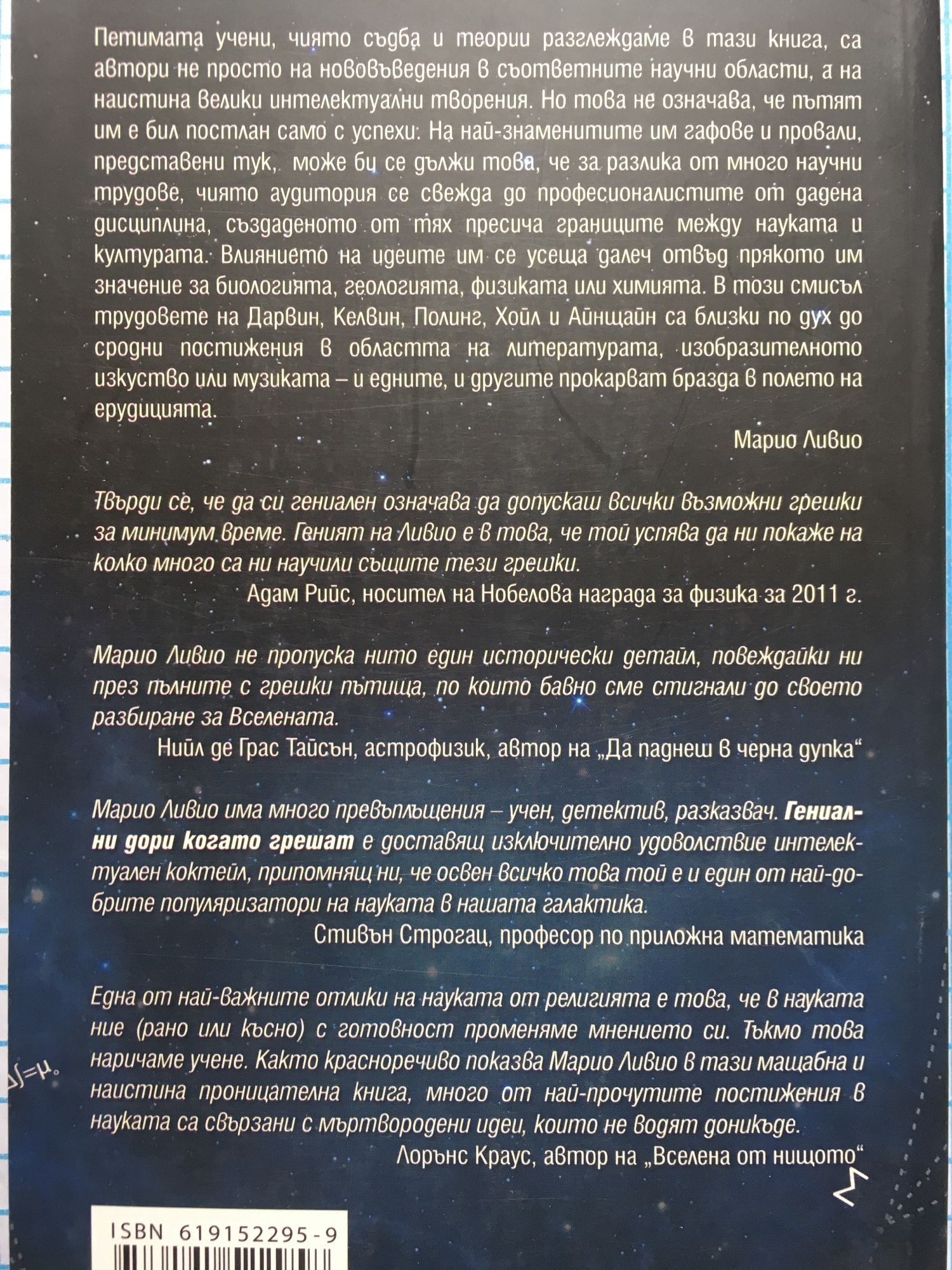 Петимата учени, чиято съдба и теории разглеждаме в тази книга, са автори не просто на нововъведения в съответните научни области, а на наистина велики интелектуални творения. Но това не означава, че пътят им е бил постлан само с успехи. На най-знаменитите им гафове и провали, представени тук, може би се дължи това, че за разлика от много научни трудове, чиято аудитория се свежда до професионалистите от дадена дисциплина, създаденото от тях пресича границите между науката и културата. Влиянието на идеите им се усеща далеч отвъд прякото им значение за биологията, геологията, физиката или химията. В този смисъл трудовете на Дарвин, Келвин, Полинг, Хойл и Айнщайн са близки по своята същност до сродни постижения в областта на литературата, изобразителното изкуство или музиката - и едните, и другите прокарват бразда в полето на ерудицията. Отзиви "Твърди се, че да си гениален означава да допускаш всички възможни грешки за минимум време. Геният на Марио Ливио е в това, че той успява да ни покаже на колко много са ни научили същите тези грешки." Адам Рийс, носител на Нобелова награда за физика за 2011 г. "Марио Ливио не пропуска нито един исторически детайл, повеждайки ни през пълните с грешки пътища, по които бавно сме стигнали до своето разбиране за Вселената." Нийл де Грас Тайсън, автор на "Да паднеш в черна дупка" "Марио Ливио има много превъплъщения - учен, детектив, разказвач. "Гениални дори когато грешат" е доставящ изключително удоволствие интелектуален коктейл, припомнящ ни, че освен всичко това той е и един от най-добрите популяризатори на науката в нашата галактика." Стивън Строгац, професор по приложна математика "Една от най-важните разлики на науката от религията е това, че в науката ние (рано или късно) с готовност променяме мнението си. Тъкмо това наричаме учене. Както красноречиво показва Марио Ливио, в тази мащабна и наистина проницателна книга, много от най-прочутите постижения в науката са свързани с мъртвородени идеи, които не водят доникъде." Лорънс Краус, автор на "Вселена от нищото"