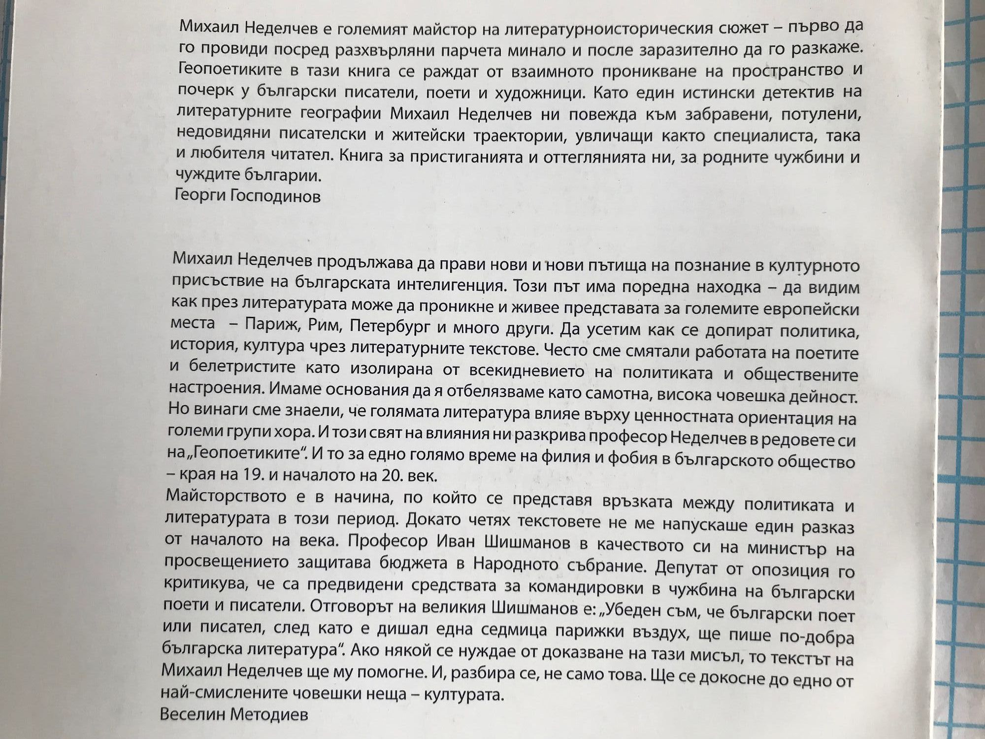 Михаил Неделчев е големият майстор на литературноисторическия сюжет - първо да го провиди посред разхвърляни парчета минало и после заразително да го разкаже. Геопоетиките в тази книга се раждат от взаимното проникване на пространство и почерк у български писатели, поети и художници. Като един истински детектив на литературните географии Михаил Неделчев ни повежда към забравени, потулени, недовидяни писателски и житейски траектории, увличащи както специалиста, така и любителя читател. Книга за пристиганията и оттеглянията ни, за родните чужбини и чуждите българии. Георги Господинов Михаил Неделчев продължава да прави нови и нови пътища на познание в културното присъствие на българската интелигенция. Този път има поредна находка - да видим как през литературата може да проникне и живее представата за големите европейски места - Париж, Рим, Петербург и много други. Да усетим как се допират политика, история, култура чрез литературните текстове. Често сме смятали работата на поетите и белетристите като изолирана от всекидневието на политиката и обществените настроения. Имаме основания да я отбелязваме като самотна, висока човешка дейност. Но винаги сме знаели, че голямата литература влияе върху ценностната ориентация на големи групи хора. И този свят на влияния ни разкрива професор Неделчев в редовете си на„Геопоетиките". И то за едно голямо време на филия и фобия в българското общество - края на 19. и началото на 20. век. Майсторството е в начина, по който се представя връзката между политиката и литературата в този период. Докато четях текстовете не ме напускаше един разказ от началото на века. Професор Иван Шишманов в качеството си на министър на просвещението защитава бюджета в Народното събрание. Депутат от опозиция го критикува, че са предвидени средствата за командировки в чужбина на български поети и писатели. Отговорът на великия Шишманов е: „Убеден съм, че български поет или писател, след като е дишал една седмица парижки въздух, ще пише по-добра българска литература". Ако някой се нуждае от доказване на тази мисъл, то текстът на Михаил Неделчев ще му помогне. И, разбира се, не само това. Ще се докосне до едно от най-смислените човешки неща - културата. Веселин Методиев