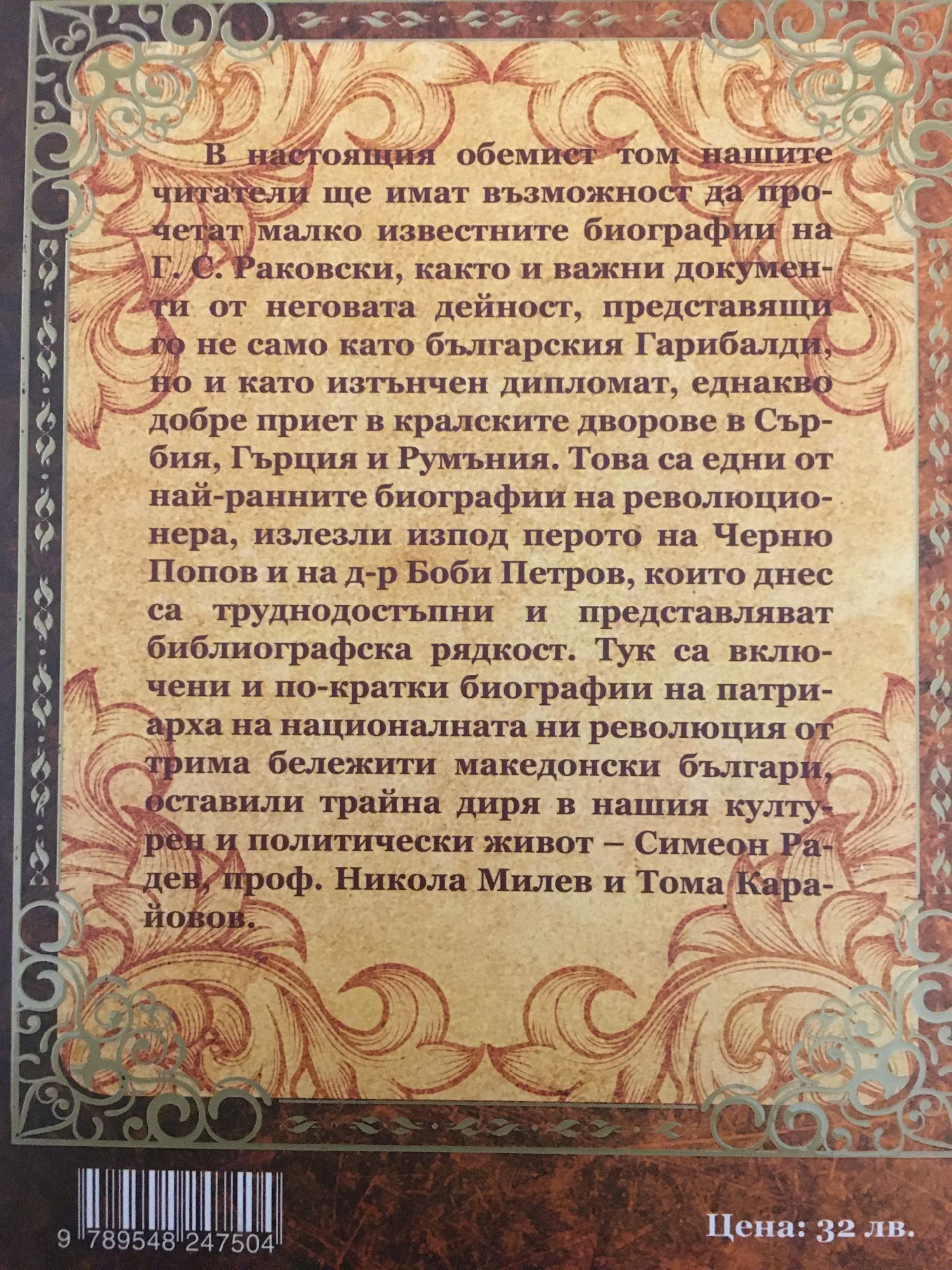 В настоящия обемист том нашите читатели ще имат възможност да прочетат малко известните биографии на Г. С. Раковски, както и важни документи от неговата дейност, представящи го не само като българския Гарибалди, но и като изтънчен дипломат, еднакво добре приет в кралските дворове в Сърбия, Гърция и Румъния. Това са едни от най-ранните биографии на революционера, излезли изпод перото на Черню Попов и на д-р Боби Петров, които днес са труднодостъпни и представляват библиографска рядкост. Тук са включени и по-кратки биографии на патриарха на националната ни революция от трима бележити македонски българи, оставили трайна диря в нашия културен и политически живот - Симеон Радев, проф. Никола Милев и Тома Карайовов.