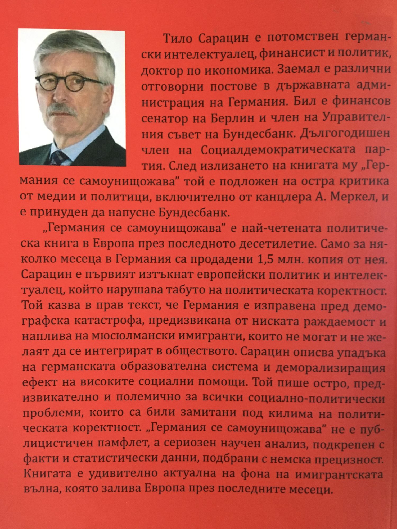 Тило Сарацин е потомствен германски интелектуалец, финансист и политик, доктор по икономика. Заемал е различни отговорни постове в държавната администрация на Германия. Бил е финансов сенатор на Берлин и член на Управителния съвет на Бундесбанк. Дългогодишен член на Социалдемократическата партия. След излизането на книгата му "Германия се самоунищожава" той е подложен на остра критика от медии и политици, включително от канцлера А. Меркел, и е принуден да напусне Бундесбанк. "Германия се самоунищожава" е най-четената политическа книга в Европа през последното десетилетие. Само за няколко месеца в Германия са продадени 1,5 млн. копия от нея. Сарацин е първият изтъкнат европейски политик и интелектуалец, който нарушава табуто на политическата коректност. Той казва в прав текст, че Германия е изправена пред демографска катастрофа, предизвикана от ниската раждаемост и наплива на мюсюлмански имигранти, които не могат и не желаят да се интегрират в обществото. Сарацин описва упадъка на германската образователна система и деморализиращия ефект на високите социални помощи. Той пише остро, предизвикателно и полемично за всички социално-политически проблеми, които са били замитани под килима на политическата коректност. "Германия се самоунищожава" не е публицистичен памфлет, а сериозен научен анализ, подкрепен с факти и статистически данни, подбрани с немска прецизност. Книгата е удивително актуална на фона на имигрантската вълна, която залива Европа през последните месеци.