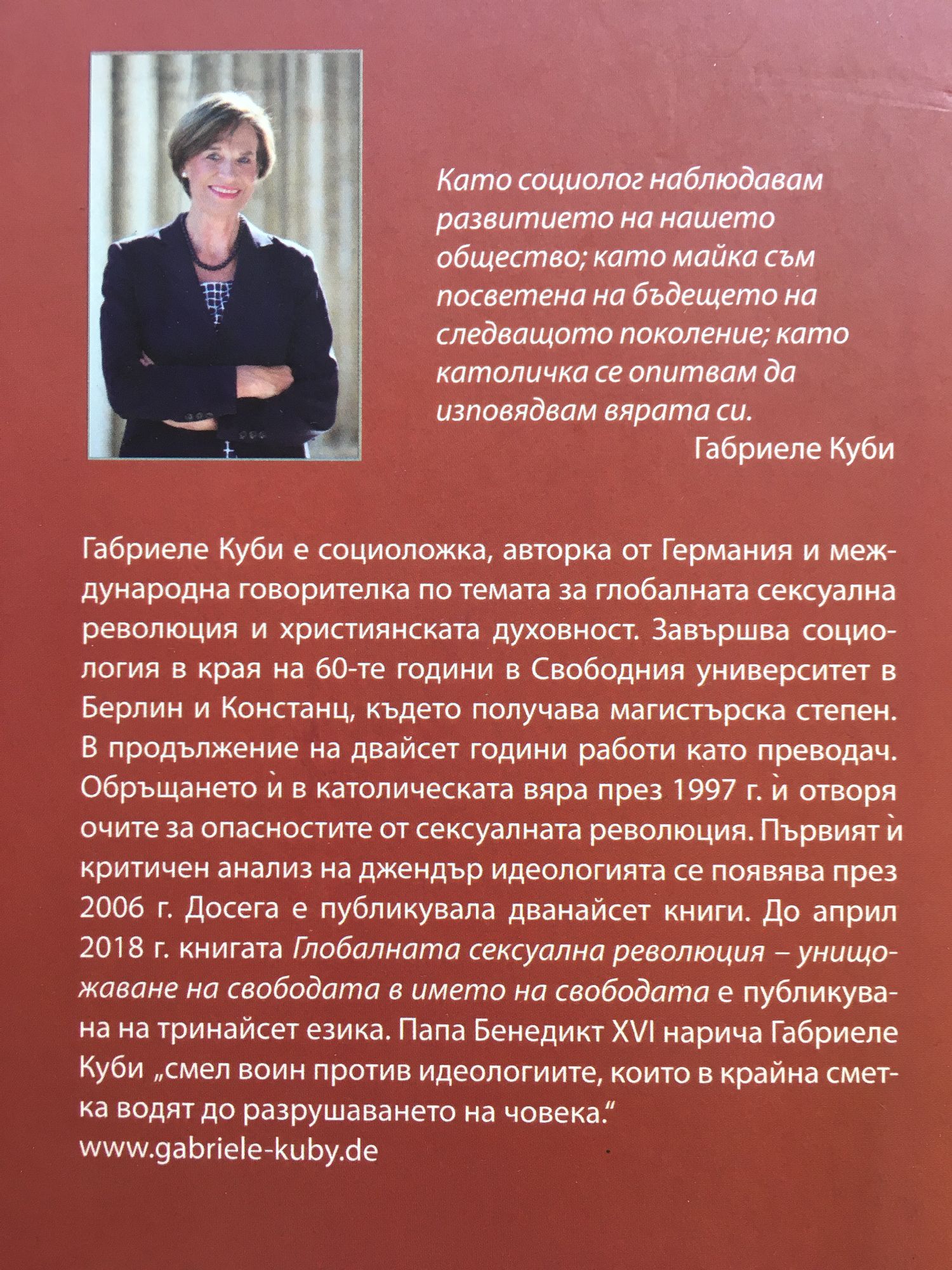 Габриеле Куби e социоложка, авторка от Германия и международна говорителка по темата за глобалната сексуална революция и християнската духовност. Завършва социология в края на 60-те години в Свободния университет в Берлин и Констанц, където получава магистърска степен. В продължение на двайсет години работи като преводач. Oбръщането й в католическата вяра през 1997 г. й отворя очите за опасностите от сексуалната революция. Първият й критичен анализ на джендър идеологията се появява през 2006 г. Досега е публикувала дванайсет книги. Папа Бенедикт XVI нарича Габриеле Куби „смел воин против идеологиите, които в крайна сметка водят до разрушаването на човека.“