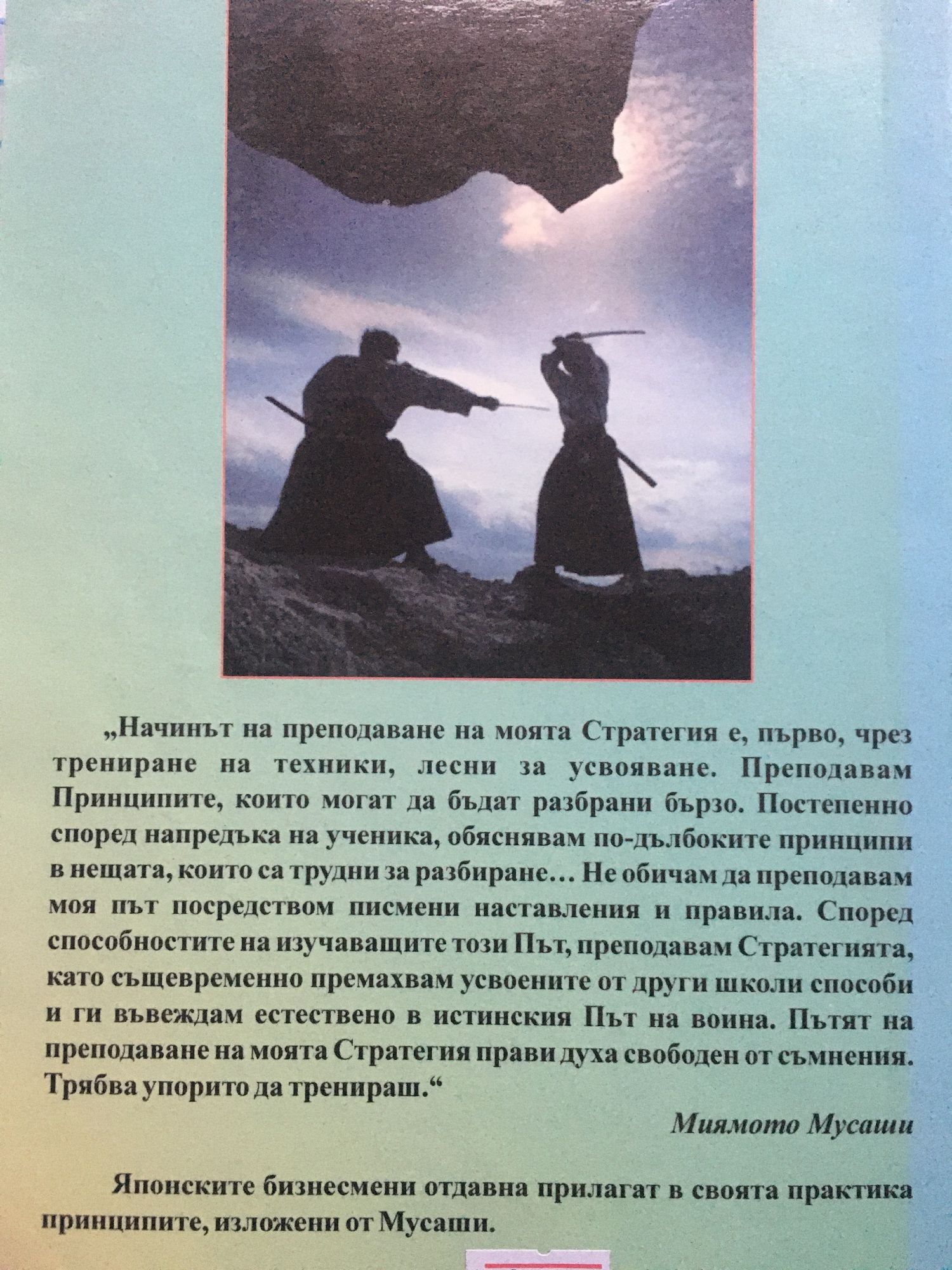 „Начинът на преподаване на моята стратегия е, първо трениране на техники, лесни за усвояване. Преподавам принципите, които могат да бъдат разбрани бързо. Постепенно според напредъка на ученика, обяснявам по- дълбоките принципи в нещата, които са трудни за разбиране. Пътят на преподаване на моята Стратегия прави духа свободен от съмнения. Трябва упорито да тренираш.“ Миямото Мусаши