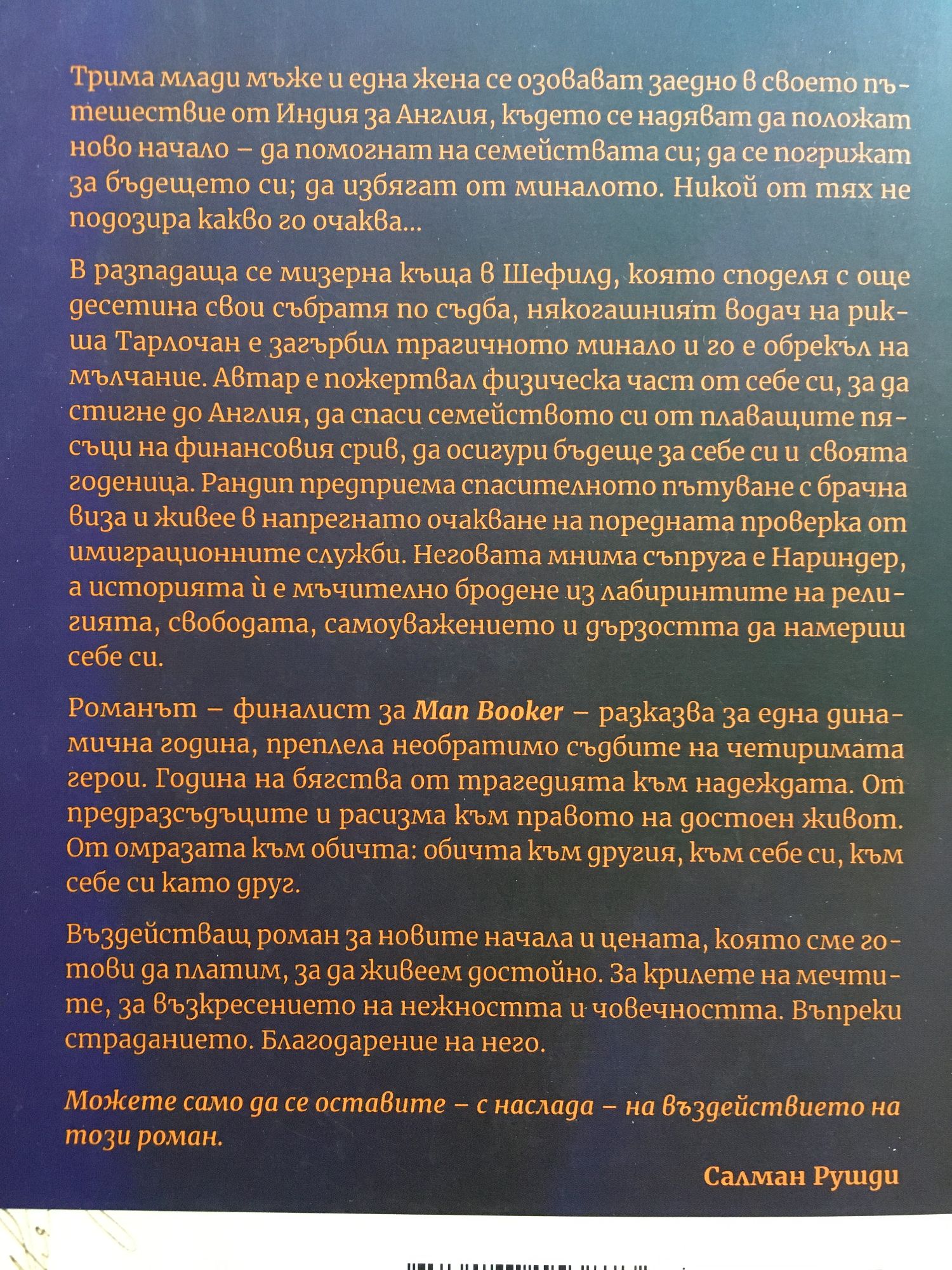 В рамките на една година, наситена с изпитания, трима млади мъже и една незабравима жена предприемат бягство от трудното си минало към надеждата за нов живот. Благонадеждният Автар пристигна в Англия със студентска виза, след като продава единия си бъбрек. Тайната му го задължава да закриля младия и наивен Рандип, мигрирал с уредена брачна виза в опит да подпомогне семейството си след нервния срив на своя баща. След като прекосява цяла Азия и Европа, в Шефилд се оказва и Тарлочан, мълчалив млад мъж от кастата на недокосваемите, напуснал Индия, след като близките му са избити от религиозни фанатици в Бихар. В Англия ги очаква една незабравима жена, набожната Нариндер от традиционно сикхско семейство, превърнала своя религиозен дълг в средоточие на живота си, ала принудена от шемета на непозволената си любов да преобрази себе си с покоряващо великодушие и непоклатимо благородство. Бягства от трагедията към мечтата, от Дарвинова борба за оцеляване към уютно и спокойно съществуване, от предразсъдъците и расизма към изконното човешко достойнство. Бягство от омразата към обичта: към другия, към себе си, към себе си като друг. Бягство от мръсния под на една закусвалня към края на един континент, където се срещат три морета, а Луната е тъй огромна и тъй близо, че сякаш можеш да я докоснеш. Бягство в овладяната дълбока емоция и щедрата емпатия на света, създаден от въображението на Санджив Сахота – непритворен и незабравим. Санджив Сахота е роден през 1981 година в Дарби. Следва математика в Импириъл Колидж в Лондон, а първият си роман прочита на 18-годишна възраст. Дебютният му роман „Наши са улиците“ (Ours Are The Streets) излиза през 2011 г. Observer нарича „безспорно изключителен“, а Times го определен като „дълбоко морално произведение, интелигентно и въздействащо“. Вторият му роман „Годината на бягствата“ (2015) печели награда „Анкор“ за най-добър втори роман, Европейската награда за литература за 2017 г. и попада в краткия списък за наградата „Ман Букър“. През 2013 г. Сахота влиза в списъка на двайсетте най-добри млади писатели на сп. „Гранта“. През 2018 г. е избран за член на Кралското литературно дружество в рамките на инициативата „40 автори под 40“. От 2019 г. Сахота преподава творческо писане в Дърамския университет. „Чета литература, за да разбера света. Наблюдавам живота на други хора в словесното пространство, родено от въображението, защото така преминавам по-пълноценно през своя живот.“ (Санджив Сахота)