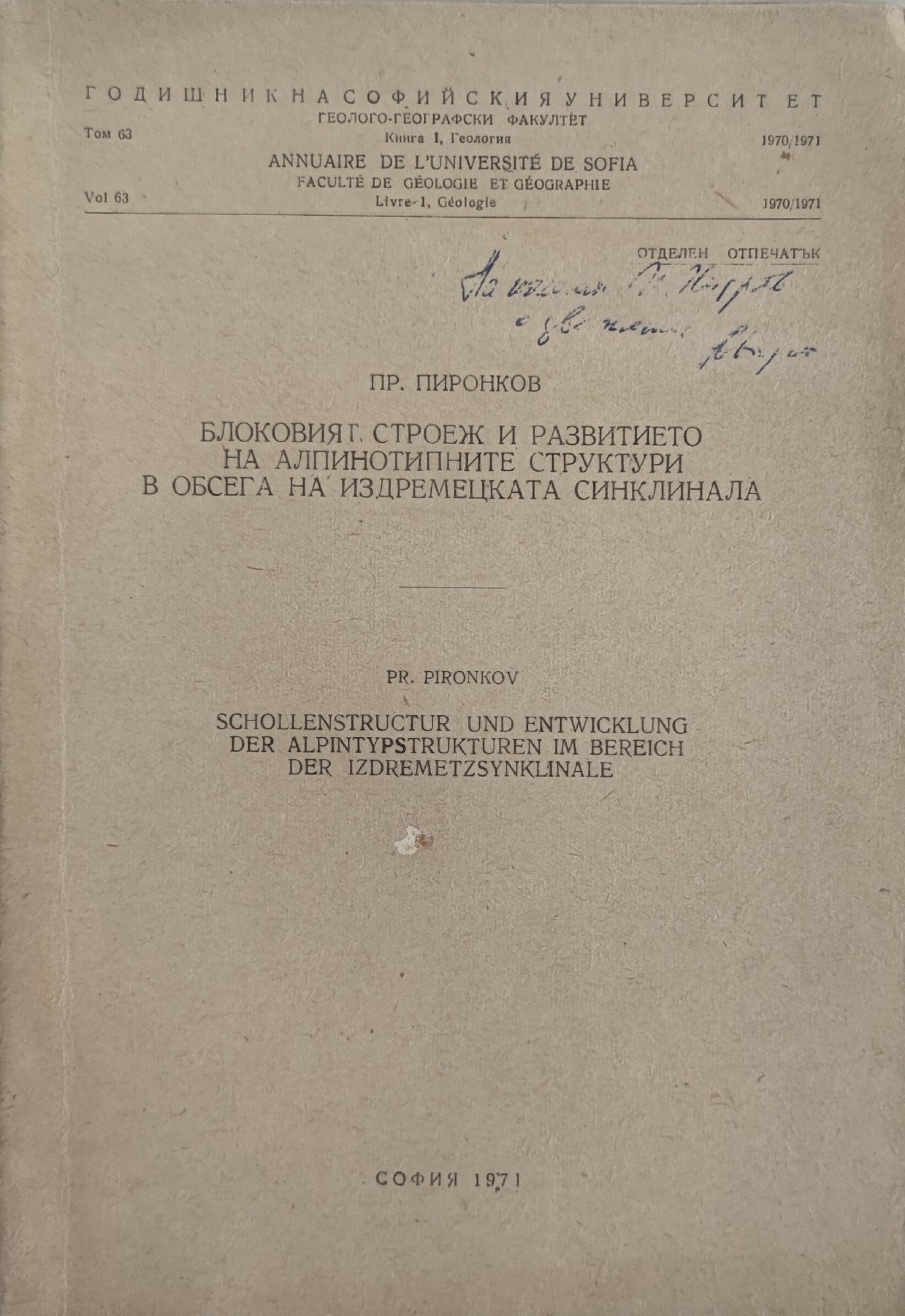 Годишник на Софийския университет. Геолого - географски факултет книга 1, Геология. Том 63. 1970/1971