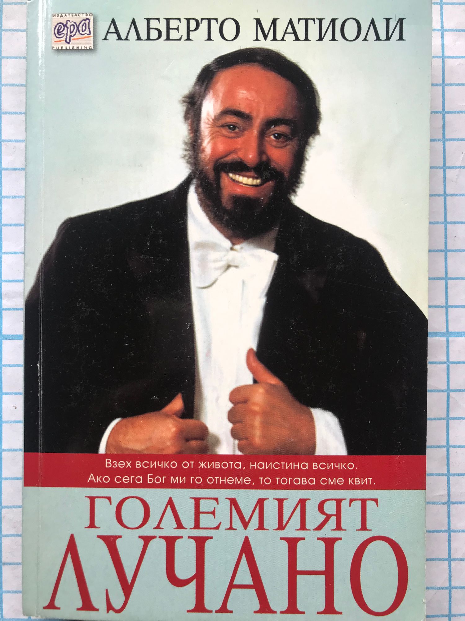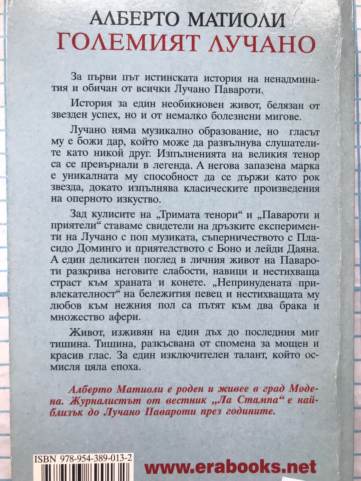 "Взех всичко от живота, наистина всичко. Ако сега Бог ми го отнеме, то тогава сме квит." - Павароти Алберто Матиоли Големият Лучано За първи път истинската история на ненадминатия и обичан от всички Лучано Павароти. История за един необикновен живот, белязан от звезден успех, но и от немалко болезнени мигове. Лучано няма музикално образование, но гласът му е божи дар, който може да развълнува слушателите като никой друг. Изпълненията на великия тенор са се превърнали в легенда. А негова запазена марка е уникалната му способност да се държи като рок звезда, докато изпълнява класическите произведения на оперното изкуство. Зад кулисите на "Тримата тенори" и "Павароти и приятели" ставаме свидетели на дръзките експерименти на Лучано с поп музиката, съперничеството с Пласидо Доминго и приятелството с Боно и лейди Даяна. А един деликатен поглед в личния живот на Павароти разкрива неговите слабости, навици и нестихваща страст към храната и конете. "Непринудената привлекателност" на бележития певец и нестихващата му любов към нежния пол са пътят към два брака и множество афери. Живот, изживян на един дъх до последния миг тишина. Тишина, разкъсвана от спомена за мощен и красив глас. За един изключителен талант, който осмисля цяла епоха. Алберто Матиоли е роден и живее в град Модена. Журналистът от вестник "Ла Стампа" е най-близък до Лучано Павароти през годините.