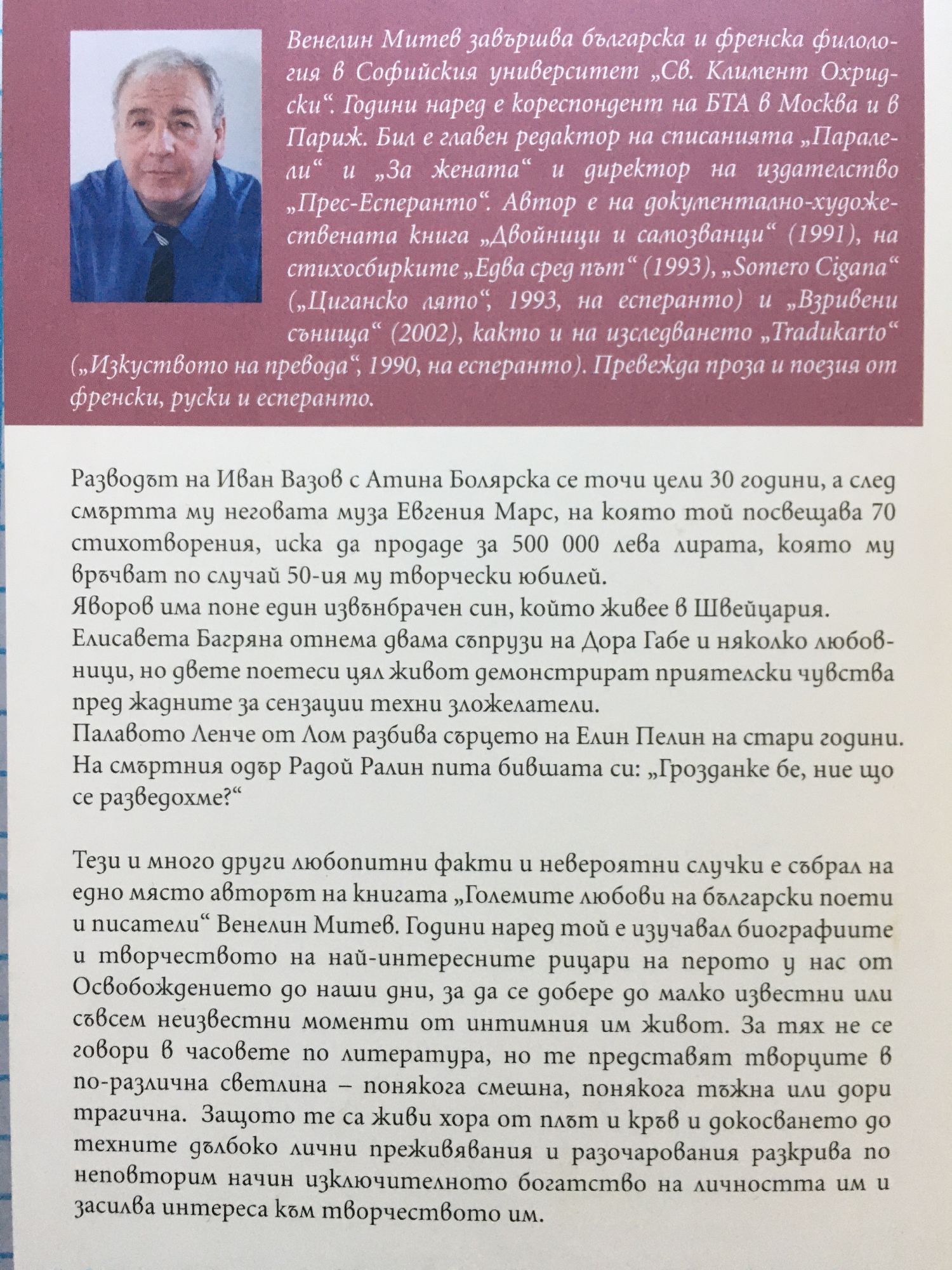 Разводът на Иван Вазов с Атина Болярска се точи цели 30 години, а след смъртта му неговата муза Евгения Марс, на която той посвещава 70 стихотворения, иска да продаде за 500 000 лева лирата, която му връчват по случай 50-ия му творчески юбилей. Яворов има поне един извънбрачен син, който живее в Швейцария. Елисавета Багряна отнема двама съпрузи на Дора Габе и няколко любовници, но двете поетеси цял живот демонстрират приятелски чувства пред жадните за сензации техни зложелатели. Палавото Ленче от Лом разбива сърцето на Елин Пелин на стари години. На смъртния одър Радой Ралин пита бившата си: „Грозданке бе, ние що се разведохме?”