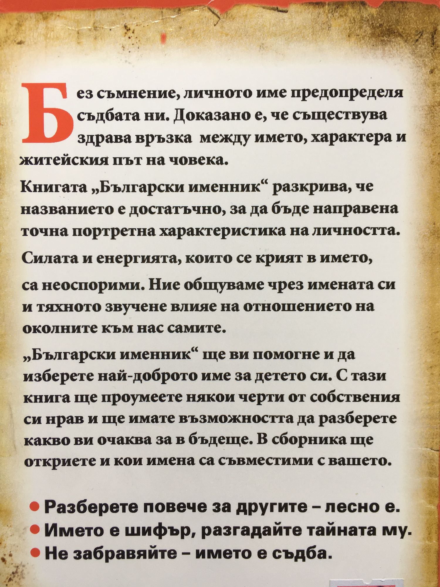 Без съмнение, личното име предопределя съдбата ни. Докамано е, че съществува здрава връзка между името, характера и житейският път на човека. Книгата "Български именник" разкрива, че названието е достатъчно, за да бъде направена точна портретна характеристика на личността. Силата и енергията, които се крият в името, са неоспорими. Ние общуваме чрез имената си и тяхното звучене влияе на отношението на околните към самите нас. "Български именник" ще ви помогне и да изберете най-доброто име за детето си. С тази книга ще проумеете някои черти от собствения си нрав и ще имате възможността да разерете какво ви очаква за в бъдеще. В сборника ще откриете и кои имена са съвместими с вашето.