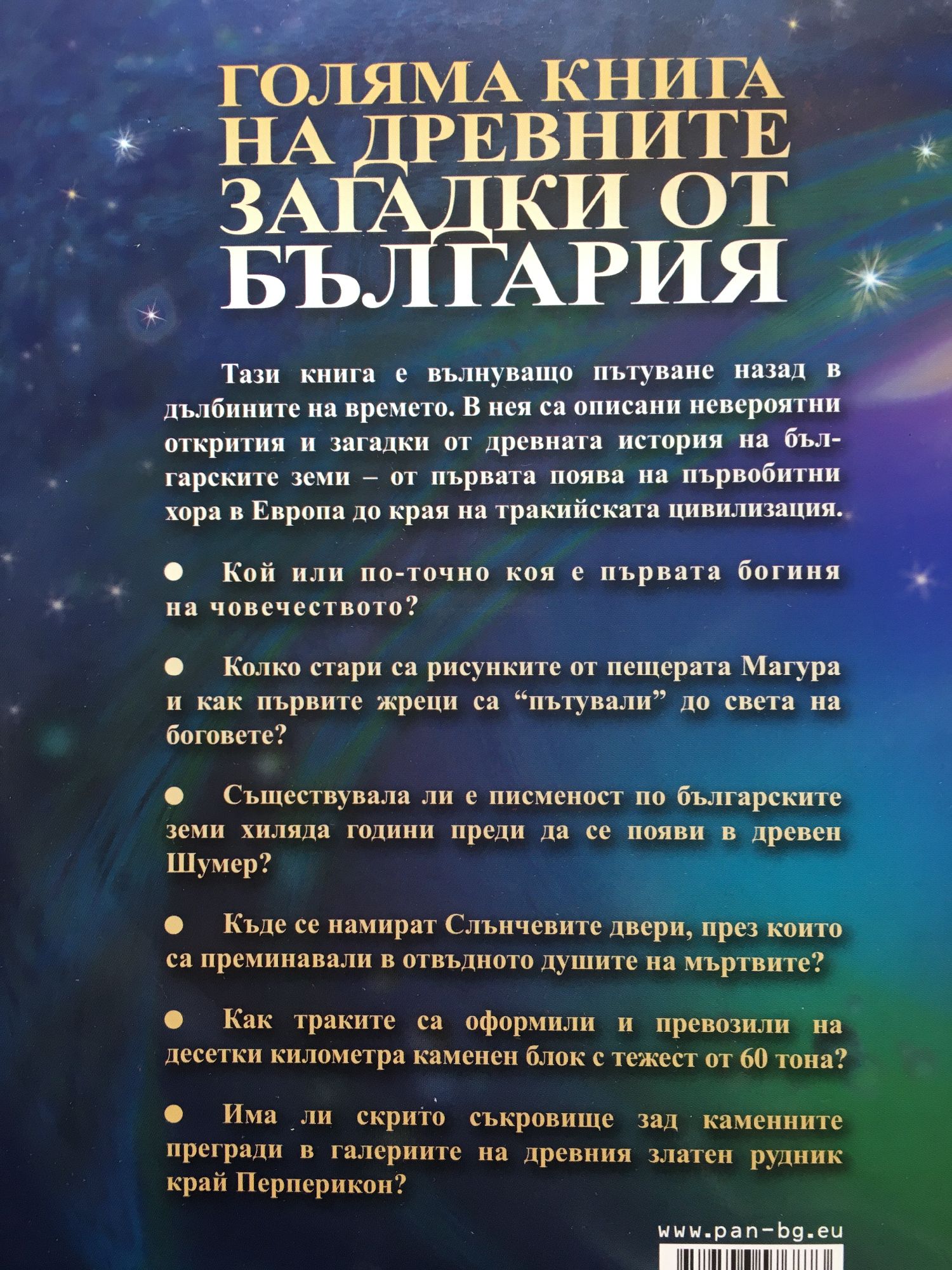 Тази книга е вълнуващо пътуване назад в дълбините на времето. В нея са описани невероятни открития и загадки от древната история на българските земи - от първата поява на първобитни хора в Европа до края на тракийската цивилизация. В книгата ще прочетете: - Кой или по-точно коя е първата богиня на човечеството? - Колко стари са рисунките от пещерата Магура и как първите жреци са "пътували" до света на боговете? - Съществувала ли е писменост по българските земи хиляда години преди да се появи в древен Шумер? - Къде се намират Слънчевите двери, през които са преминавали в отвъдното душите на мъртвите? - Как траките са оформили и превозили на десетки километра каменен блок с тежест от 60 тона? - Има ли скрито съкровище зад каменните прегради в галериите на древния златен рудник край Перперикон?