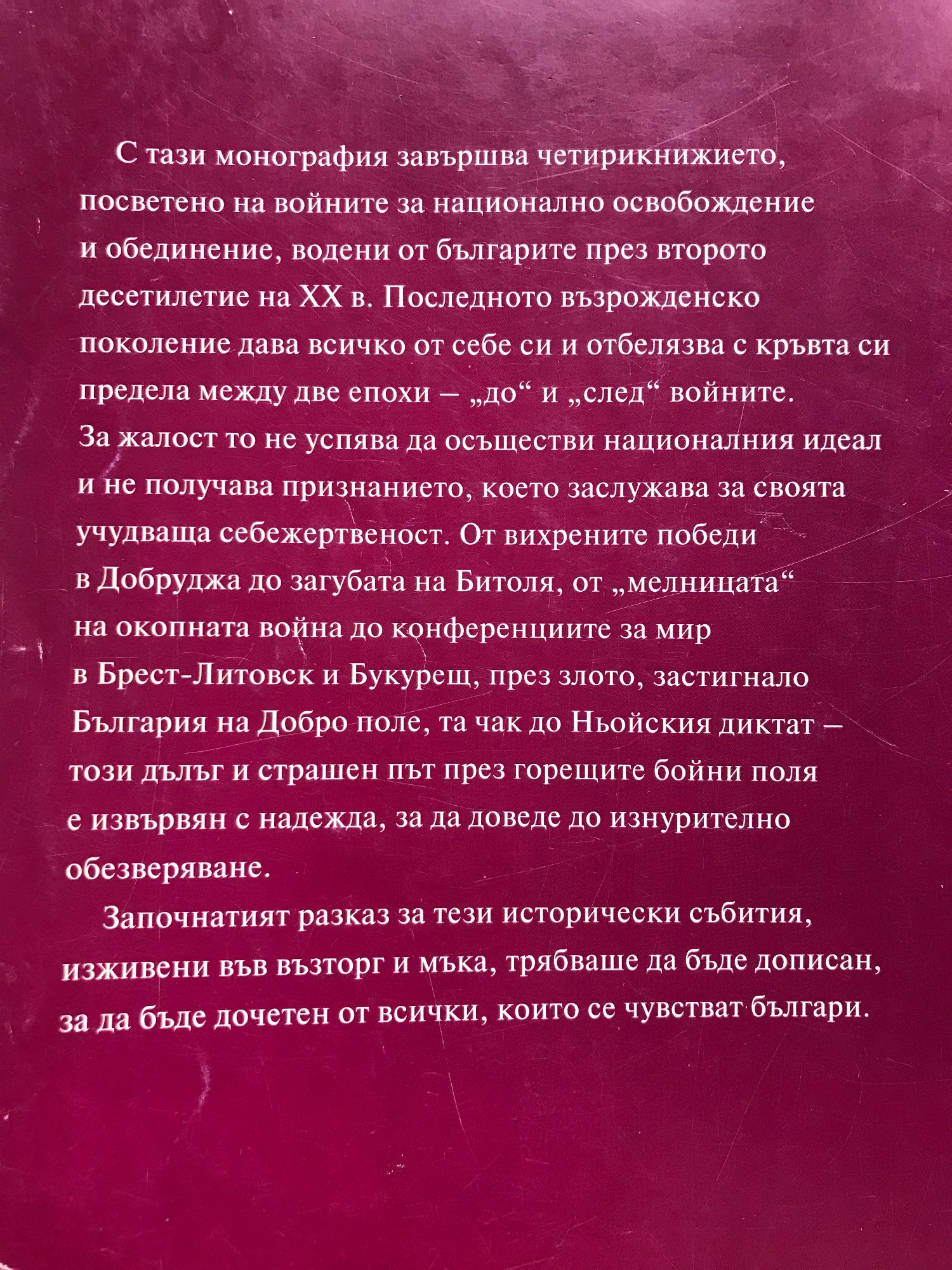 С тази монография завършва четирикнижието, посветено на войните за национално освобождение и обединение, водени от българите през второто десетилетие на XX в. Последното възрожденско поколение дава всичко от себе си и отбелязва с кръвта си предела между две епохи — "до" и "след" войните. За жалост не успява да осъществи националния идеал и не получава признанието, което заслужава за своята учудваща себежертвеност. От вихрените победи в Добруджа до загубата на Битоля, от "мелницата" на окопната война до конференциите за мир в Брест-Литовск и Букурещ, през злото, застигнало България на Добро поле, та чак до Ньойския диктат — този дълъг и страшен път през горещите бойни поля е извървян с надежда, за да доведе до изнурително обезверяване. Започнатият разказ за тези исторически събития, изживени във възторг и мъка, трябваше да бъде дописан, за да бъде дочетен от всички, които се чувстват българи.