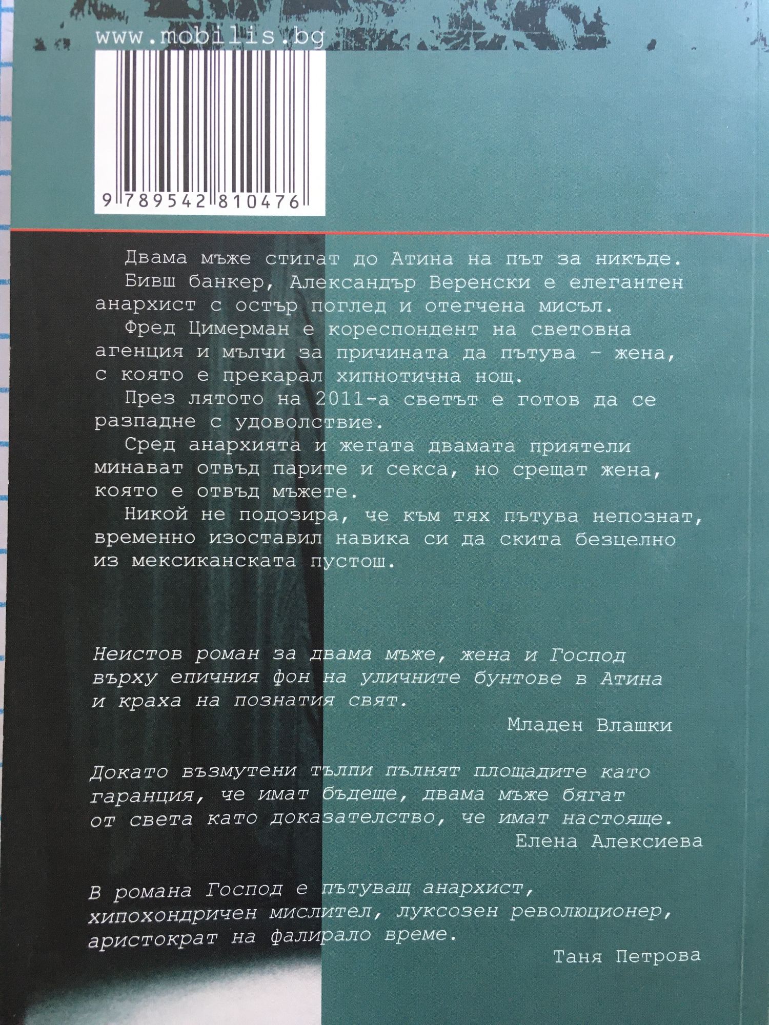 Двама мъже стигат до Атина на път за никъде. Бивш банкер, Александър Веренски е елегантен анархист с остър поглед и отегчена мисъл. Фред Цимерман е кореспондент на световна агенция и мълчи за причината да пътува - жена, с която е прекарал хипнотична нощ. През лятото на 2011-а светът е готов да се разпадне с удоволствие. Сред анархията и жегата двамата приятели минават отвъд парите и секса, но срещат жена, която е отвъд мъжете. Никой не подозира, че към тях пътува непознат, временно изоставил навика си да скита безцелно из мексиканската пустош. " Докато възмутени тълпи пълнят площадите като гаранция, че имат бъдеще, двама мъже бягат от света като доказателство, че имат настояще." Елена Алексиева