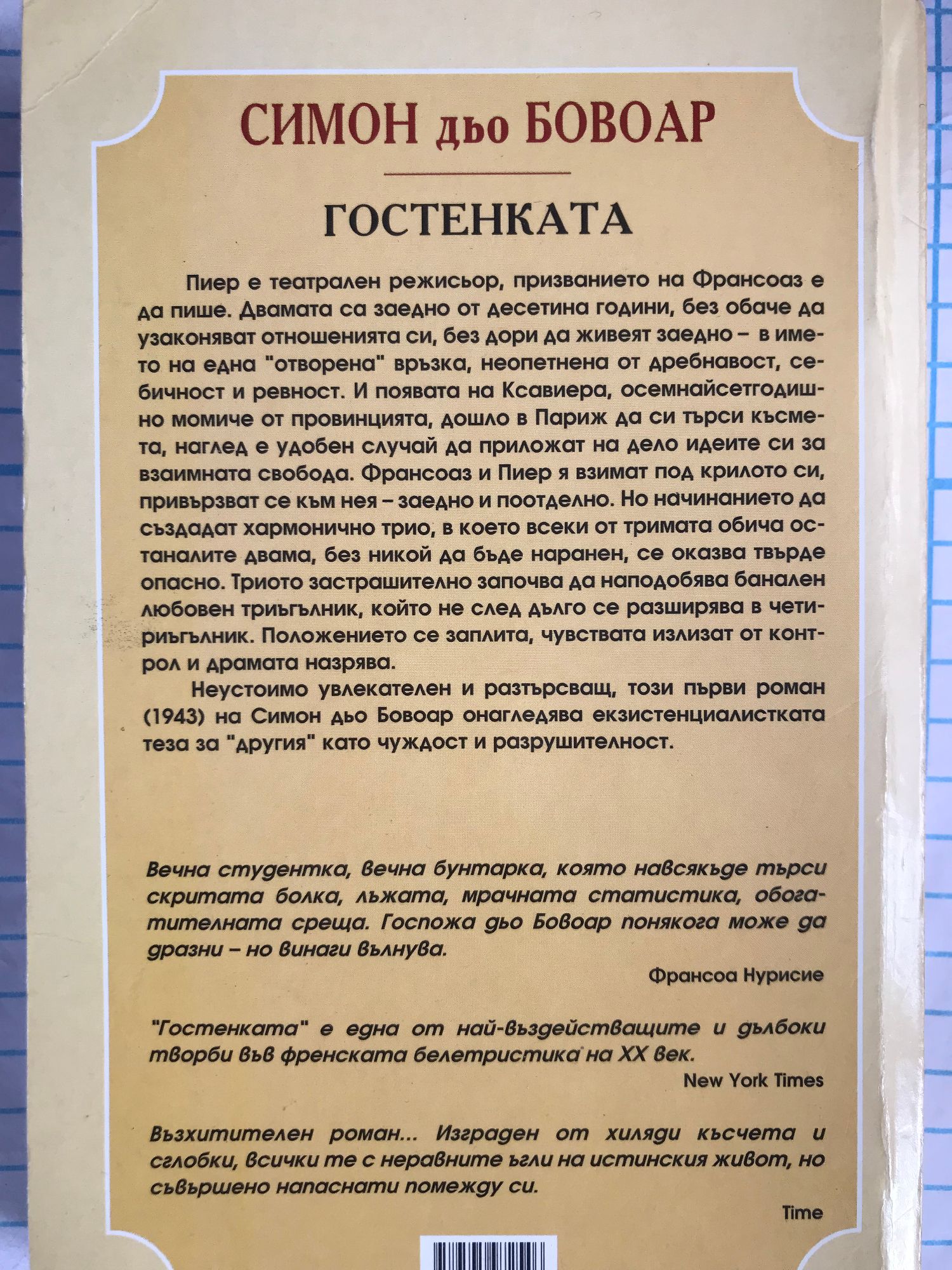 Неустоимо увлекателен и разтърсващ, този първи роман (1943) на Симон дьо Бовоар онагледява екзистенциалистката теза за "другия" като чуждост и разрушителност. "Гостенката" е една от най-въздействащите и дълбоки творби във френската белетристика на XX век. - New York Times Пиер е театрален режисьор, призванието на Франсоаз е да пише. Двамата са заедно от десетина години, без обаче да узаконяват отношенията си, без дори да живеят заедно - в името на една "отворена" връзка, неопетнена от дребнавост, себичност и ревност. И появата на Ксавиера, осемнайсетгодишно момиче от провинцията, дошло в Париж да си търси късмета, наглед е удобен случай да приложат на дело идеите си за взаимната свобода. Франсоаз и Пиер я взимат под крилото си, привързват се към нея - заедно и поотделно. Но начинанието да създадат хармонично трио, в което всеки от тримата обича останалите двама, без никой да бъде наранен, се оказва твърде опасно. Триото застрашително започва да наподобява банален любовен триъгълник, който не след дълго се разширява в четириъгълник. Положението се заплита, чувствата излизат от контрол и драмата назрява.