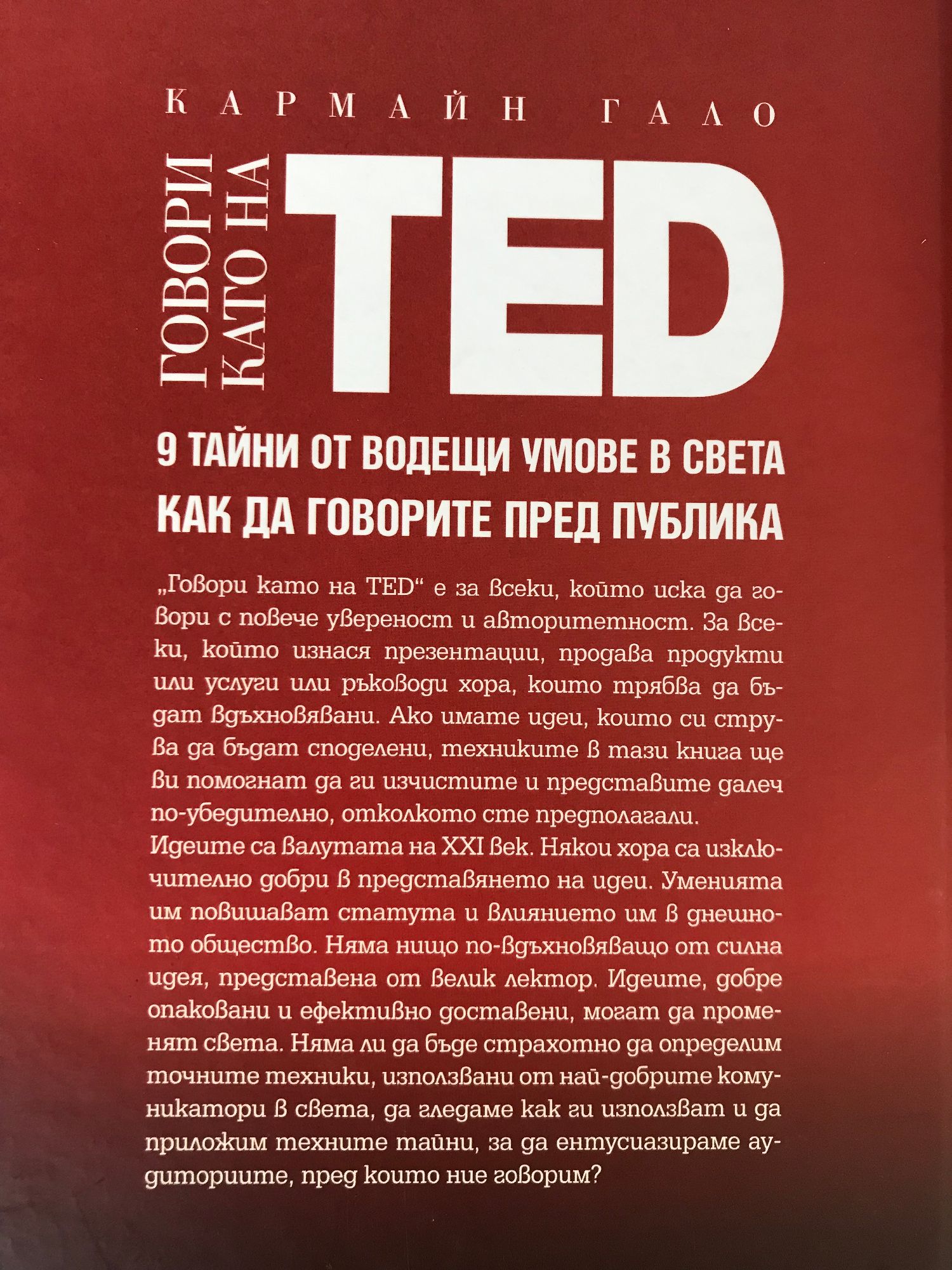„Говори като на TED“ е за всеки, който иска да говори с повече увереност и авторитетност. За всеки, който изнася презентации, продава продукти или услуги или ръководи хора, които трябва да бъдат вдъхновявани. Ако имате идеи, които си струва да бъдат споделени, техниките в тази книга ще ви помогнат да ги изчистите и представите далеч по-убедително, отколкото сте предполагали. Идеите са валутата на ХХI век. Някои хора са изключително добри в представянето на идеи. Уменията им повишават статута и влиянието им в днешното общество. Няма нищо по-вдъхновяващо от силна идея, представена от велик лектор. Идеите, добре опаковани и ефективно доставени, могат да променят света. Няма ли да бъде страхотно да определим точните техники, използвани от най-добрите комуникатори в света, да гледаме как ги използват и да приложим техните тайни, за да ентусиазираме аудиториите, пред които ние говорим?