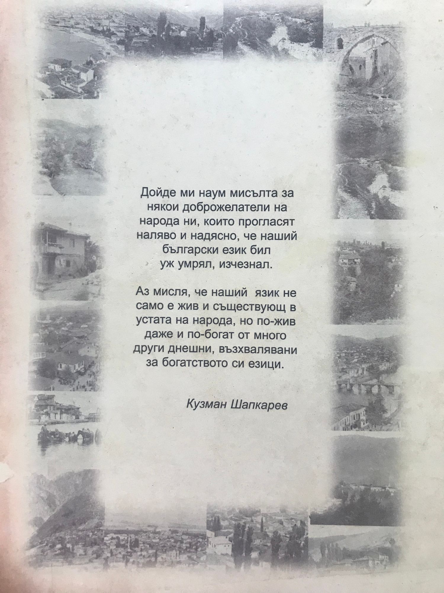 Дойде ми наум мисълта за някои доброжелатели на народа ни, които прогласят наляво и надясно, че наший български език бил уж умрял, изчезнал. Аз мисля, че наший язик не само е жив и съществующ в устата на народа, но по-жив даже и по-богат от много други днешни, възхвалявани за богатството си езици. Кузман Шапкарев