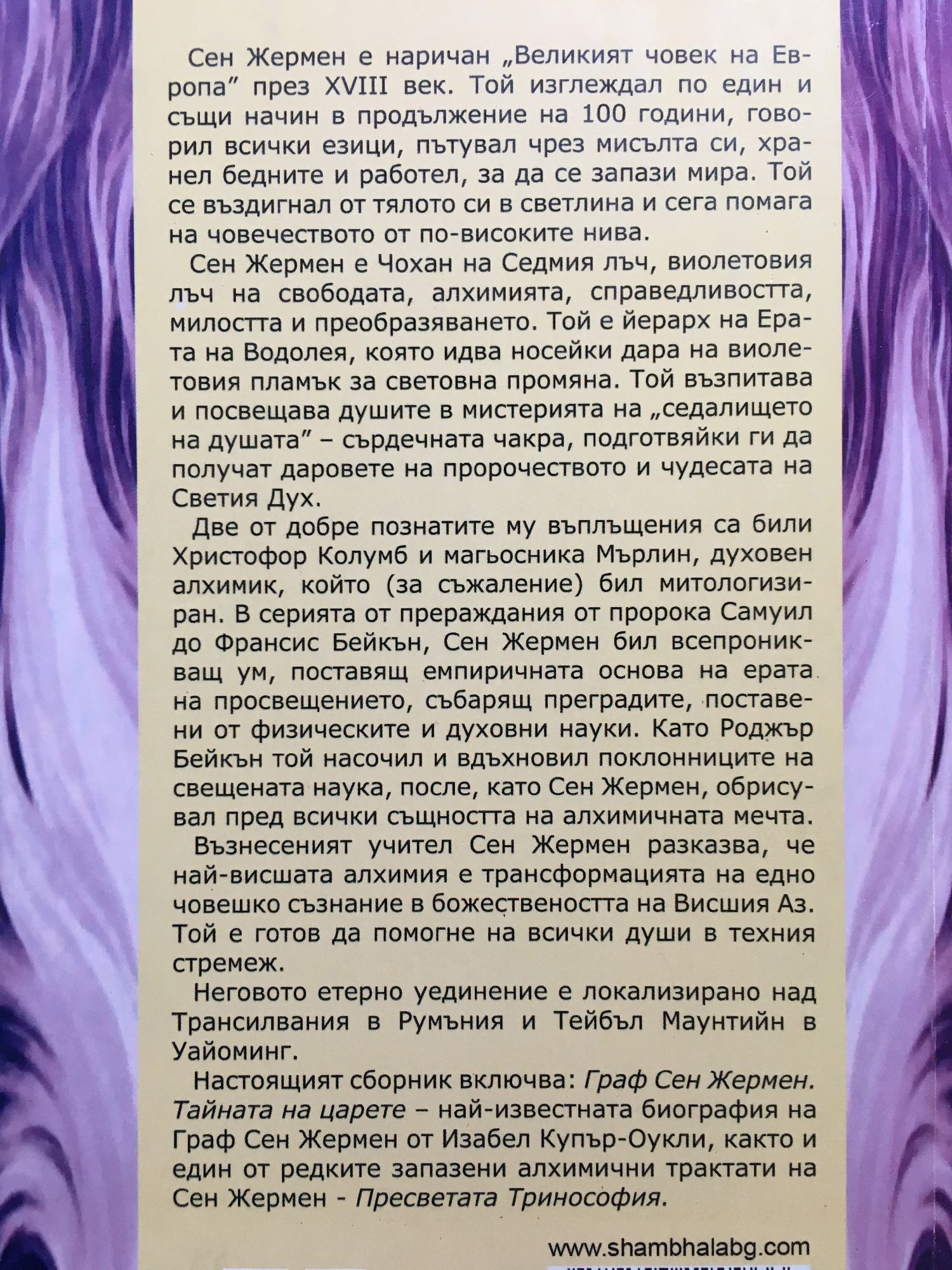 Сен Жермен е наричан „Великият човек на Европа" през XVIII век. Той изглеждал по един и същи начин в продължение на 100 години, говорил всички езици, пътувал чрез мисълта си, хранел бедните и работел, за да се запази мира. Той се въздигнал от тялото си в светлина и сега помага на човечеството от по-високите нива. Сен Жермен е Чохан на Седмия лъч, виолетовия лъч на свободата, алхимията, справедливостта, милостта и преобразяването. Той е йерарх на Ерата на Водолея, която идва носейки дара на виолетовия пламък за световна промяна. Той възпитава и посвещава душите в мистерията на „седалището на душата" - сърдечната чакра, подготвяйки ги да получат даровете на пророчеството и чудесата на Светия Дух. Две от добре познатите му въплъщения са били Христофор Колумб и магьосника Мърлин, духовен алхимик, който (за съжаление) бил митологизиран. В серията от прераждания от пророка Самуил до Франсис Бейкън, Сен Жермен бил всепроникващ ум, поставящ емпиричната основа на ерата на просвещението, събарящ преградите, поставени от физическите и духовни науки. Като Роджър Бейкън той насочил и вдъхновил поклонниците на свещената наука, после, като Сен Жермен, обрисувал пред всички същността на алхимичната мечта. Възнесеният учител Сен Жермен разказва, че най-висшата алхимия е трансформацията на едно човешко съзнание в божествеността на Висшия Аз. Той е готов да помогне на всички души в техния стремеж. Неговото етерно уединение е локализирано над Трансилвания в Румъния и Тейбъл Маунтийн в Уайоминг.