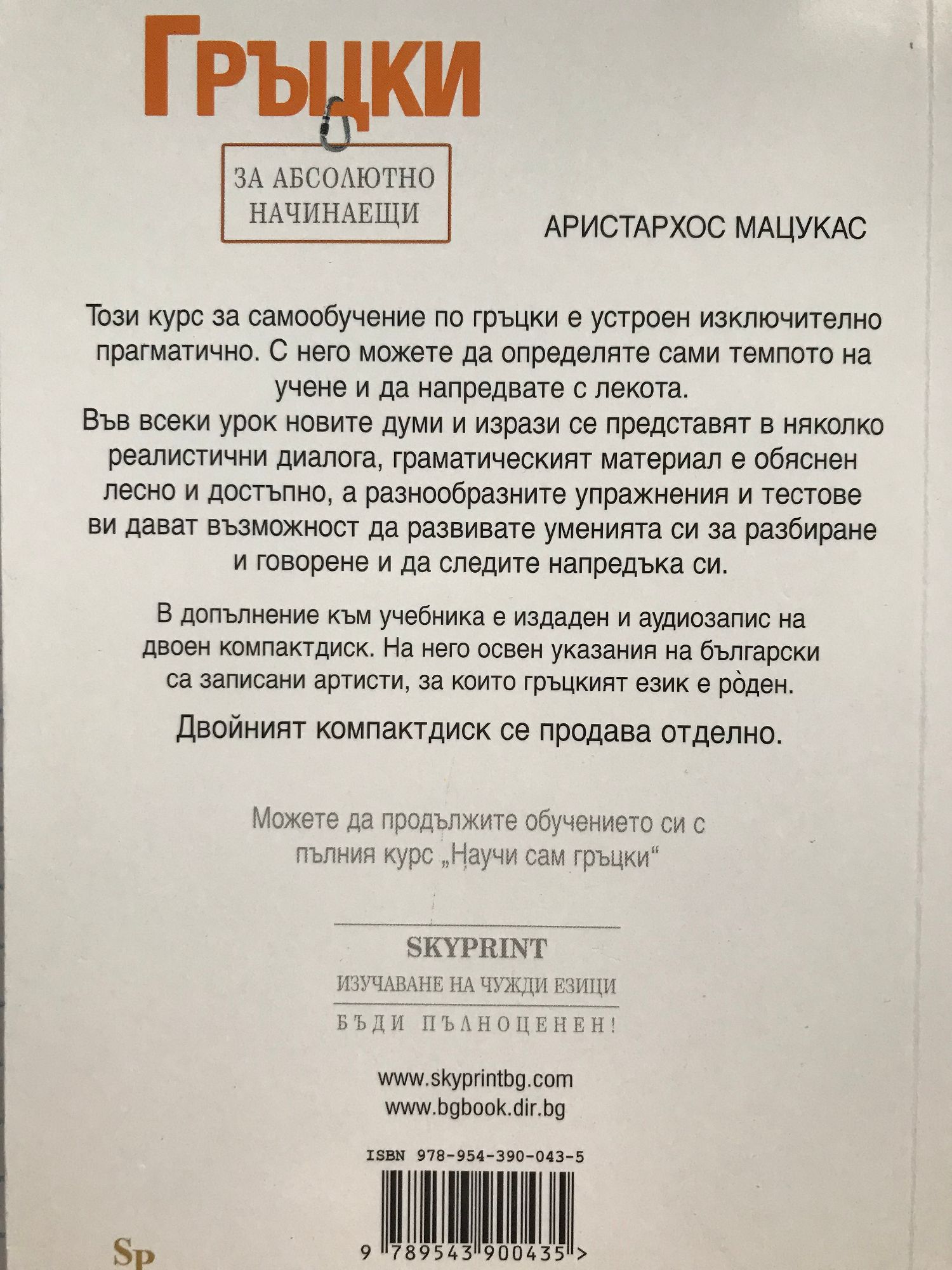 Този курс за самообучение по гръцки е устроен изключително прагматично. С него можете да определяте сами темпото на учене и да напредвате с лекота. Във всеки урок новите думи и изрази се представят в няколко реалистични диалога, граматическият материал е обяснен лесно и достъпно, а разнообразните упражнения и тестове ви дават възможност да развивате уменията си за разбиране и говорене и да следите напредъка си. В допълнение към учебника е издаден и аудиозапис на двоен компактдиск. На него освен указания на български са записани артисти, за които гръцкият език е роден. Двойният компактдиск се продава отделно.