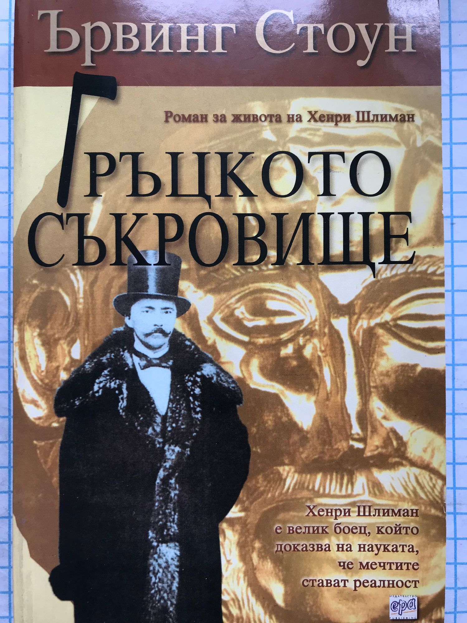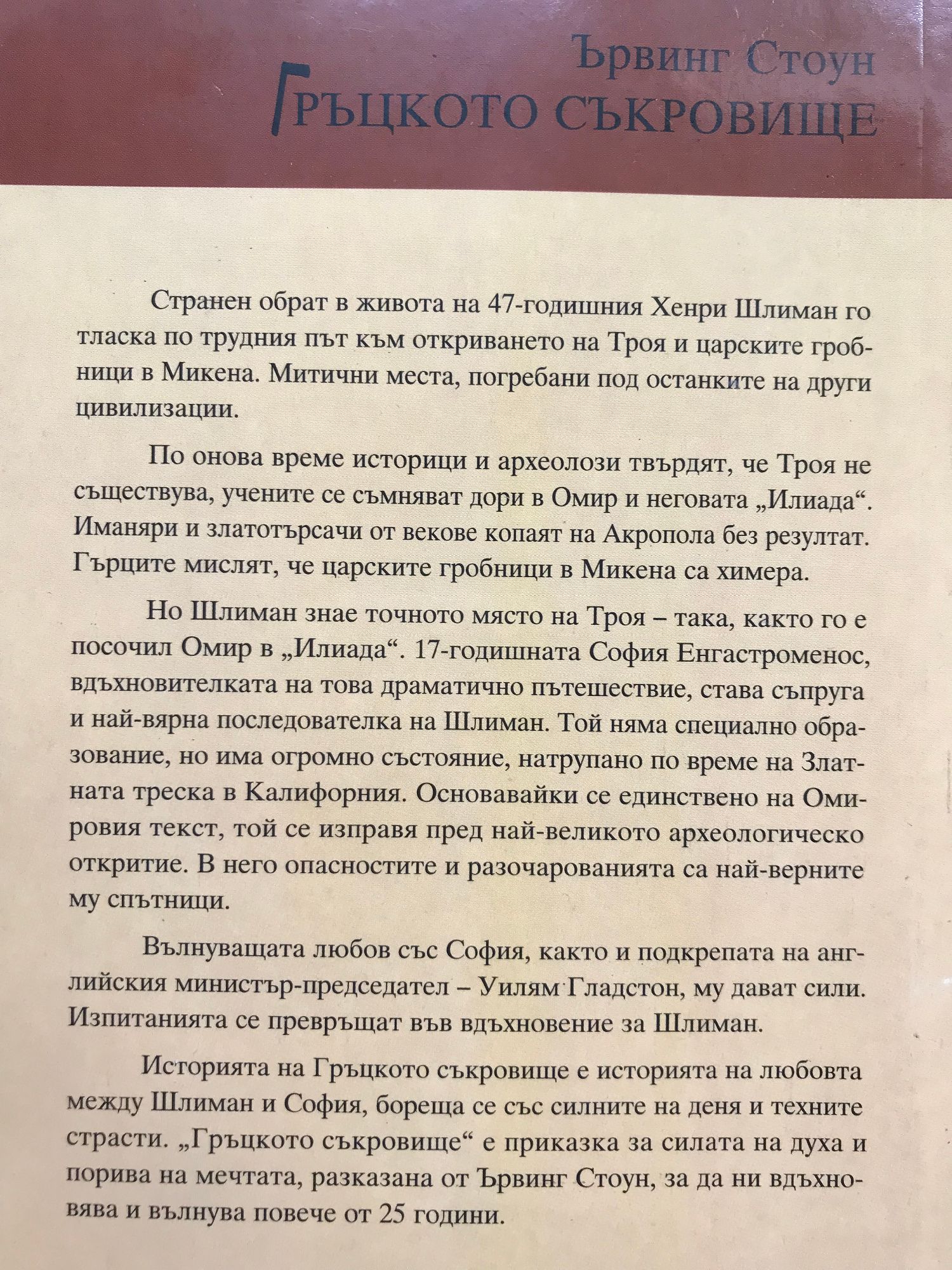 Хайнрих Шлиман е велик боец, който доказва на науката, че мечтите стават реалност Странен обрат в живота на 47-годишния Хенри Шлиман го тласка по трудния път към откриването на Троя и царските гробници в Микена. Митични места, погребани под останките на други цивилизации. По онова време историци и археолози твърдят, че Троя не съществува, учените се съмняват дори в Омир и неговата “Илиада”. Иманяри и златотърсачи от векове копаят на Акропола без резултат. Гърците мислят, че царските гробници в Микена са химера. Но Шлиман знае точното място на Троя- така, както го е посочил Омир в “Илиада”. 17-годишната София Енгастроменос, вдъхновителката на това драматично пътешествие, става съпруга и най-вярна последователка на Шлиман. Той няма специално образование, но има огромно състояние, натрупано по време на Златната треска в Калифорния. Основавайки се единствено на Омировия текст, той се изправя пред най-великото археологическо откритие. В него опасностите и разочарованията са най-верните му спътници. Вълнуващата любов със София, както и подкрепата на английския министър-председател- Уилям Гладстон, му дават сили. Изпитанията се превръщат във вдъхновение за Шлиман. Историята на Гръцкото съкровище е историята на любовта между Шлиман и София, бореща се със силните на деня и техните страсти. “Гръцкото съкровище” е приказка за силата на духа и порива на мечтата, разказана от Ървинг Стоун, за да ни вдъхновява и вълнува повече от 25 години.