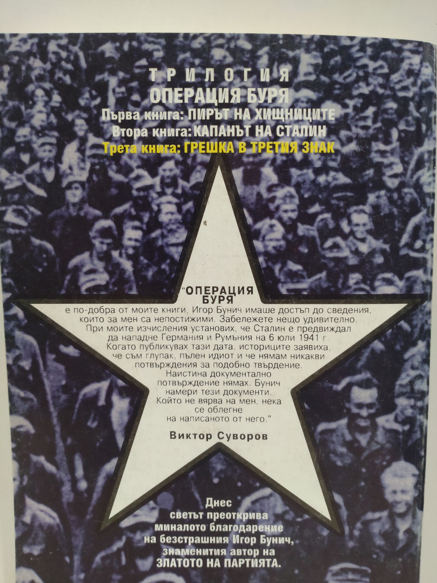 "Операция буря е по-добра от моите книги. Игор Бунич имаше достъп до сведения които за мен са непостижими. Забележете нещо удивително. При моите изчисления установих, че Сталин е предвиждал да нападне Германия и Румъния на 6 юли 1941 година. Когато публикувах тази дата, историците заявиха че съм глупак, Пълен идиот и че нямам никакви потвърждения за подобно твърдение. Наистина документално потвърждение нямах. Бунич намери тези документи. Който не вярва на мен, нека се облегне на написаното от него." Виктор Суворов