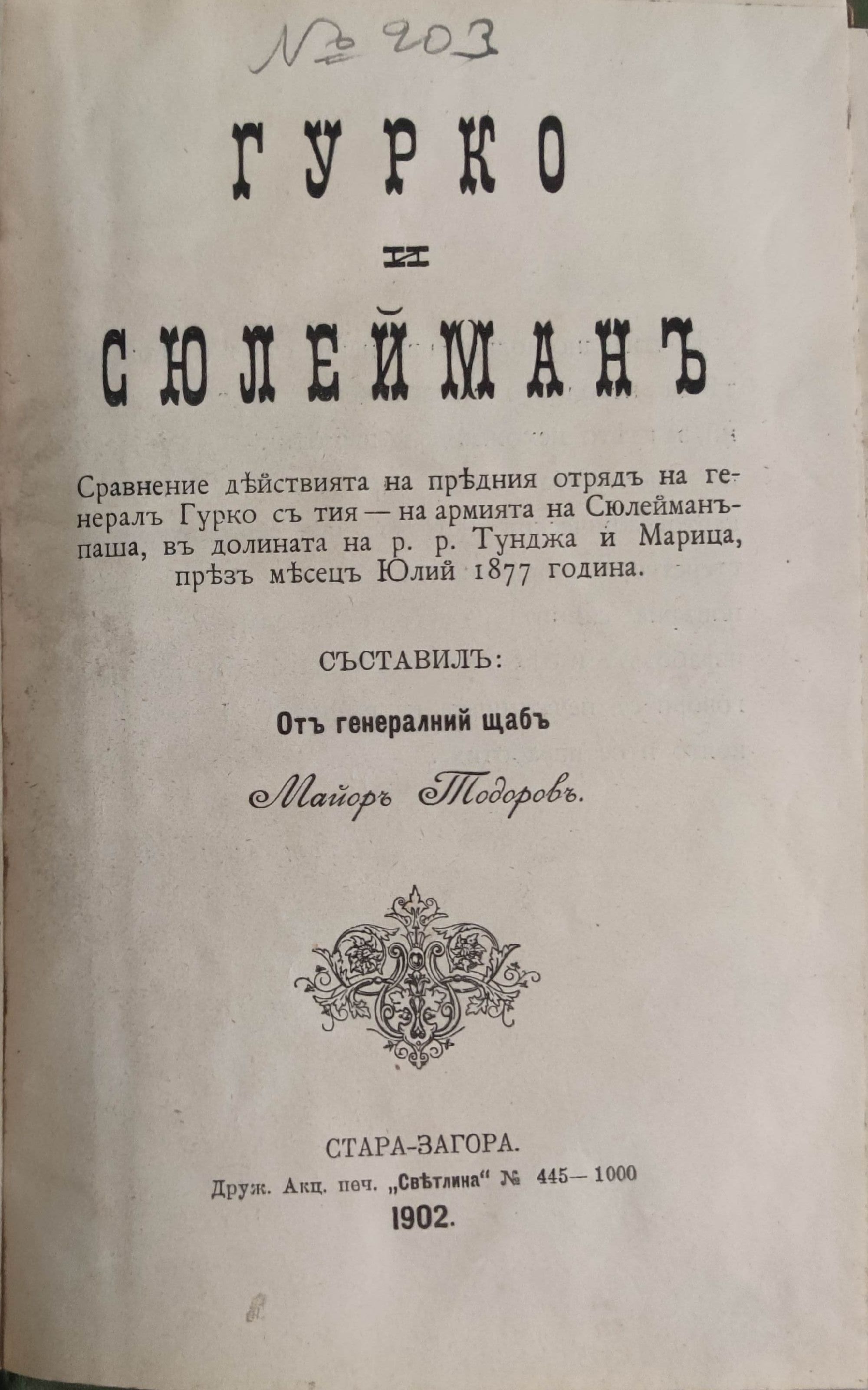 Сравнение действията на предния отрядъ на генералъ Гурко съ тия - на армията на Сюлейманъ - паша, въ долината на р. р. Тунджа и Марица, презъ месецъ Юлий 1877 година