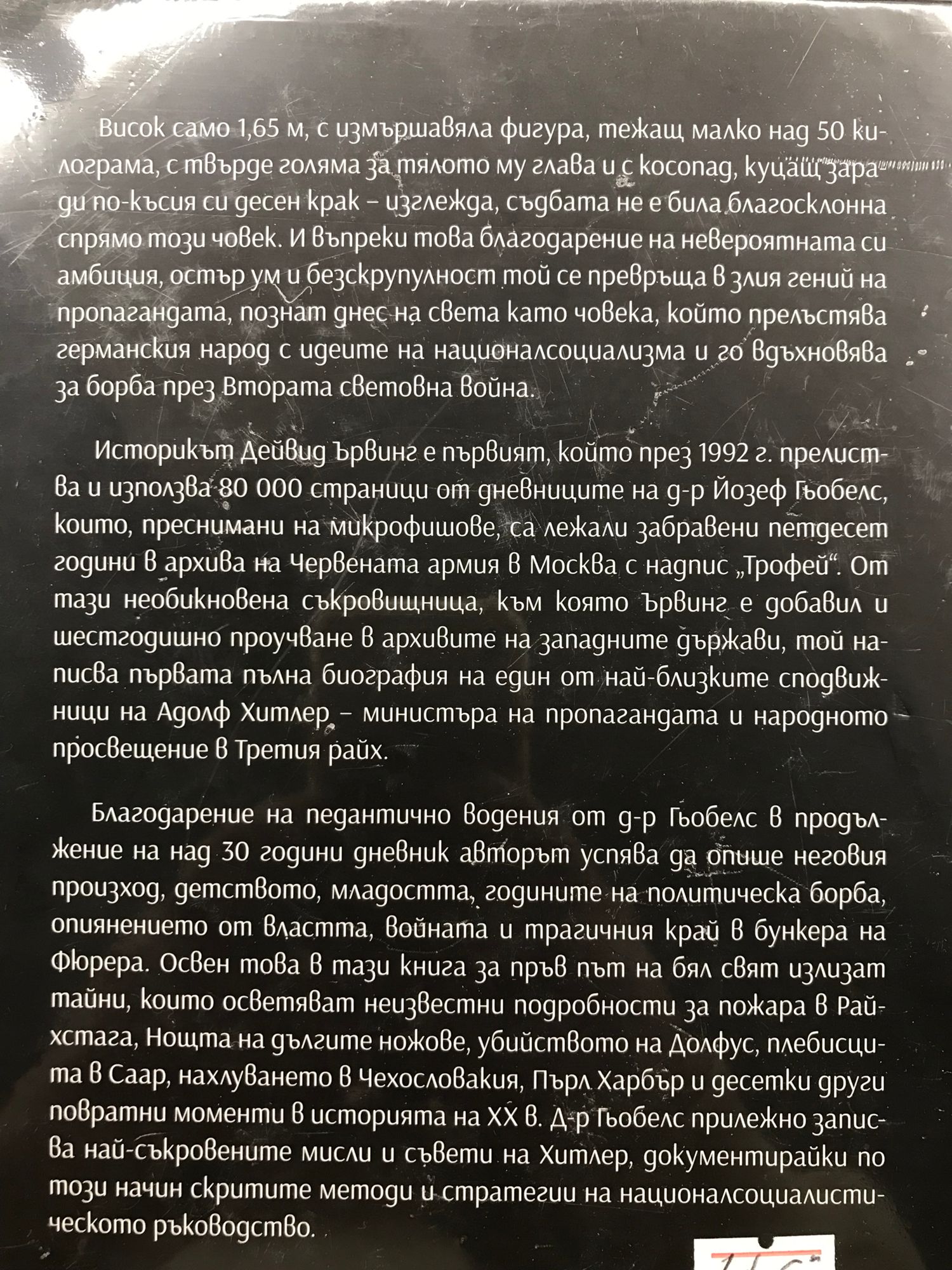 Висок само 1.65 m, с измършавяла фигура, тежащ малко над 50 килограма, с твърде голяма за тялото му глава и с косопад, куцащ заради по-късия си десен крак – изглежда, съдбата не е била благосклонна спрямо този човек. И въпреки това благодарение на невероятната си амбиция, остър ум и безскрупулност той се превръща в злия гений на пропагандата, познат днес на света като човека, който прелъстява германския народ с идеите на националсоциализма и го вдъхновява за борба през Втората световна война. Историкът Дейвид Ървинг е първият, който през 1992 г. прелиства и използва 80 000 страници от дневниците на д-р Йозеф Гьобелс, които, преснимани на микрофишове, са лежали забравени петдесет години в архива на Червената армия в Москва с надпис „Трофей“. От тази необикновена съкровищница, към която Ървинг е добавил и шестгодишно проучване в архивите на западните държави, той написва първата пълна биография на един от най-близките сподвижници на Адолф Хитлер – министъра на пропагандата и народното просвещение в Третия райх. Благодарение на педантично водения от д-р Гьобелс в продължение на над 30 години дневник авторът успява да опише неговия произход, детството, младостта, годините на политическа борба, опиянението от властта, войната и трагичния край в бункера на Фюрера. Освен това в книгата „Гьобелс. Вдъхновител на Третия райх“ за пръв път на бял свят излизат тайни, които осветяват неизвестни подробности за пожара в Райхстага, Нощта на дългите ножове, убийството на Долфус, плебисцита в Саар, нахлуването в Чехословакия, Пърл Харбър и десетки други повратни моменти в историята на ХХ в. Д-р Гьобелс прилежно записва най-съкровените мисли и съвети на Хитлер, документирайки по този начин скритите методи и стратегии на националсоциалистическото ръководство.