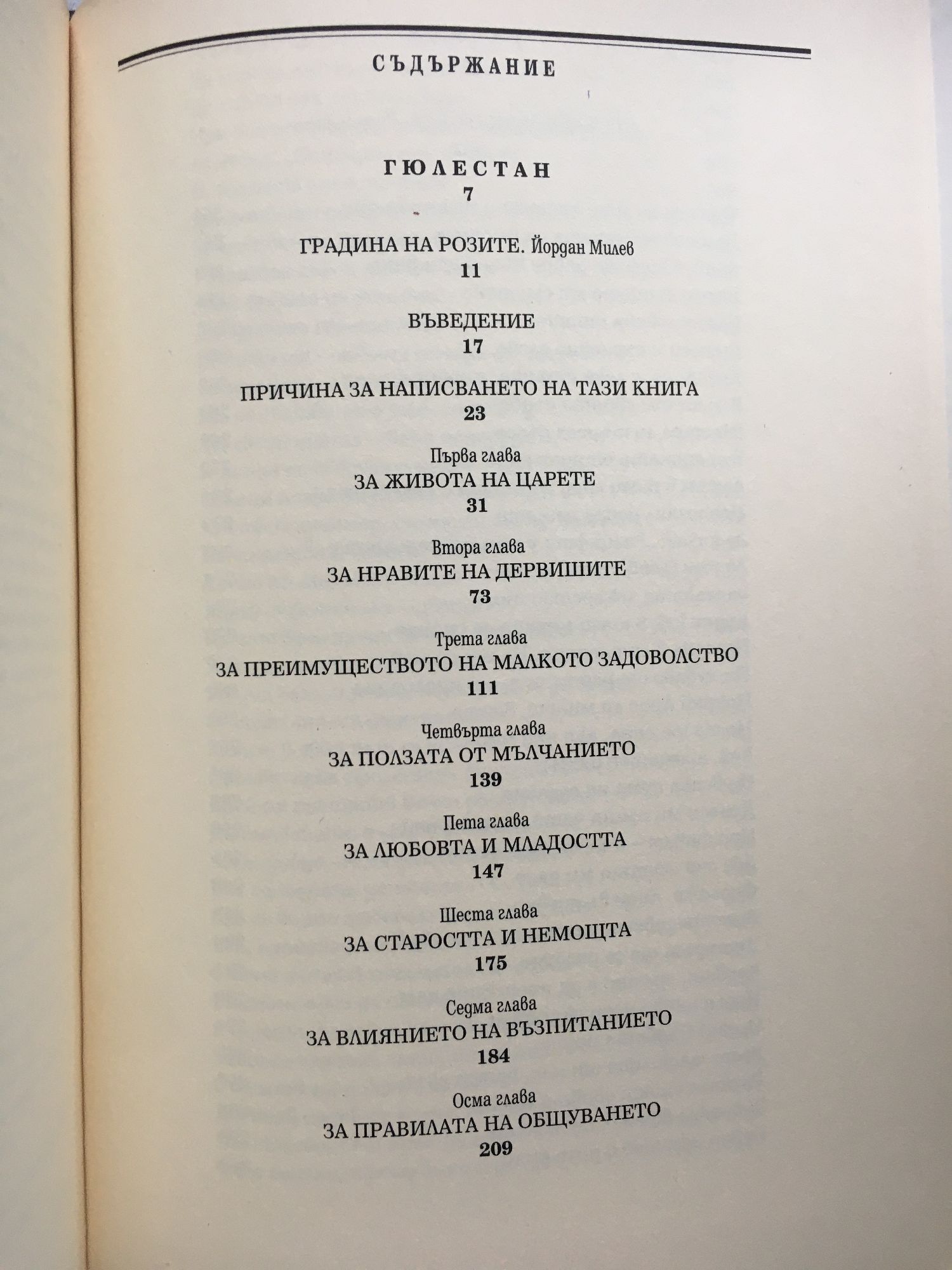 "В тази книга са представени двама велики персийски поети: Саади и Хафез. Първият от тях, живял през XIII век, е написал в последните години на живота си две знаменити поетически произведения: "Гюлестан" и "Бустан", а вторият, живял през XIV век, е прочут с безсмъртните си газели и рубаи за любовта, виното, свободомислието и човешките наслади като път от мигновеното към вечността." Йордан Милев "За какво ти е букет набран, по-добре вземи ти Гюлестан. Розата живее в срок уречен - моят Гюлестан ще бъде вечен." Из "Гюлестан" "С песен и сърдечно слово - пак, и пак, и пак отново! Вино пий, сърце орлово - пак, и пак, и пак отново! С хубавица като кукла, взел смолистата ѝ букла, поседи със чувство ново - пак, и пак, и пак отново! Радостта ли ще е наша, ако няма пълна чаша зарад времето сурово - пак, и пак, и пак отново! Нямам никаква защита от коприната ѝ впита, от сърцето ѝ готово - пак, и пак, и пак отново! Ветре! Ако пуснеш корен, разкажи ѝ с шепот морен от Хафез сърдечно слово - пак, и пак, и пак отново! Безброй момичета са влюбени - ти си единствена сред тях. За влюбените в мен момичета - единствен съм и аз, разбрах. Не срещнах никакво различие и в двата свята в моя път. Не ме съдете, резултатът им е бил и си остава - прах. Все пак на алчните кажете "За всеки краят е един!" Не трупайте пари, печалбата и загубата носят крах!" Безкрайно обожавам хората, съединили в любовта и думи, и дела. В признателност сред огъня им изгорях. Хафез, за миг склони главата пред знанието на ума! Могъщо е било сърцето, което знае що е грях." Из "Газели"