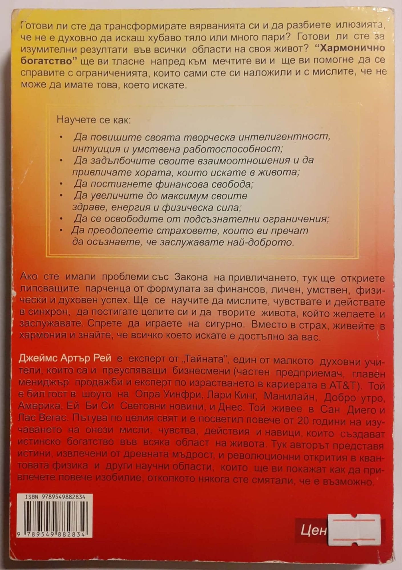 Готови ли сте да трансформирате вярванията си и да разбиете илюзията, че не е духовно да искаш хубаво тяло или много пари? Готови ли сте за изумителни резултати във всички области на своя живот? "Хармонично богатство" ще ви тласне напред към мечтите ви и ще ви помогне да се справите с ограниченията , които сами сте си наложили и с мислите, че не може да имате това, което искате. Ако сте имали проблеми със Закона на привличането, тук ще откриете липсващите парченца от формулата за финансов, личен, умствен, физически и духовен успех. Ще се научите да мислите, чувствате и действате в синхрон, да постигате целите си и да творите живота, който желаете и заслужавате. Спрете да играете на сигурно! Вместо в страх, живейте в хармония и знайте, че всичко което искате е достъпно за вас.