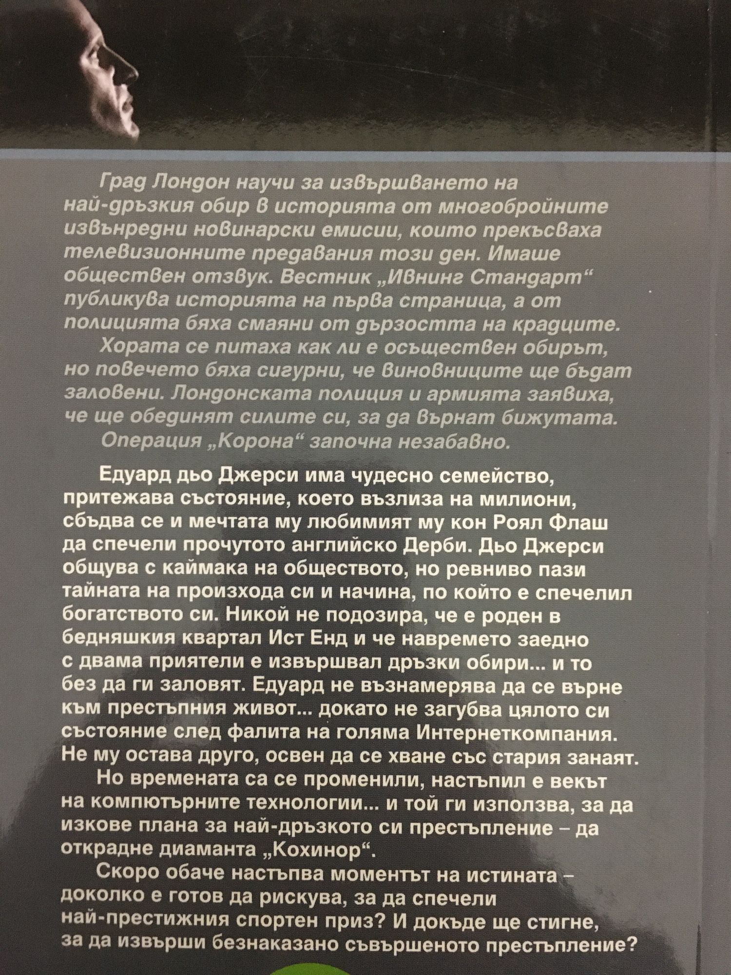 Град Лондон научи за извършването на най-дръзкия обир в историята от многобройните извънредни новинарски емисии, които прекъсваха телевизионните предавания този ден. Имаше обществен отзвук. Вестник "Ивнинг Стандарт" публикува историята на първа страница, а от полицията бяха смаяни от дързостта на крадците. Хората се питаха как ли е осъществен обирът, но повечето бяха сигурни, че виновниците ще бъдат заловени. Лондонската полиция и армията заявиха, че ще обединят силите си, за да върнат бижутата. Операция "Корона" започна незабавно. Едуард дьо Джерси има чудесно семейство, притежава състояние, което възлиза на милиони, сбъдва се и мечтата му любимият му кон Роял Флаш да спечели прочутото английско Дерби. Дьо Джерси общува с каймака на обществото, но ревниво пази тайната на произхода си и начина, по който е спечелил богатството си. Никой не подозира, че е роден в бедняшкия квартал Ист Енд и че навремето заедно с двама приятели е извършвал дръзки обири... и то без да ги заловят. Едуард не възнамерява да се върне към престъпния живот... докато не загубва цялото си състояние след фалита на голяма Интернеткомпания. Не му остава друго, освен да се хване със стария занаят. Но времената са се променили, настъпил е векът на компютърните технологии... и той ги използва, за да изкове плана за най-дръзкото си престъпление - да открадне диаманта "Кохинор". Скоро обаче настъпва моментът на истината -доколко е готов да рискува, за да спечели най-престижния спортен приз? И докъде ще стигне, за да извърши безнаказано съвършеното престъпление?