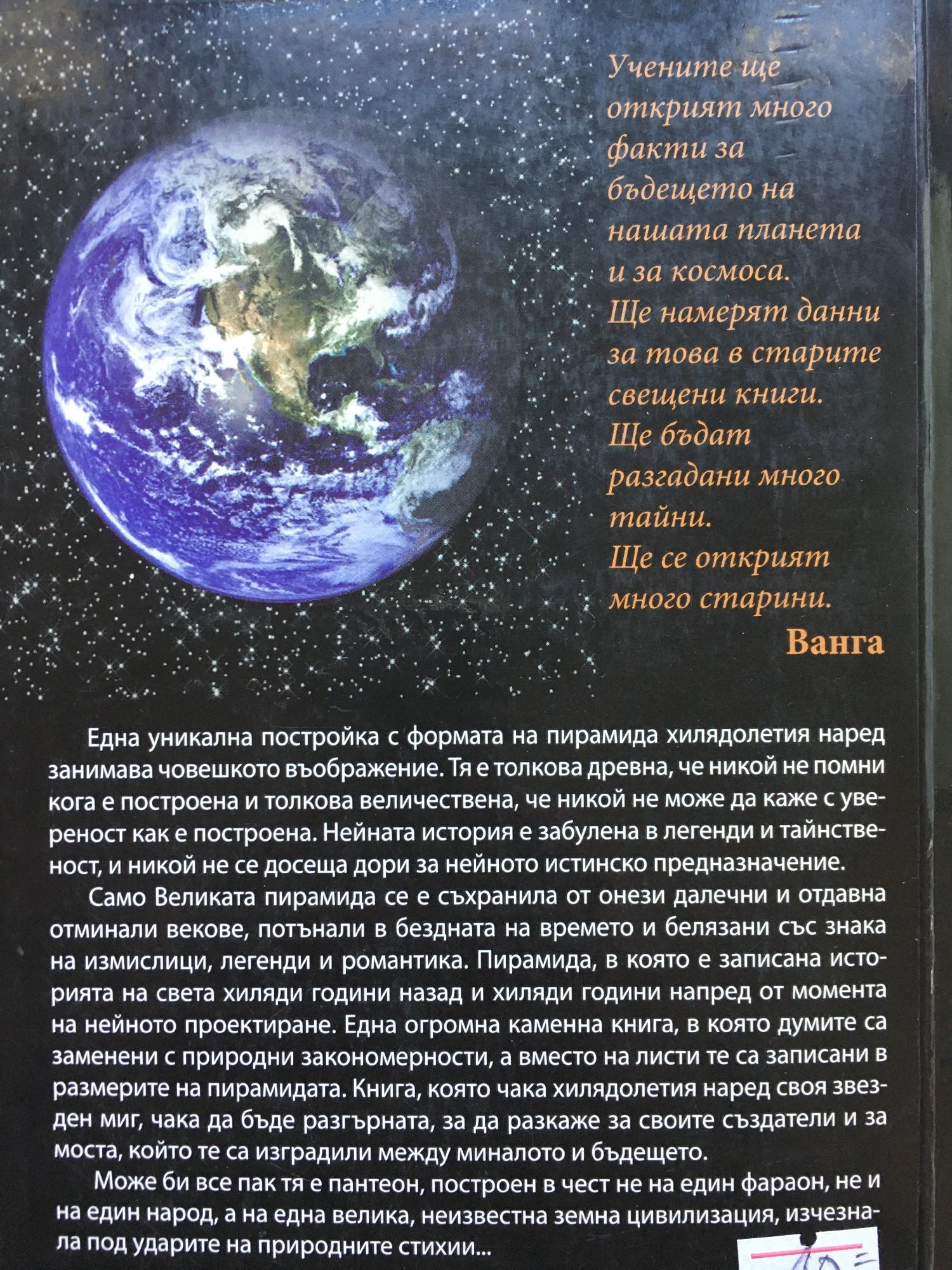 Една уникална постройка с формата на пирамида хилядолетия наред занимава човешкото въображение. Тя е толкова древна, че никой не помни кога е построена и толкова величествена, че никой не може да каже с увереност как е построена. Нейната история е забулена в легенди и тайнственост, и никой не се досеща дори за нейното истинско предназначение. Само Великата пирамида се е съхранила от онези далечни и отдавна отминали векове, потънали в бездната на времето и белязани със знака на измислици, легенди и романтика. Пирамида, в която е записана историята на света хиляди години назад и хиляди години напред от момента на нейното проектиране. Една огромна каменна книга, в която думите са заменени с природни закономерности, а вместо на листи те са записани в размерите на пирамидата. Книга, която чака хилядолетия наред своя звезден миг, чака да бъде разгърната, за да разкаже за своите създатели и за моста, който те са изградили между миналото и бъдещето. Може би все пак тя е пантеон, построен в чест не на един фараон, не и на един народ, а на една велика, неизвестна земна цивилизация, изчезнала под ударите на природните стихии.