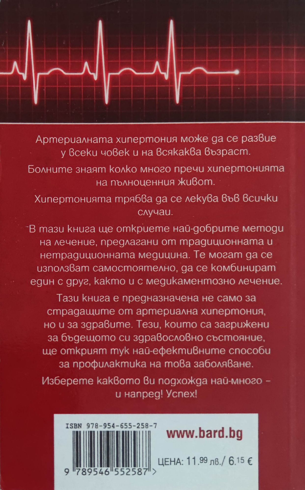 Най-добрите методи и методики при лечението на хипертоничната болест Артериалната хипертония може да се развие у всеки човек и на всякаква възраст. Болните знаят колко много пречи хипертонията на пълноценния живот. Хипертонията трябва да се лекува във всички случаи. В тази книга ще откриете най-добрите методи на лечение, предлагани от традиционната и нетрадиционната медицина. Те могат да се използват самостоятелно, да се комбинират един с друг, както и с медикаментозно лечение. Тази книга е предназначена не само за страдащите от артериална хипертония, но и за здравите. Тези, които са загрижени за бъдещото си здравословно състояние, ще открият тук най-ефективните способи за профилактика на това заболяване.