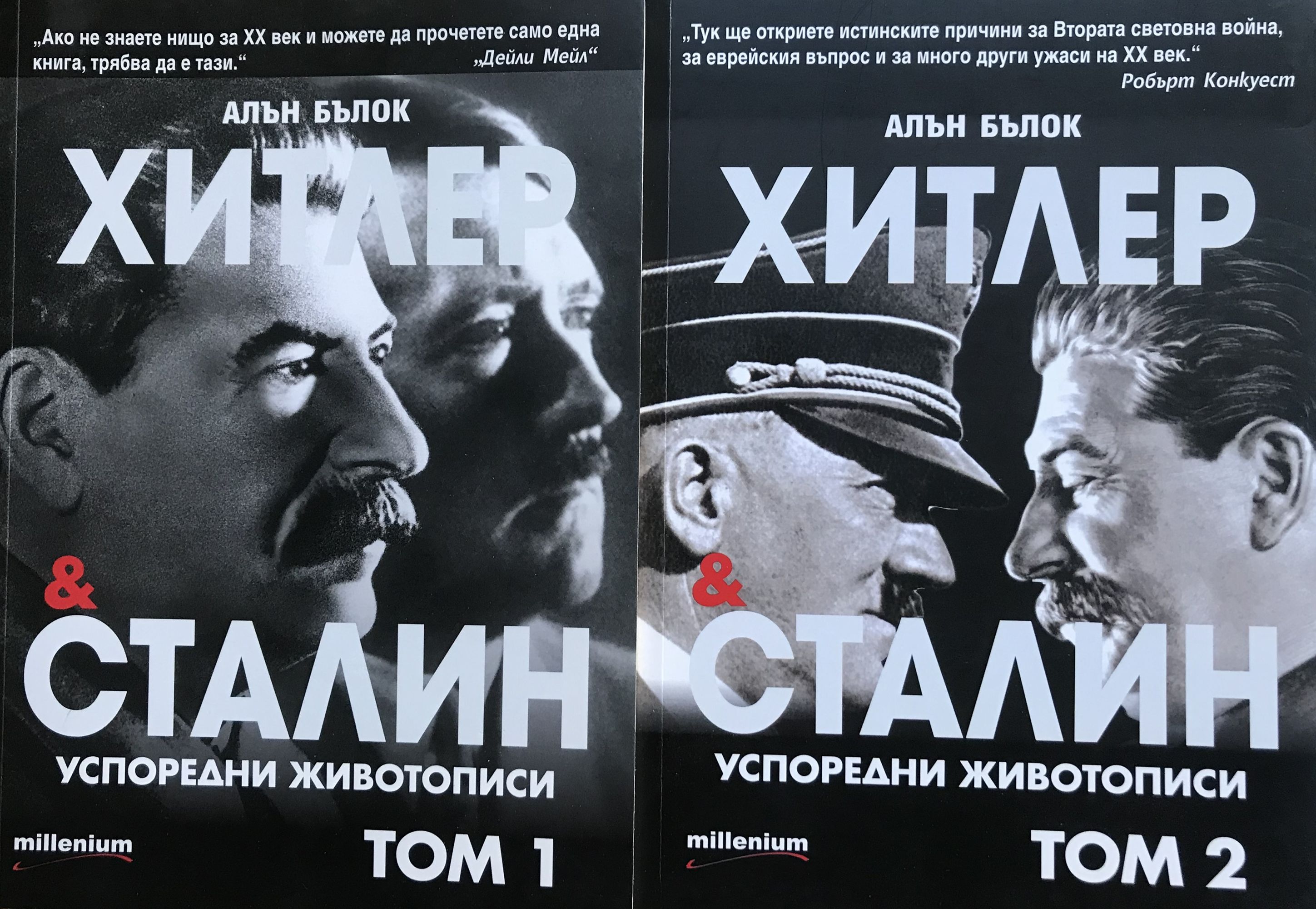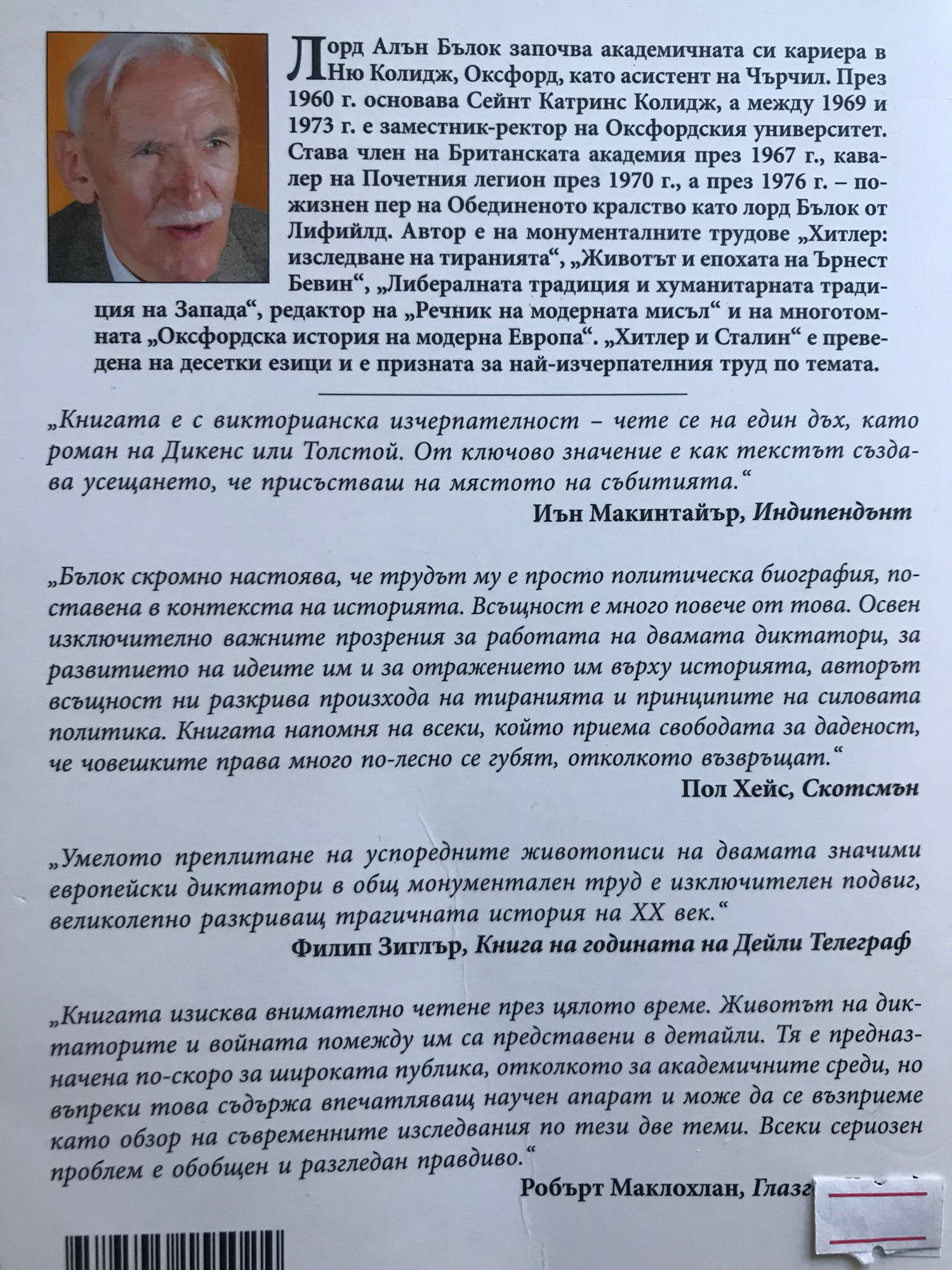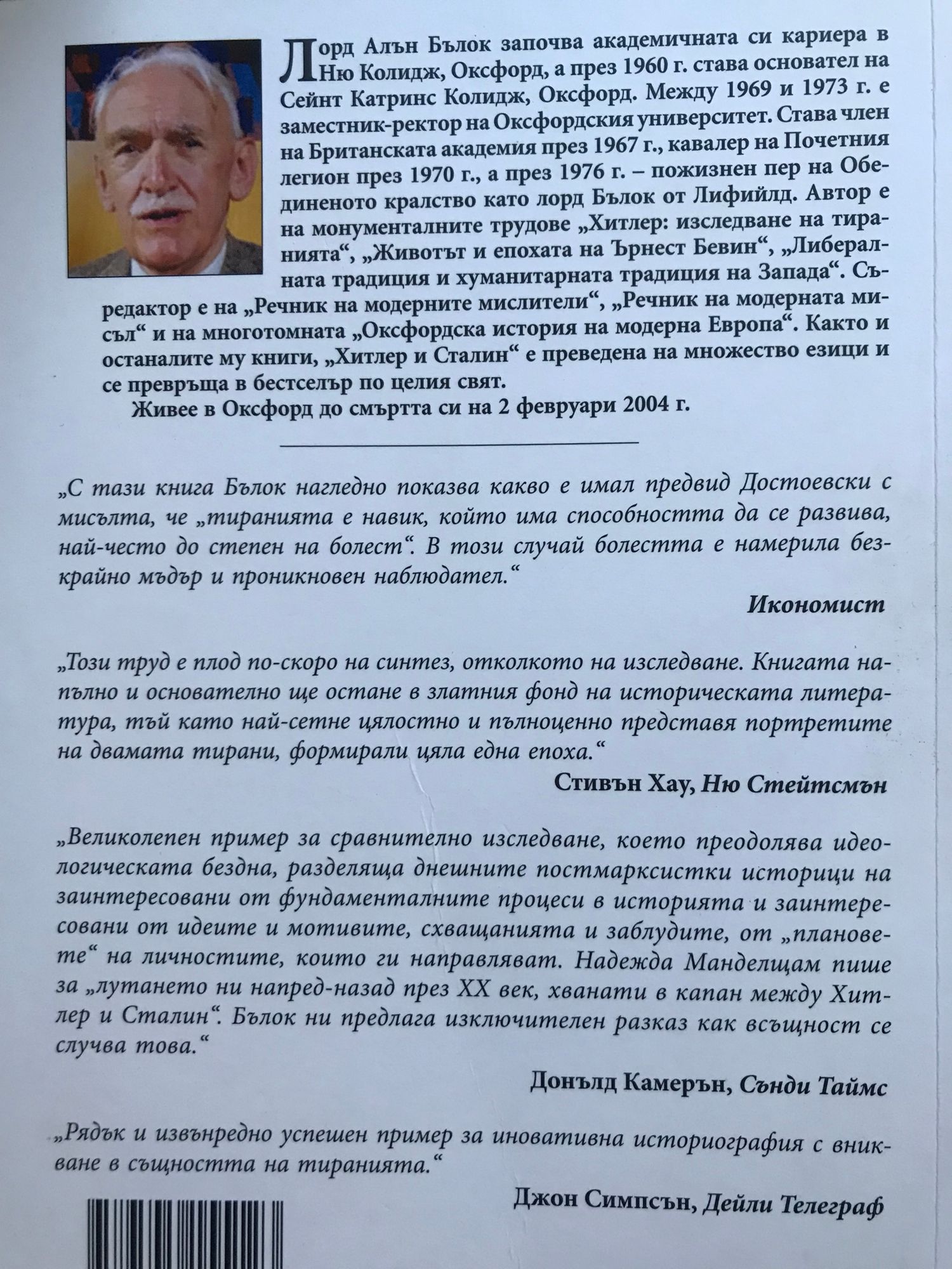 Лорд Алън Бълок започва академичната си кариера в Ню Колидж, Оксфорд, като асистент на Чърчил. През 1960 г. основава Сейнт Катринс Колидж, а между 1969 и 1973 г. е заместник-ректор на Оксфордския университет. Става член на Британската академия през 1967 г., кавалер на Почетния легион през 1970 г., а през 1976 г. - пожизнен пер на Обединеното кралство като лорд Бълок от Лифийлд. Автор е на монументалните трудове "Хитлер: изследване на тиранията", "Животът и епохата на Ърнест Бевин", "Либералната традиция и хуманитарната традиция на Запада", редактор на "Речник на модерната мисъл" и на многотомната "Оксфордска история на модерна Европа". "Хитлер и Сталин" е преведена на десетки езици и е призната за най-изчерпателния труд по темата. „Книгата е с викторианска изчерпателност – чете се на един дъх, като роман на Дикенс или Толстой. От ключово значение е как текстът създава усещането, че присъстваш на мястото на събитията.“ Иън Макинтайър, Индипендънт „Бълок скромно настоява, че трудът му е просто политическа биография, поставена в контекста на историята. Всъщност е много повече от това. Освен изключително важните прозрения за работата на двамата диктатори, за развитието на идеите им и за отражението им върху историята, авторът всъщност ни разкрива произхода на тиранията и принципите на силовата политика. Книгата напомня на всеки, който приема свободата за даденост, че човешките права много по-лесно се губят, отколкото възвръщат.“ Пол Хейс, Скотсмън „Умелото преплитане на успоредните животописи на двамата значими европейски диктатори в общ монументален труд е изключителен подвиг, великолепно разкриващ трагичната история на ХХ век.“ Филип Зиглър, Книга на годината на Дейли Телеграф „Книгата изисква внимателно четене през цялото време. Животът на диктаторите и войната помежду им са представени в детайли. Тя е предназначена по-скоро за широката публика, отколкото за академичните среди, но въпреки това съдържа впечатляващ научен апарат и може да се възприеме като обзор на съвременните изследвания по тези две теми. Всеки сериозен проблем е обобщен и разгледан правдиво.“ Робърт Маклохлан, Глазгоу Херълд „С тази книга Бълок нагледно показва какво е имал предвид Достоевски с мисълта, че „тиранията е навик, който има способността да се развива, най-често до степен на болест“. В този случай болестта е намерила безкрайно мъдър и проникновен наблюдател.“ Икономист