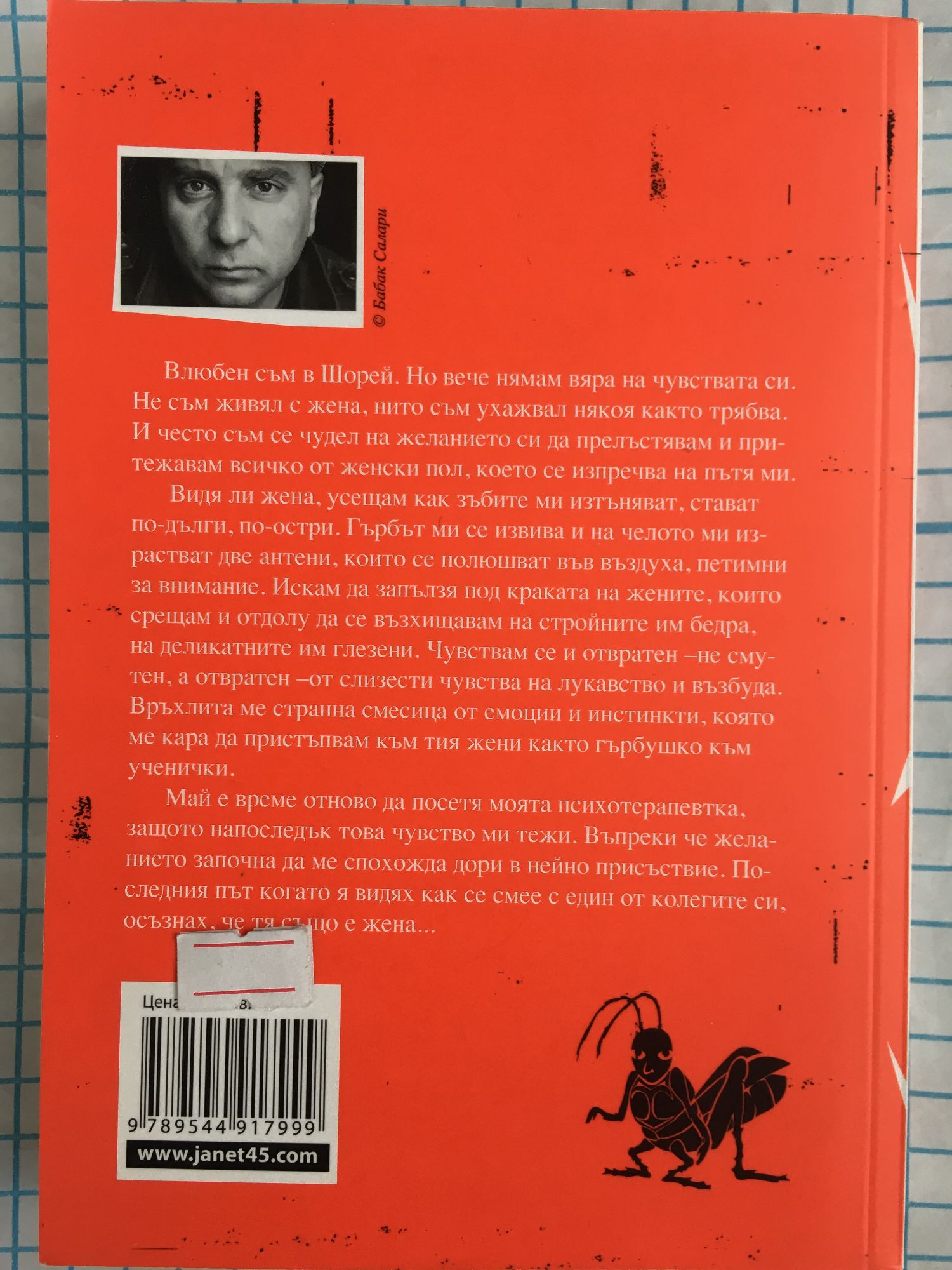 Влюбен съм в Шорей. Вече нямам вяра на чувствата си. Не съм живял с жена, нито съм ухажвал сякоя както трябва. И често съм се чудел на желанието си да прелъстявам и притежавам всичко от женски пол, което се изпречва на пътя ми. Видя ли жена, усещам как зъбите ми изтъняват, стават по-дълги, по-остри. Гърбът ми се извива и на челото ми израстват две антени, които се полюшват във въздуха, петимни за внимание. Искам да запълзя под краката на жените, които срещам и отдолу да се възхищавам на стройните им бедра, на деликатните им глезени. Чувствам се и отвратен - не смутен, а отвратен - от слизести чувства на лукавство и възбуда. Връхлита ме странна смесица от емоции и инстинкти, която ме кара да пристъпвам към тия жени както гърбушко към ученички. Май е време отново да посетя моята психотерапевтка, защото напоследък това чувство ми тежи. Въпреки че желанието започна да ме спохожда дори в нейно присъствие. Последния път, когато я видях как се смее с един от колегите си, осъзнах, че тя също е жена...
