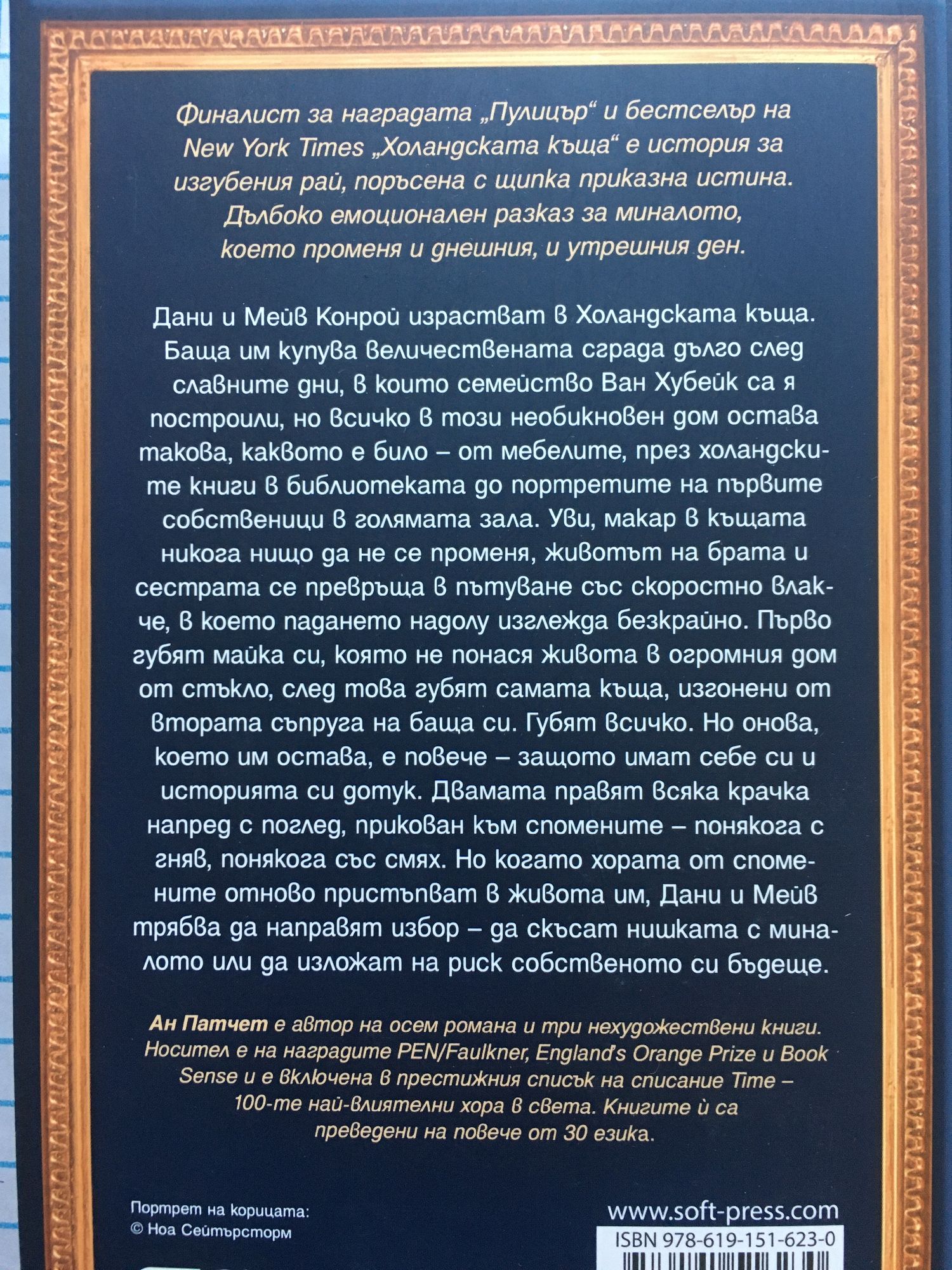 Финалист за наградата „Пулицър” u бестселър на New York Times „Холандската къща” е история за изгубения рай, поръсена с щипка приказна истина. Дълбоко емоционален разказ за миналото, което променя и днешния, и утрешния ден. Дани и Мейв Конрой израстват в Холандската къща. Баща им купува величествената сграда дълго след славните дни, в които семейство Ван Хубейк са я построили, но всичко в този необикновен дом остава такова, каквото е било – от мебелите, през холандските книги в библиотеката до портретите на първите собственици в голямата зала. Уви, макар в къщата никога нищо да не се променя, животът на брата и сестрата се превръща в пътуване със скоростно влакче, в което падането надолу изглежда безкрайно. Първо губят майка си, която не понася живота в огромния дом от стъкло, след това губят самата къща, изгонени от втората съпруга на баща си. Губят всичко. Но онова, което им остава, е повече – защото имат себе си и историята си дотук. Двамата правят всяка крачка напред с поглед, прикован към спомените – понякога с гняв, понякога със смях. Но когато хората от спомените отново пристъпват в живота им, Дани и Мейв трябва да направят избор – да скъсат нишката с миналото или да изложат на риск собственото си бъдеще. Ан Патчет е автор на осем романа и три нехудожествени книги. Носител е на наградите PEN/Faulkner, England’s Orange Prize и Book Sense и е включена в престижния списък на списание Time – 100-те най-влиятелни хора в света. Книгите ѝ са преведени на повече от 30 езика.